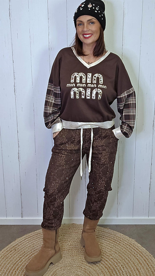 Amalie brune bukser med blonde og shimmer