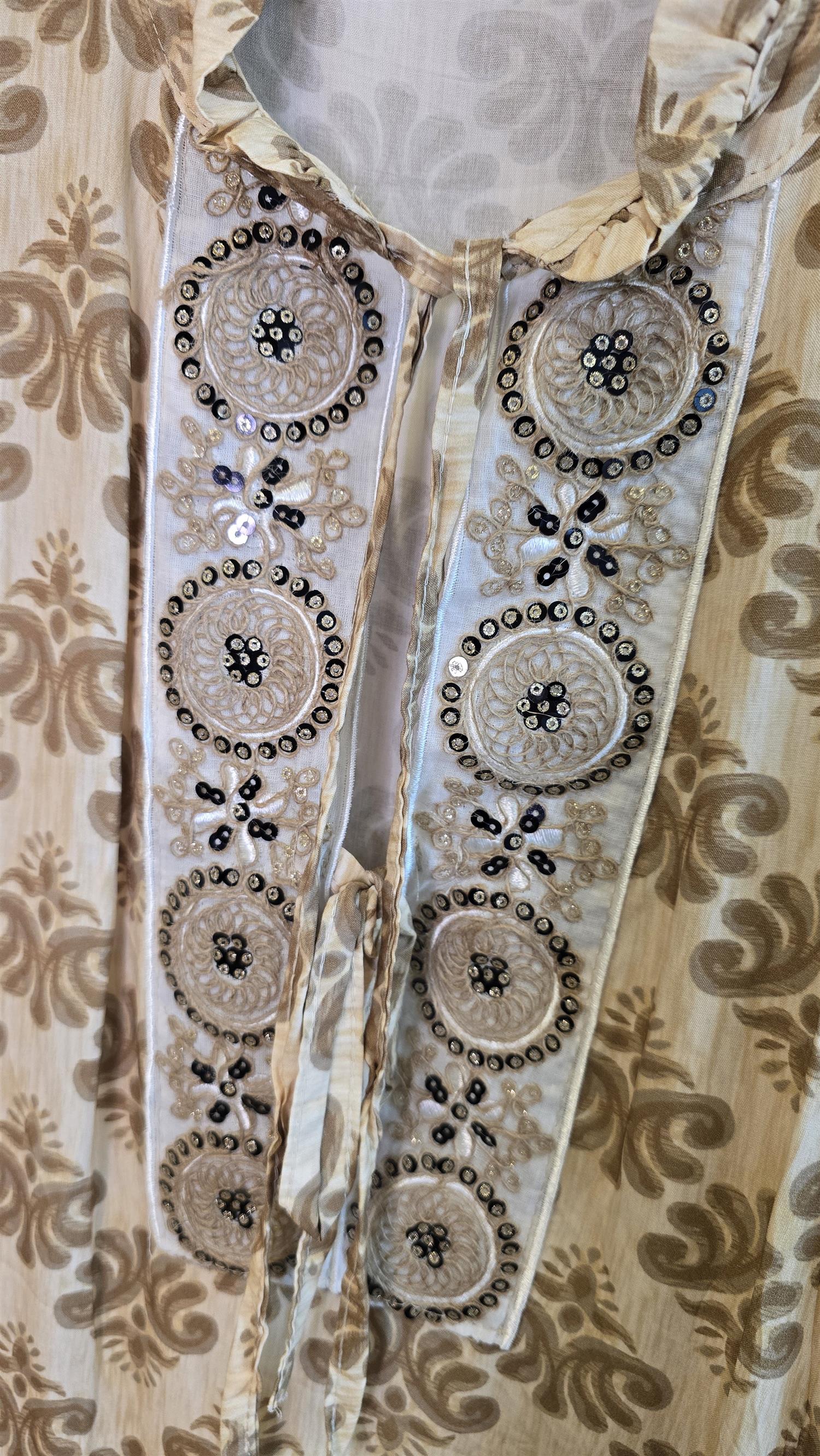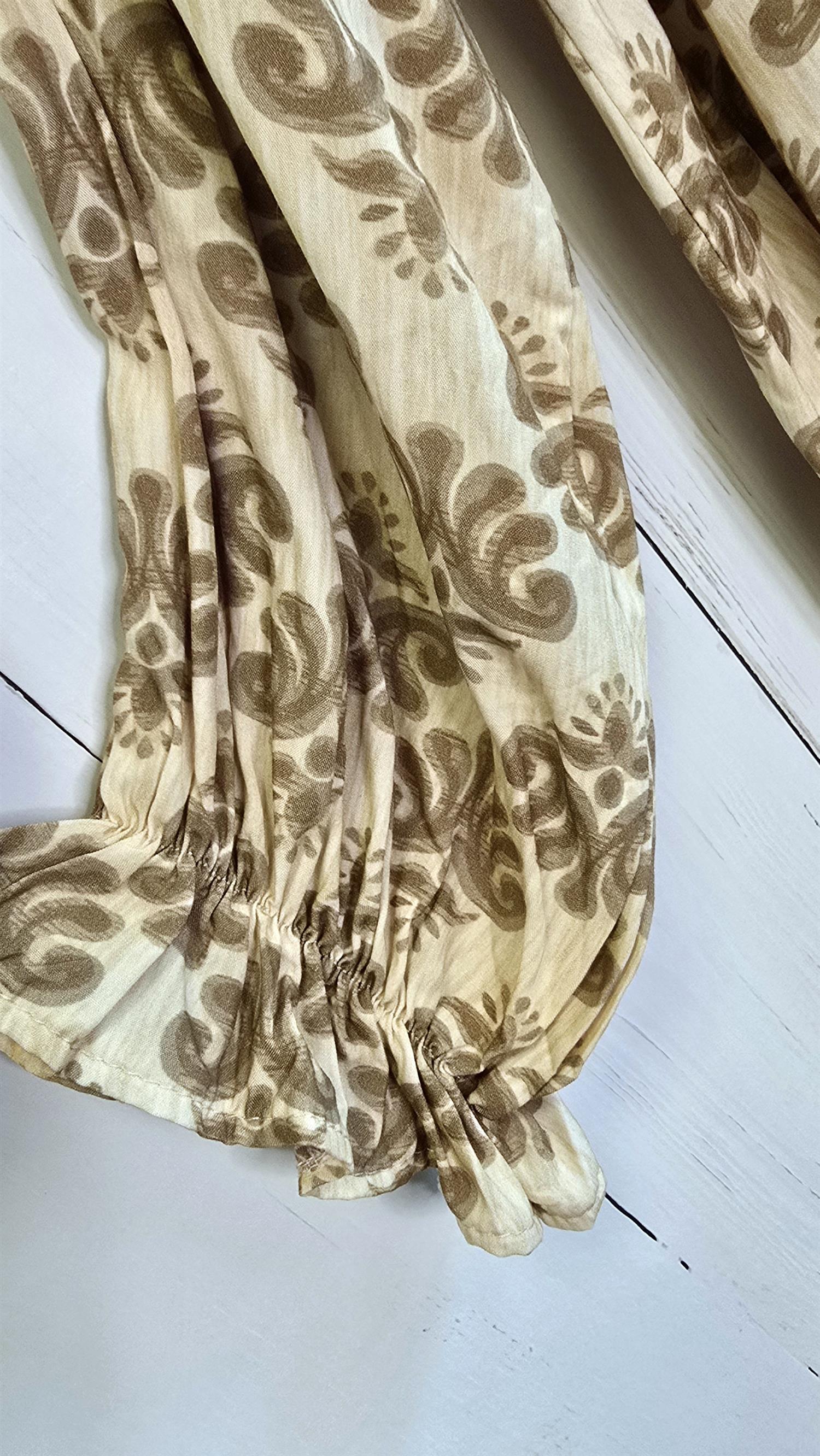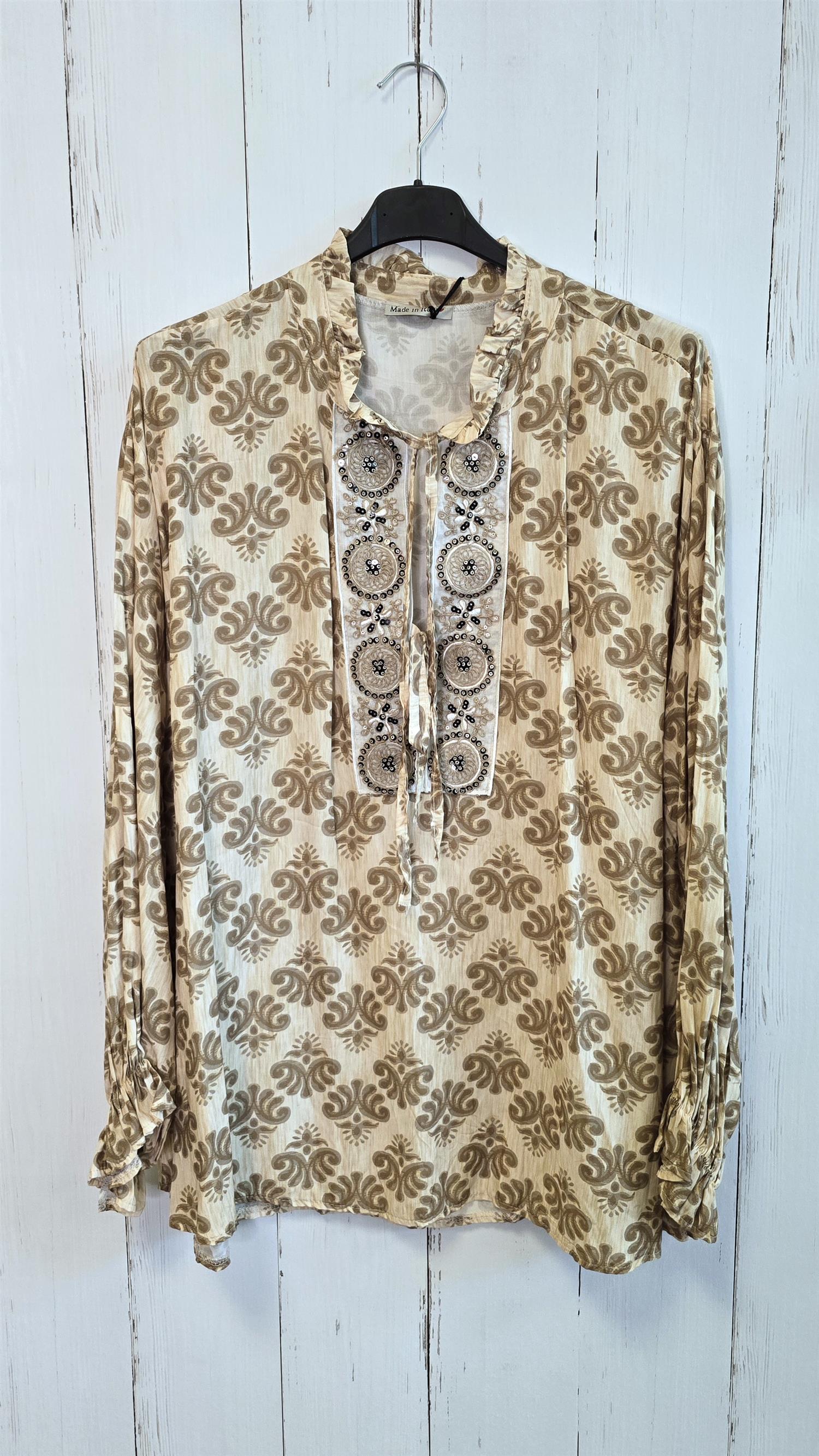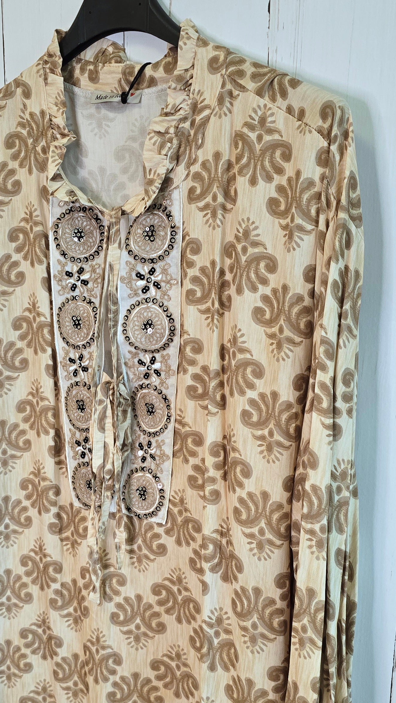 En nydelig bluse i kamelbeige print med delikate paljetter i fronten. Den har vid hals med vakker snøringsdetalj og lange ermer. Nederst på ermen har blusen en liten volangkant med strikk som gir en feminin og flatterende avslutning. Laget i 100 % viskose som føles myk og behagelig mot huden.