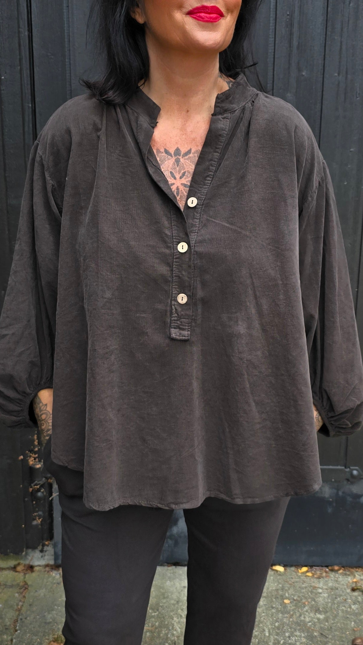 Snygg bluse I minicord. Knappar I halsen. Fin puffig arm med strikk nederst. Litt kortare armlängde. Längre bak. Fin vidde.