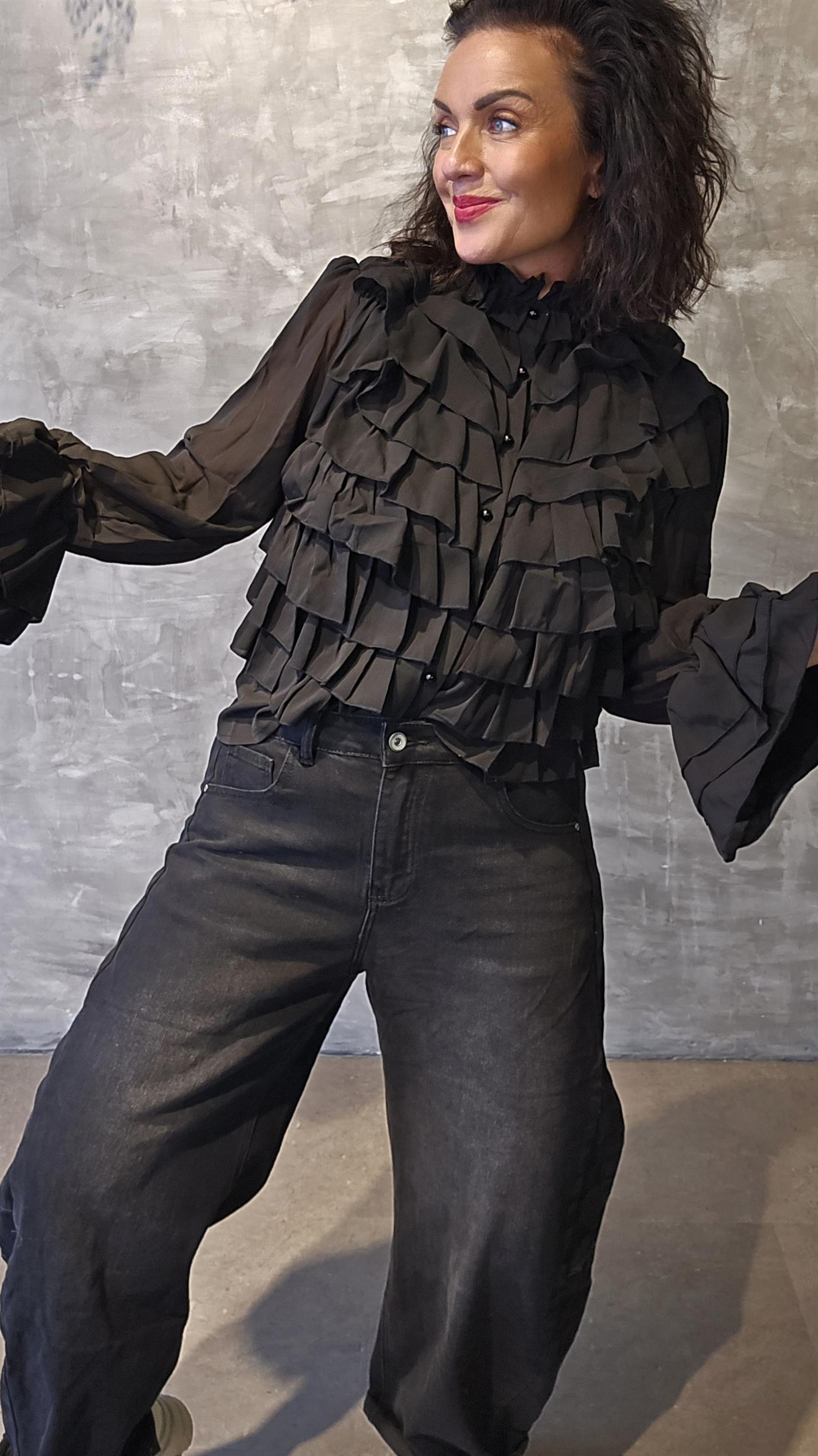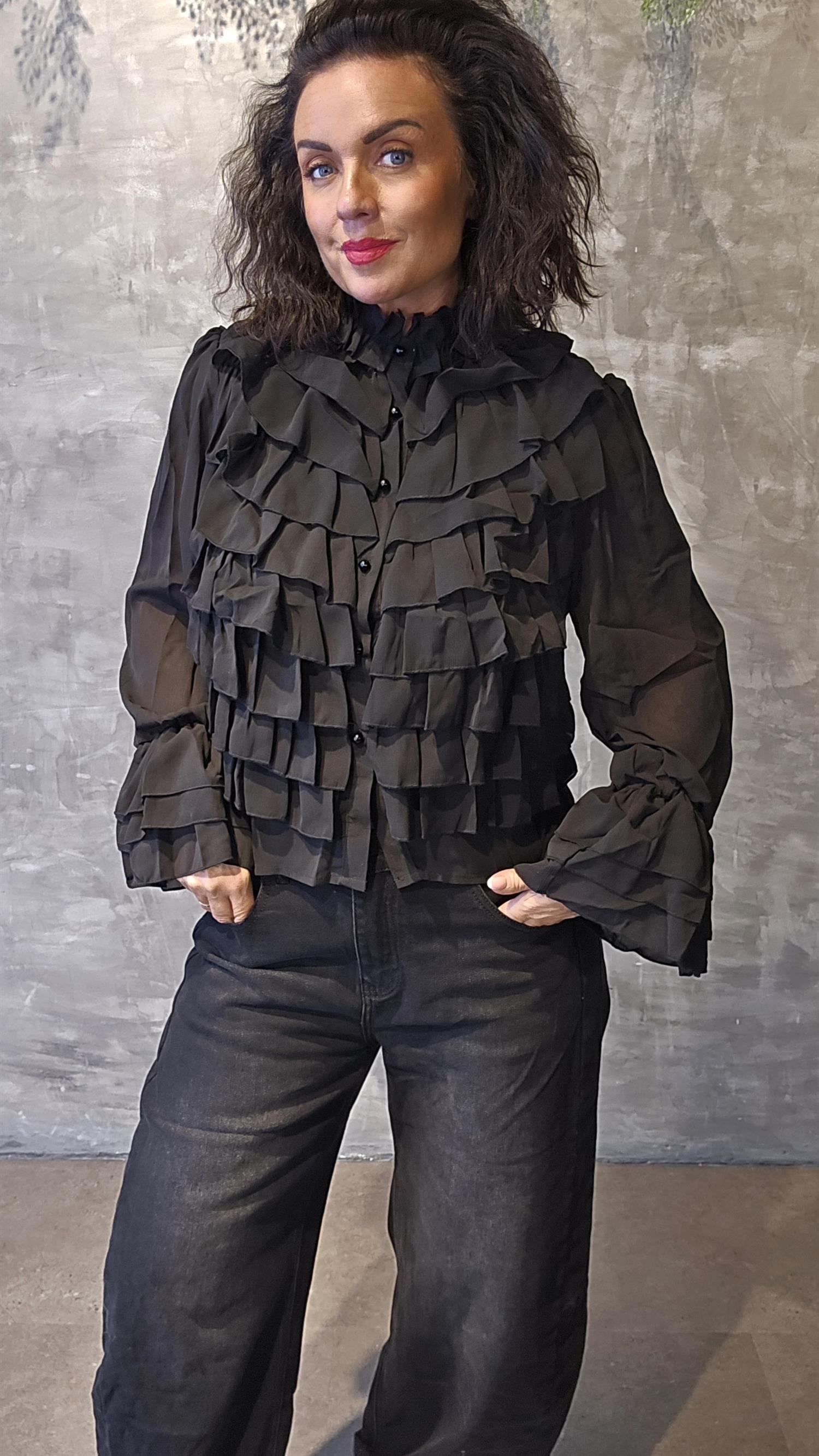 Snygg chiffong bluse/skjorta med massa volanger I front. Kan knäppas helt upp I halsen. Långa armar med extra stor volang nederst.