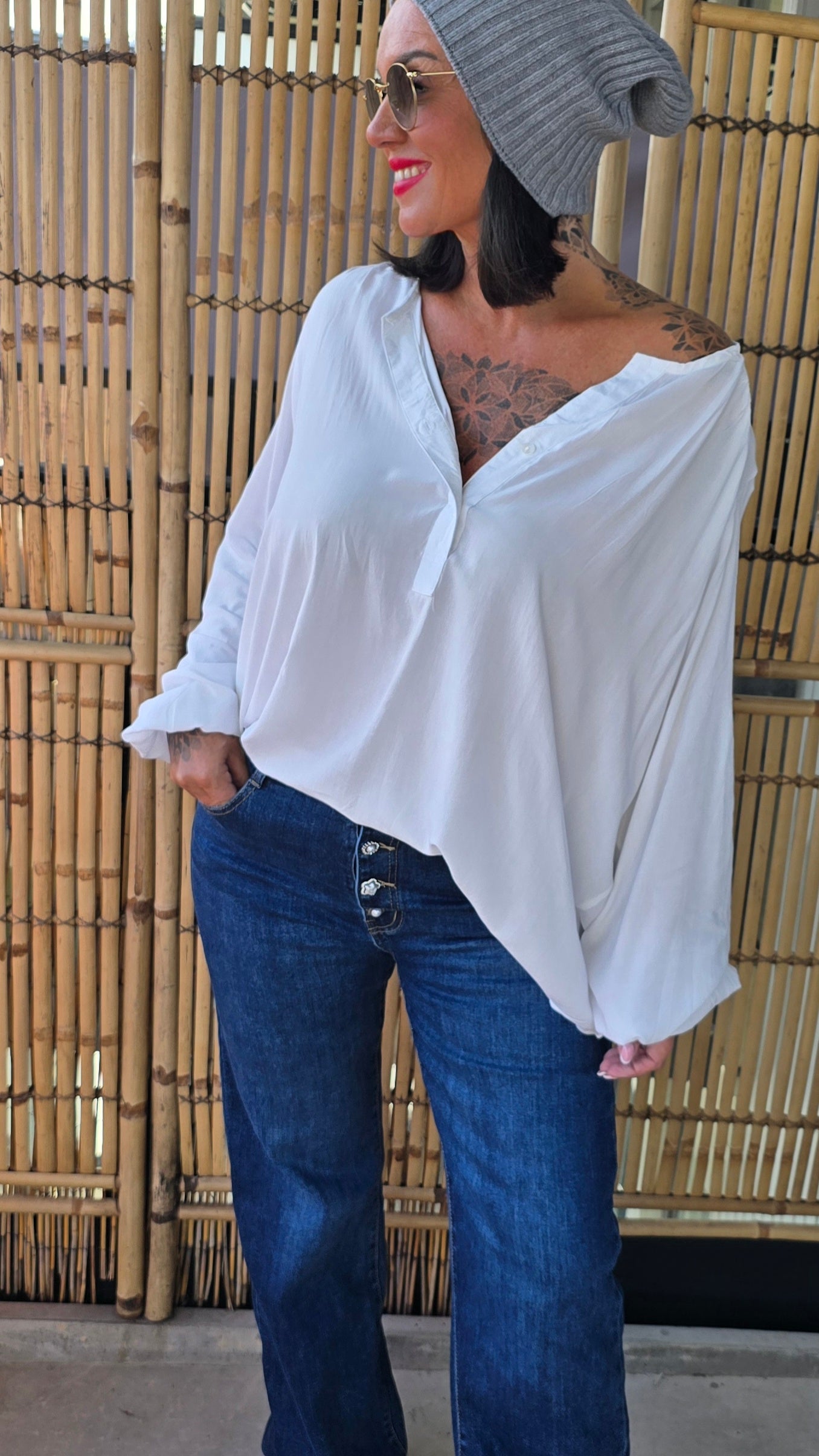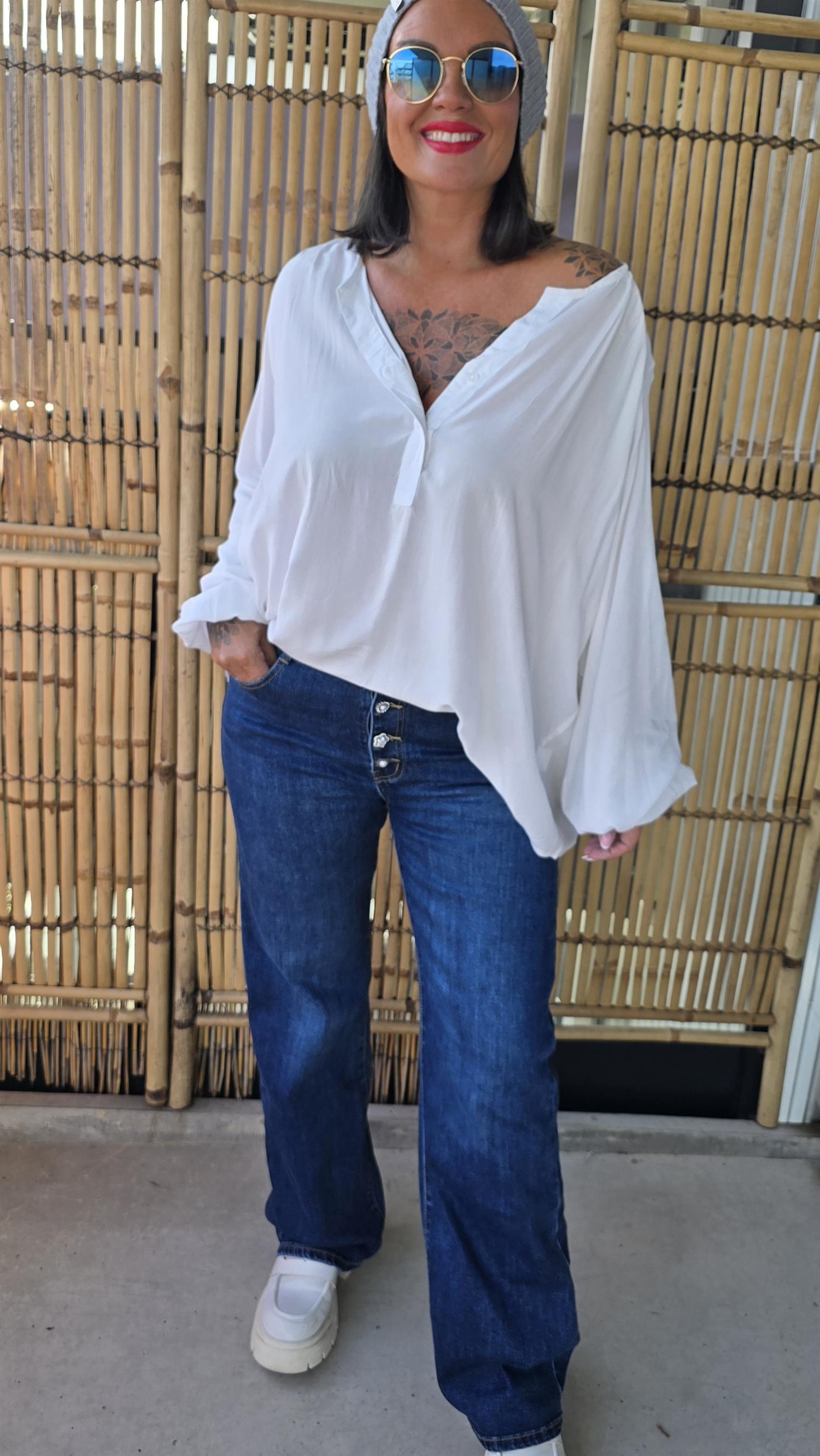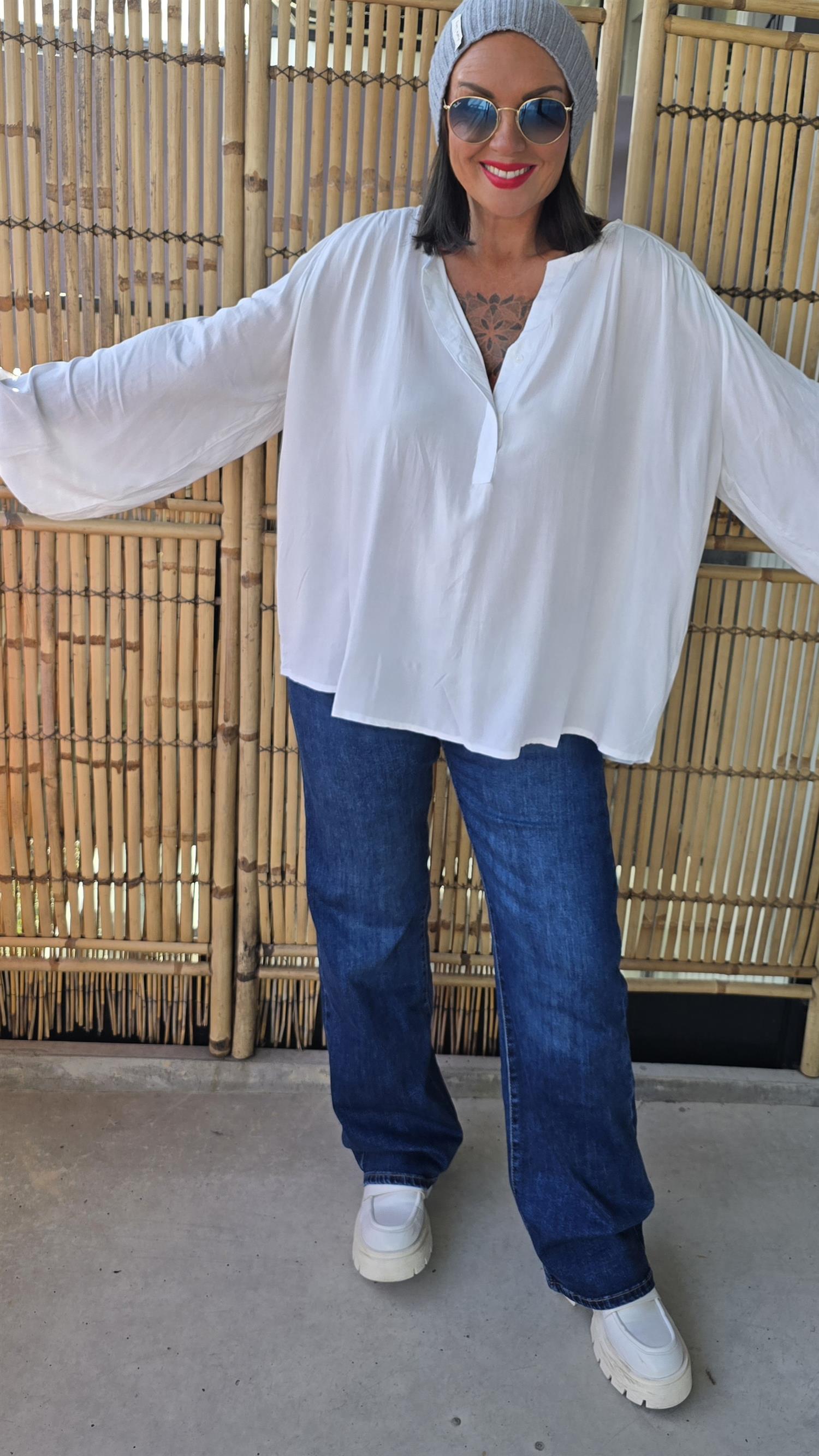 Så snygg skjorte bluse med extra god vidde. Så fin på. Långa puffiga armar med strikk nederst. Blusen faller läckert i ryggen. Knappar I halsen.