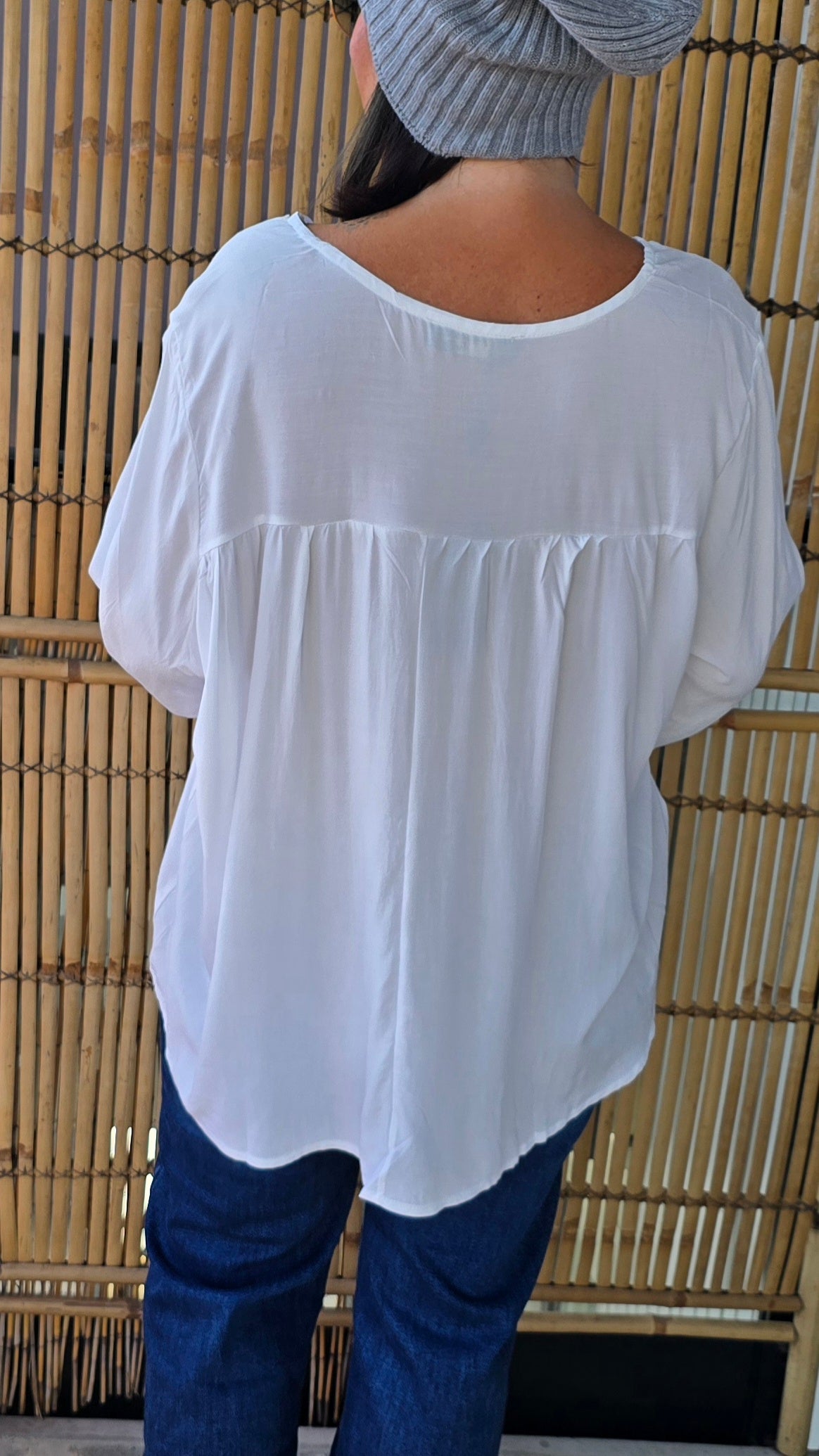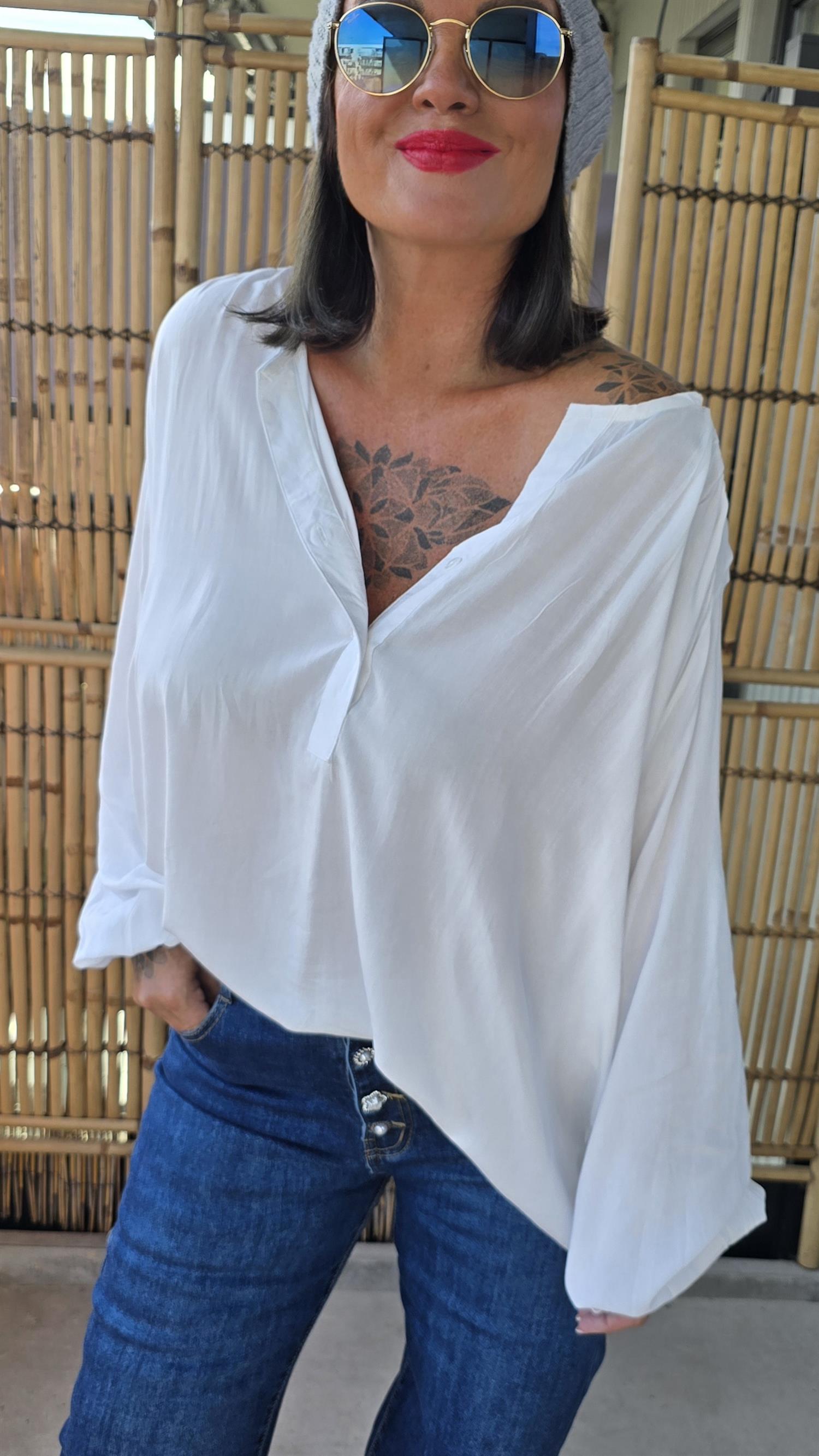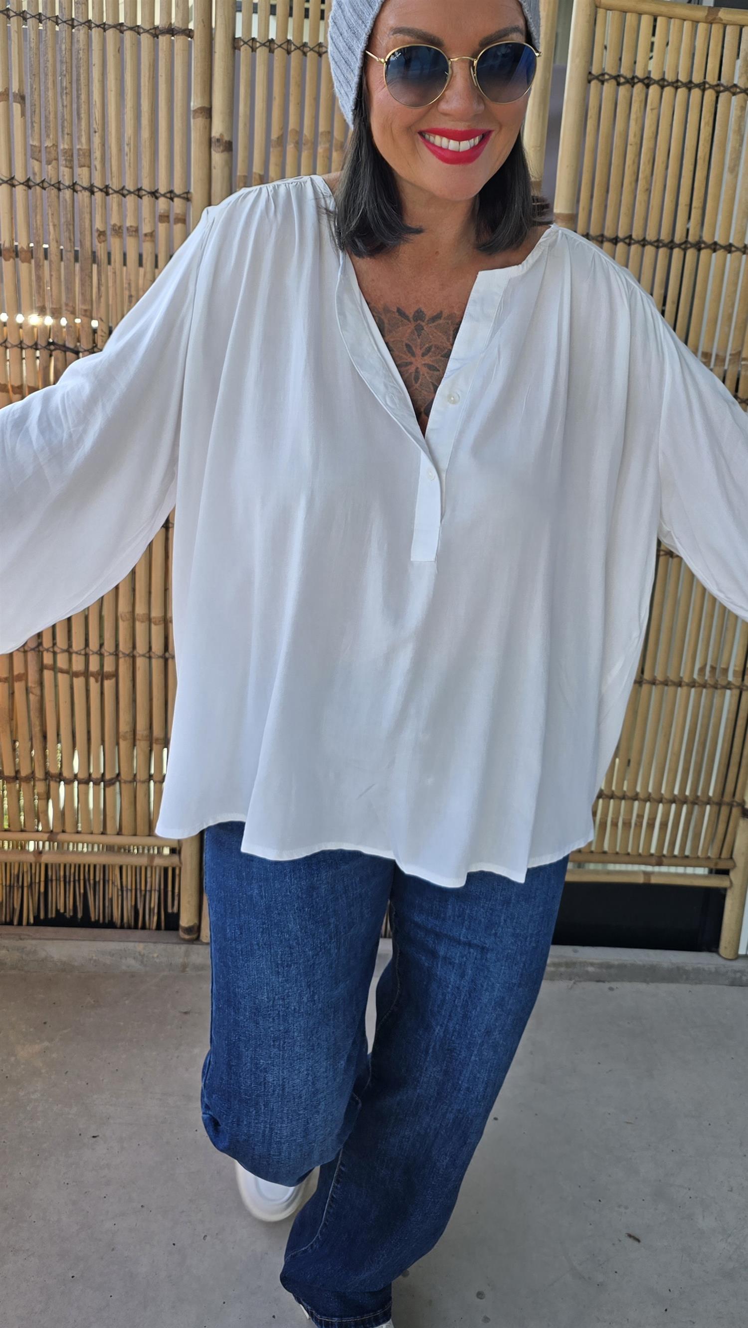 Så snygg skjorte bluse med extra god vidde. Så fin på. Långa puffiga armar med strikk nederst. Blusen faller läckert i ryggen. Knappar I halsen.