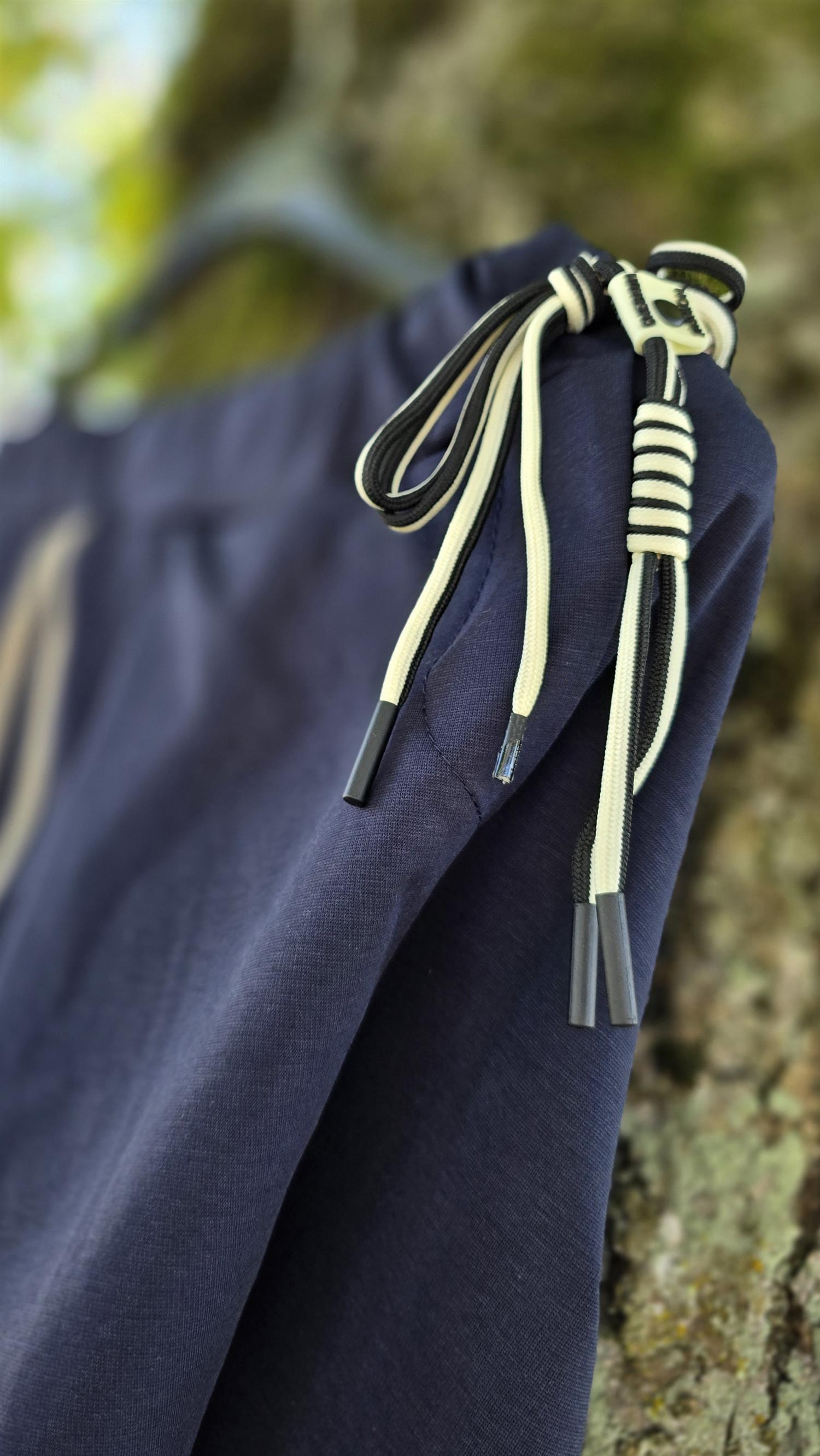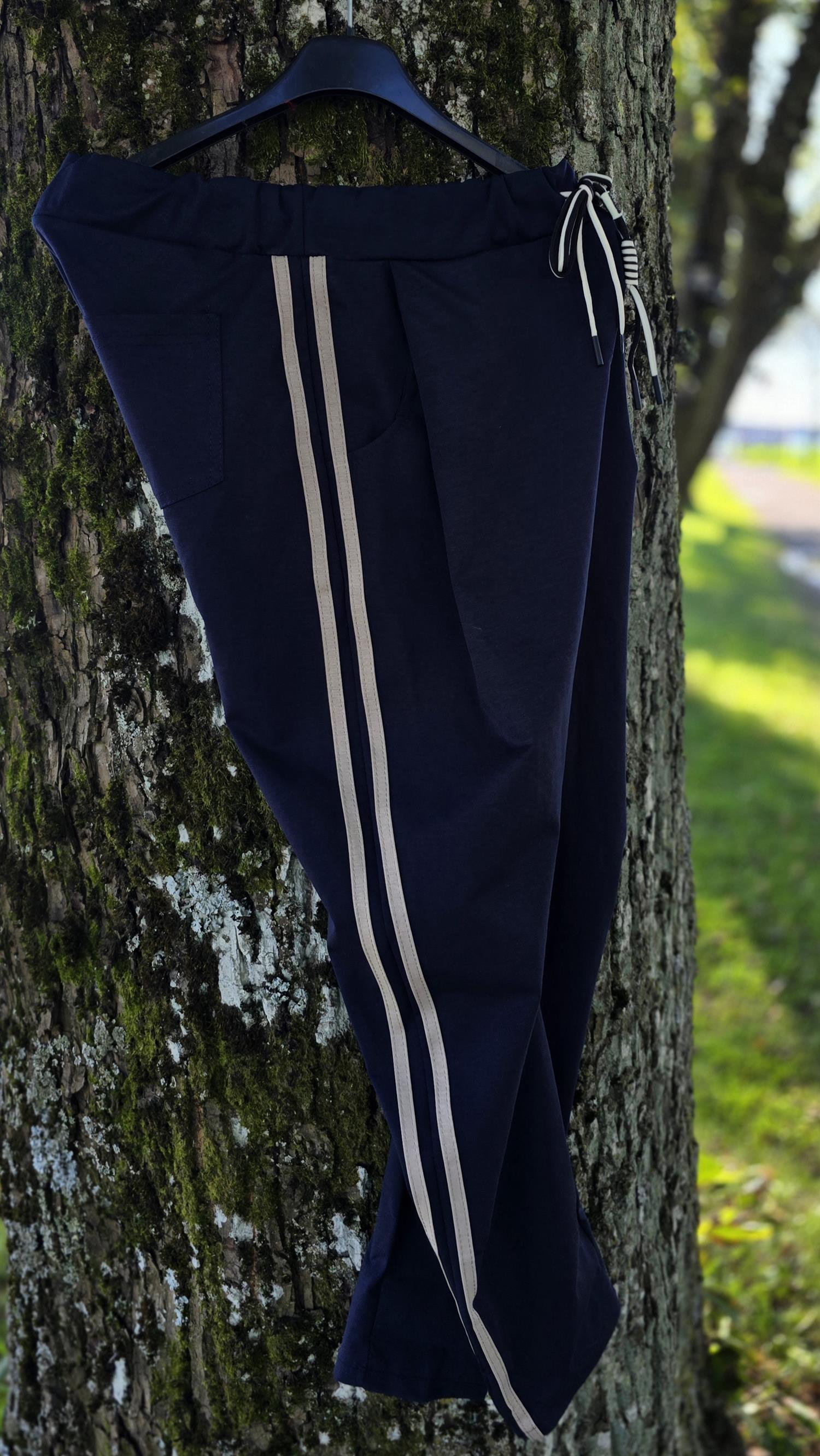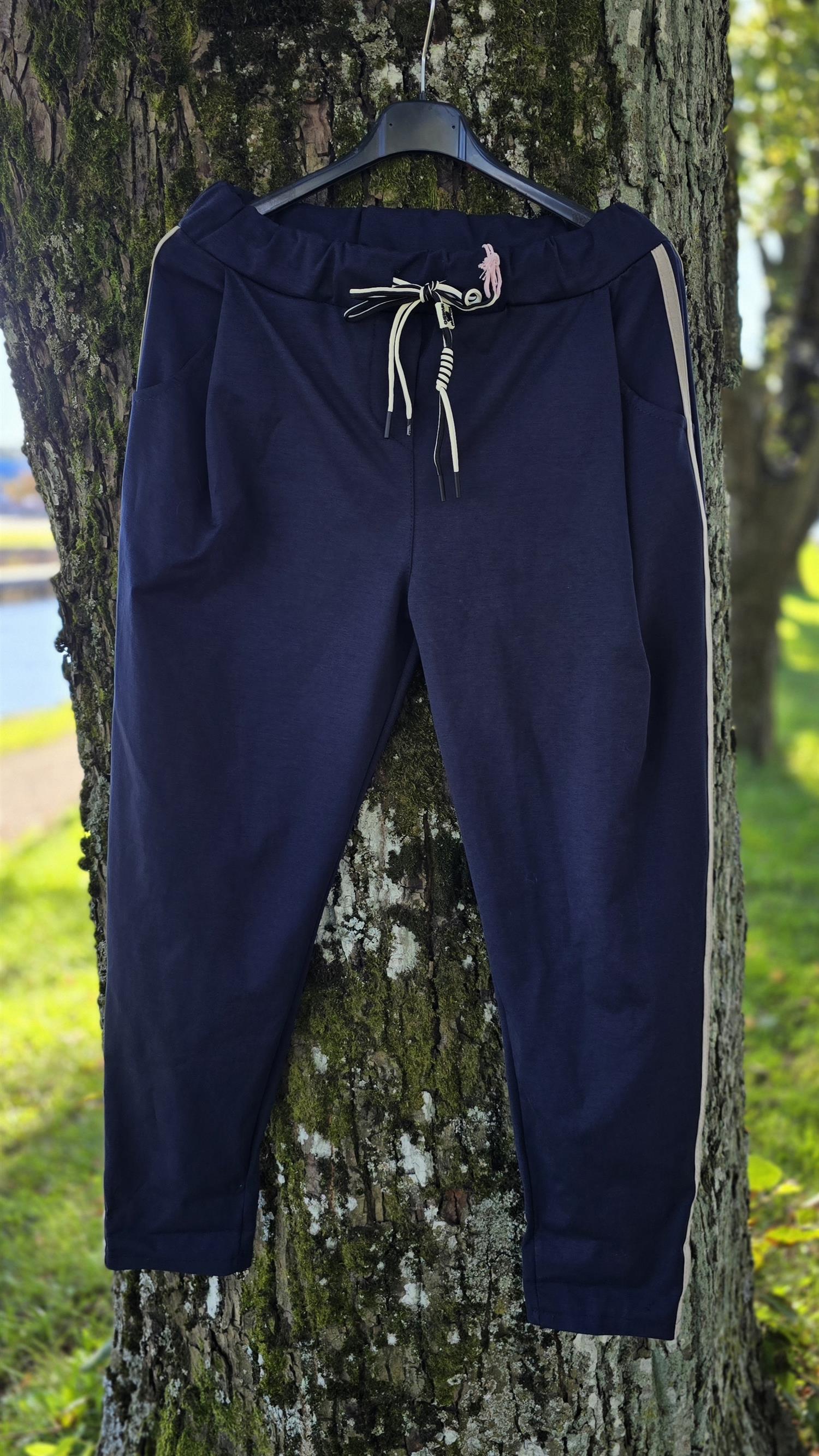 En deilig og komfortabel bukse i myk viskoseblanding. Den har en mørkeblå, nesten navy farge, med kule mørkbeige striper på sidene. Midjen har snøring i doble lisser i svart og hvitt/beige som gir et sporty preg. Den fine fasongen og strikken i livet gjør buksen behagelig og lett å bruke både til hverdags og fritid.