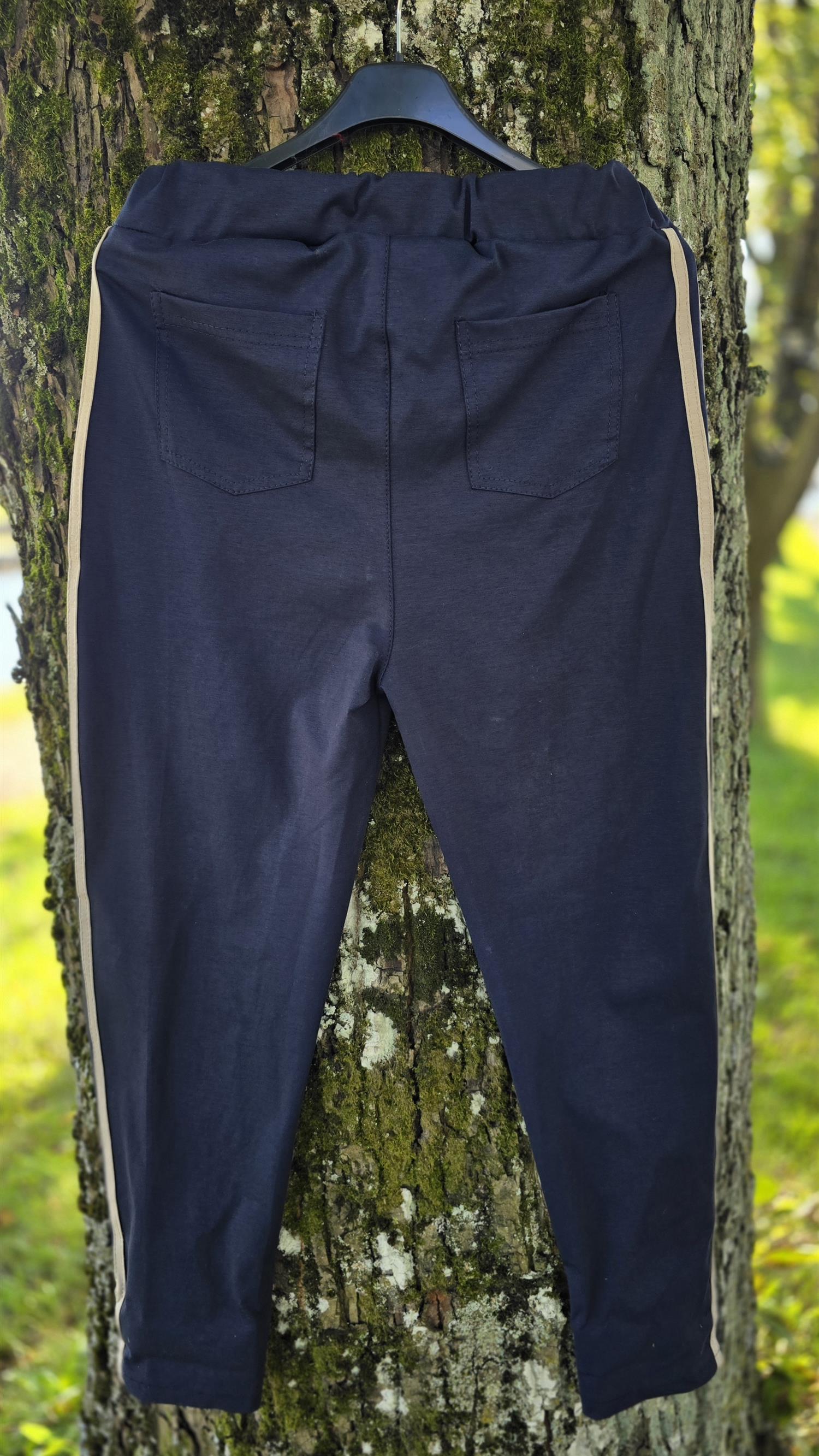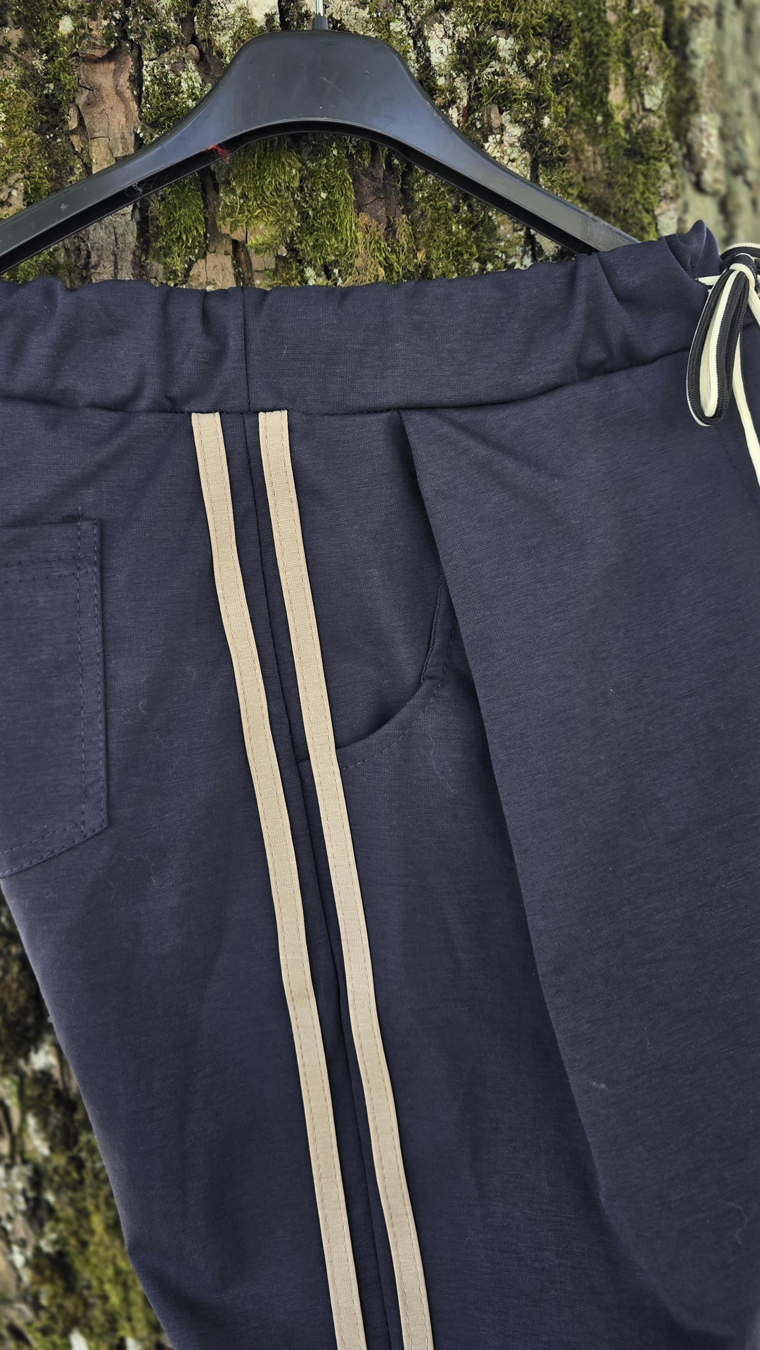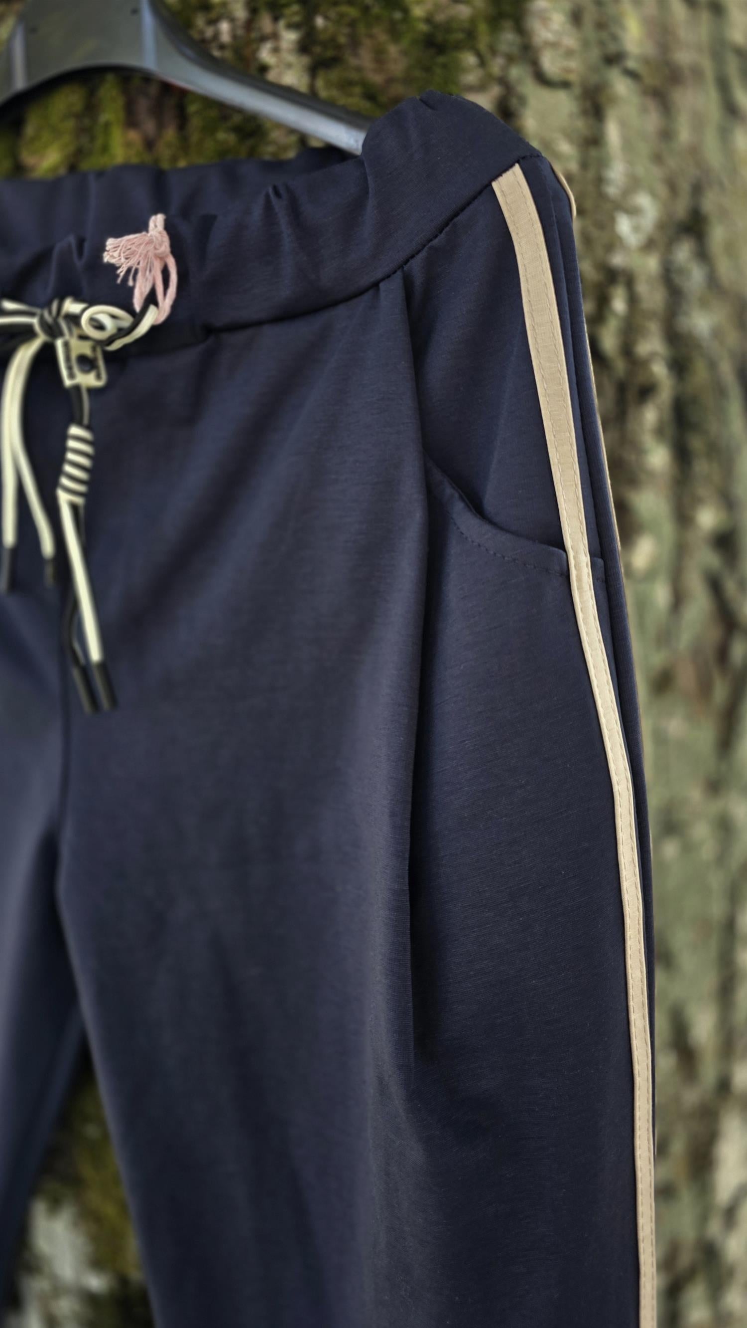 En deilig og komfortabel bukse i myk viskoseblanding. Den har en mørkeblå, nesten navy farge, med kule mørkbeige striper på sidene. Midjen har snøring i doble lisser i svart og hvitt/beige som gir et sporty preg. Den fine fasongen og strikken i livet gjør buksen behagelig og lett å bruke både til hverdags og fritid.
