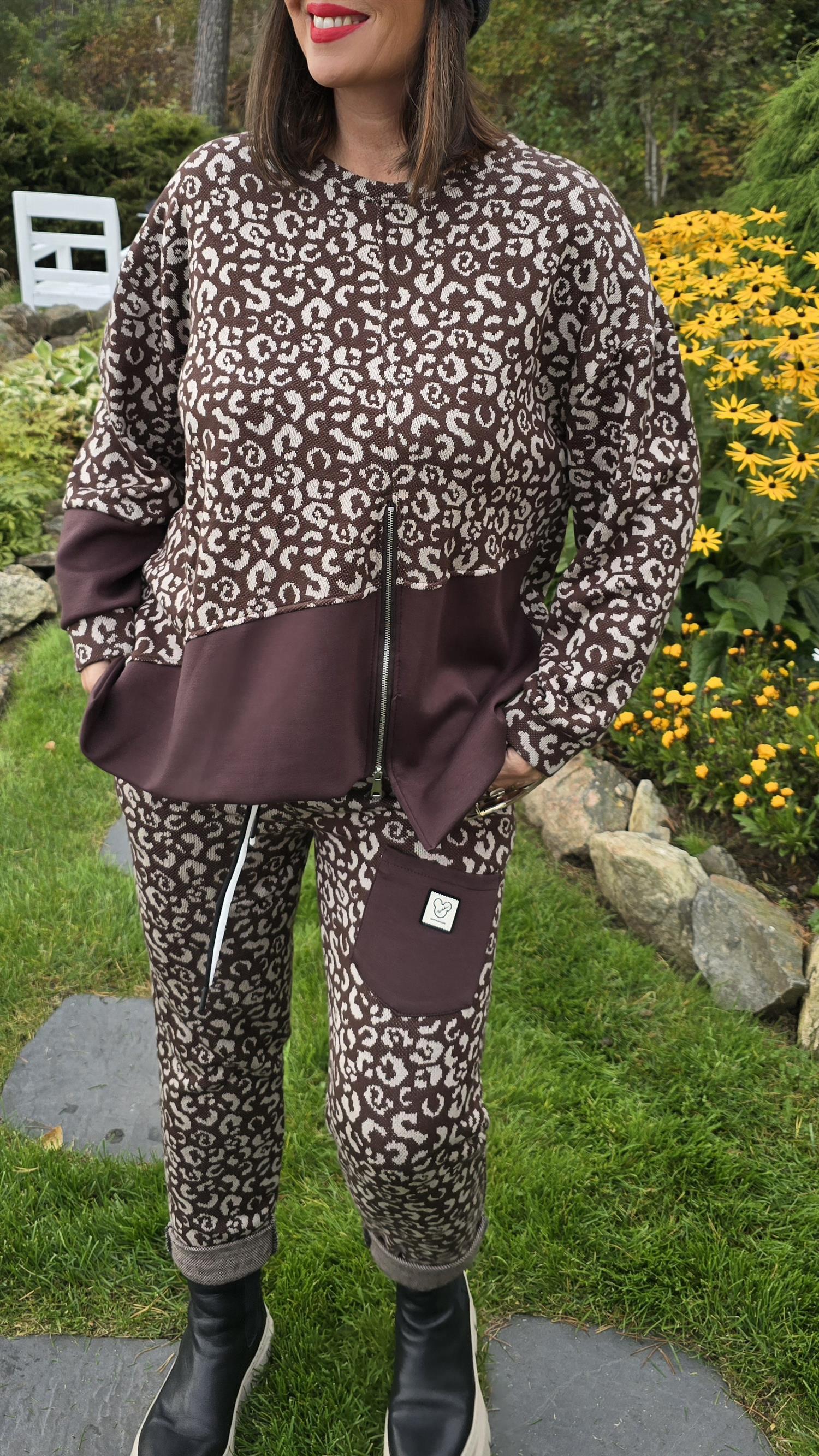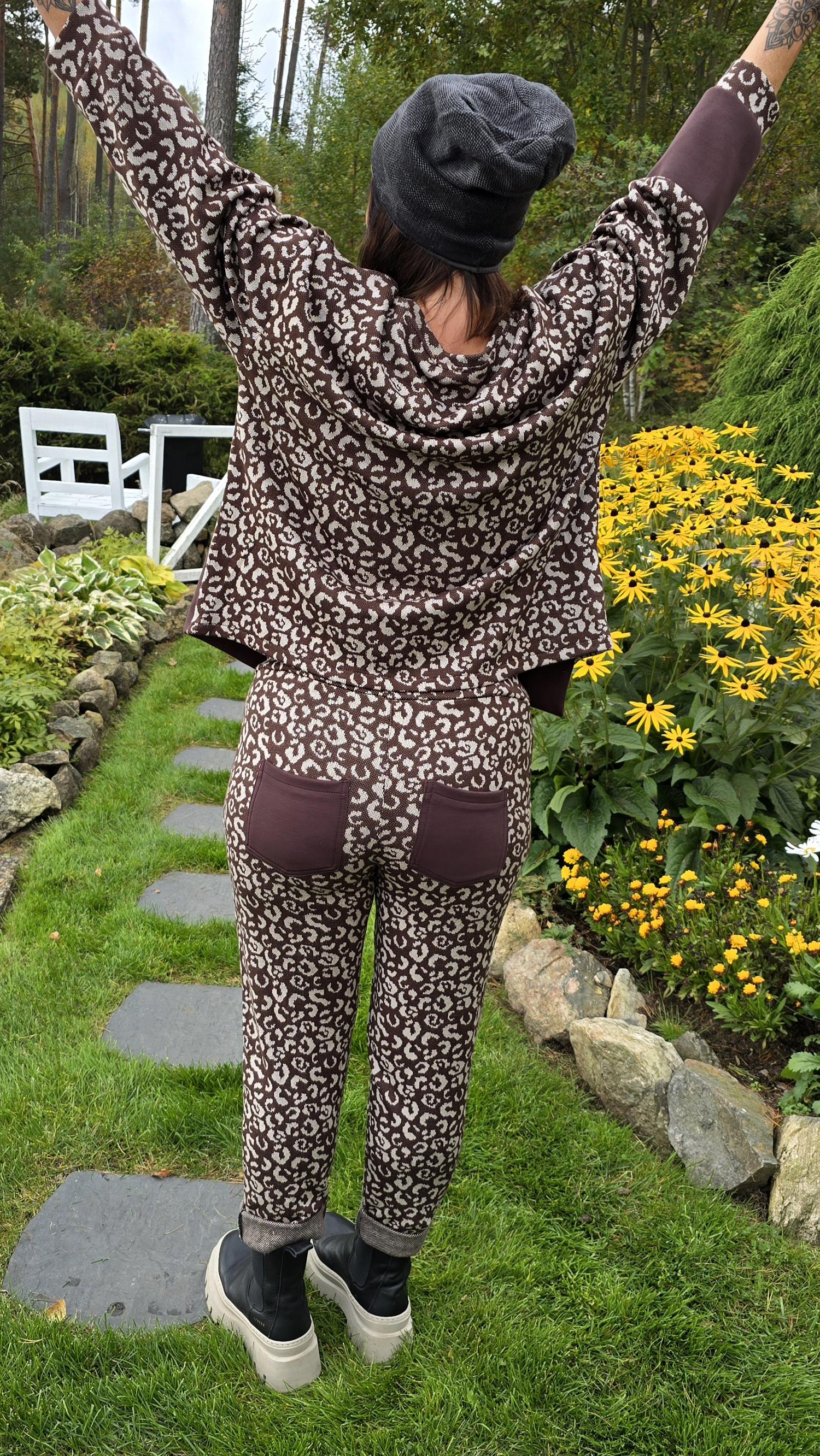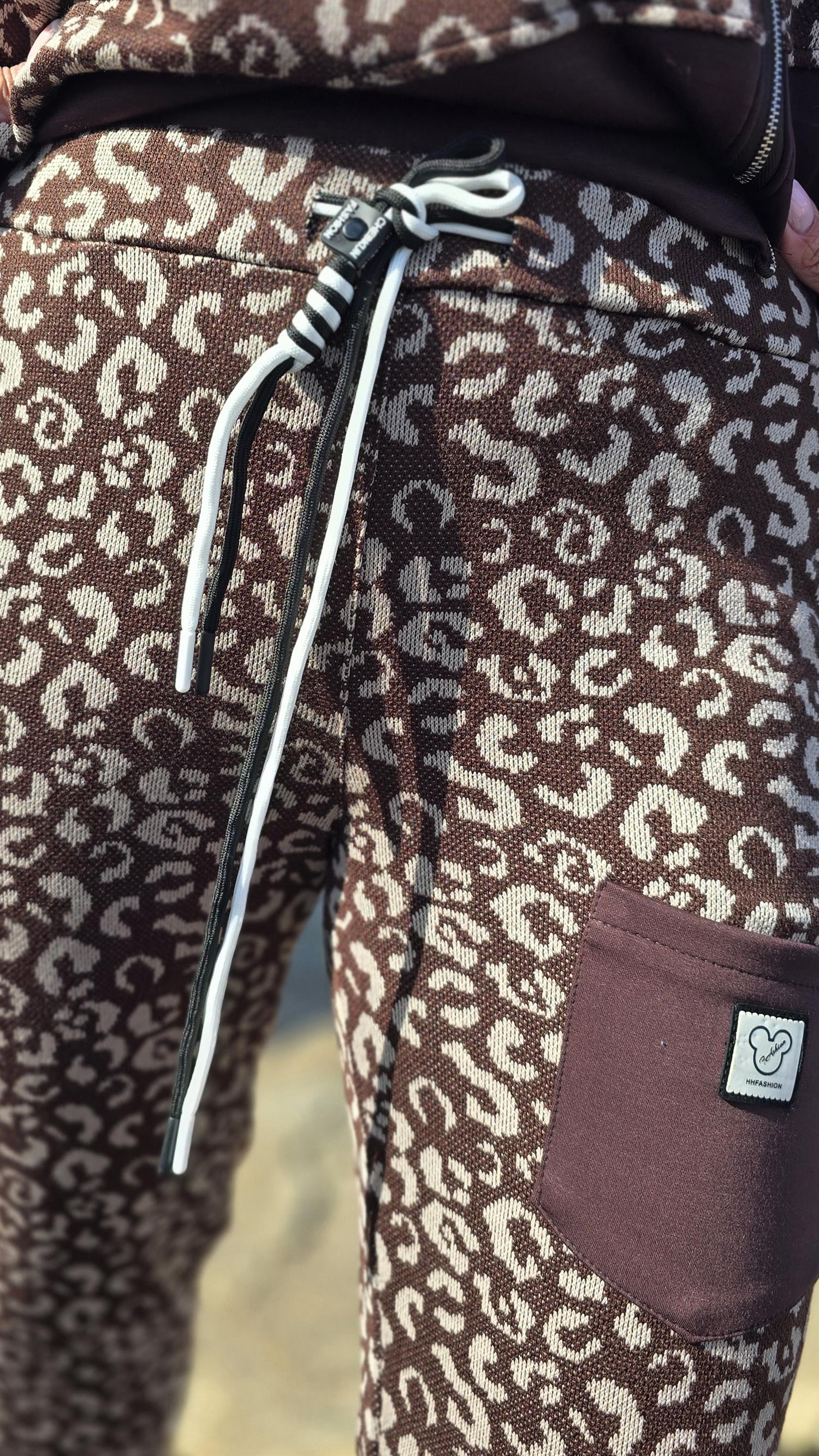 En komfortabel bukse i tynn strikket kvalitet, i en dyp brunfarge med et unikt grafisk leomønster. Den har praktiske lommer i front, en ekstra lomme nedover på låret med motiv, samt lommer bak. Midjen har strikk og spesielle doble snøringer i svart og hvitt som skiller seg ut og gir et sporty preg. Buksen har rette ben uten strikk nederst, noe som gjør den lett å style både til sneakers og boots.