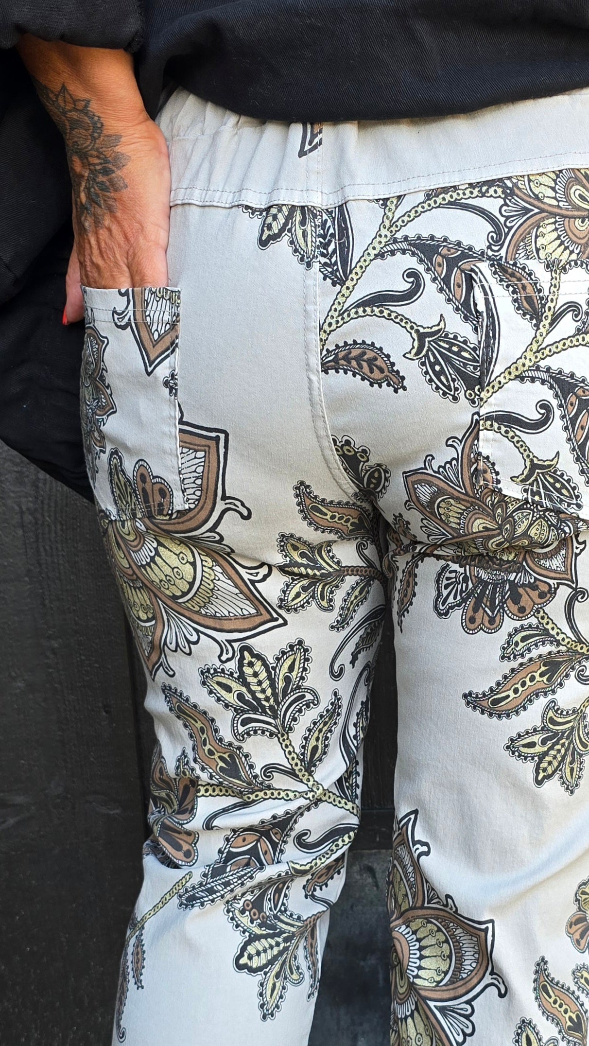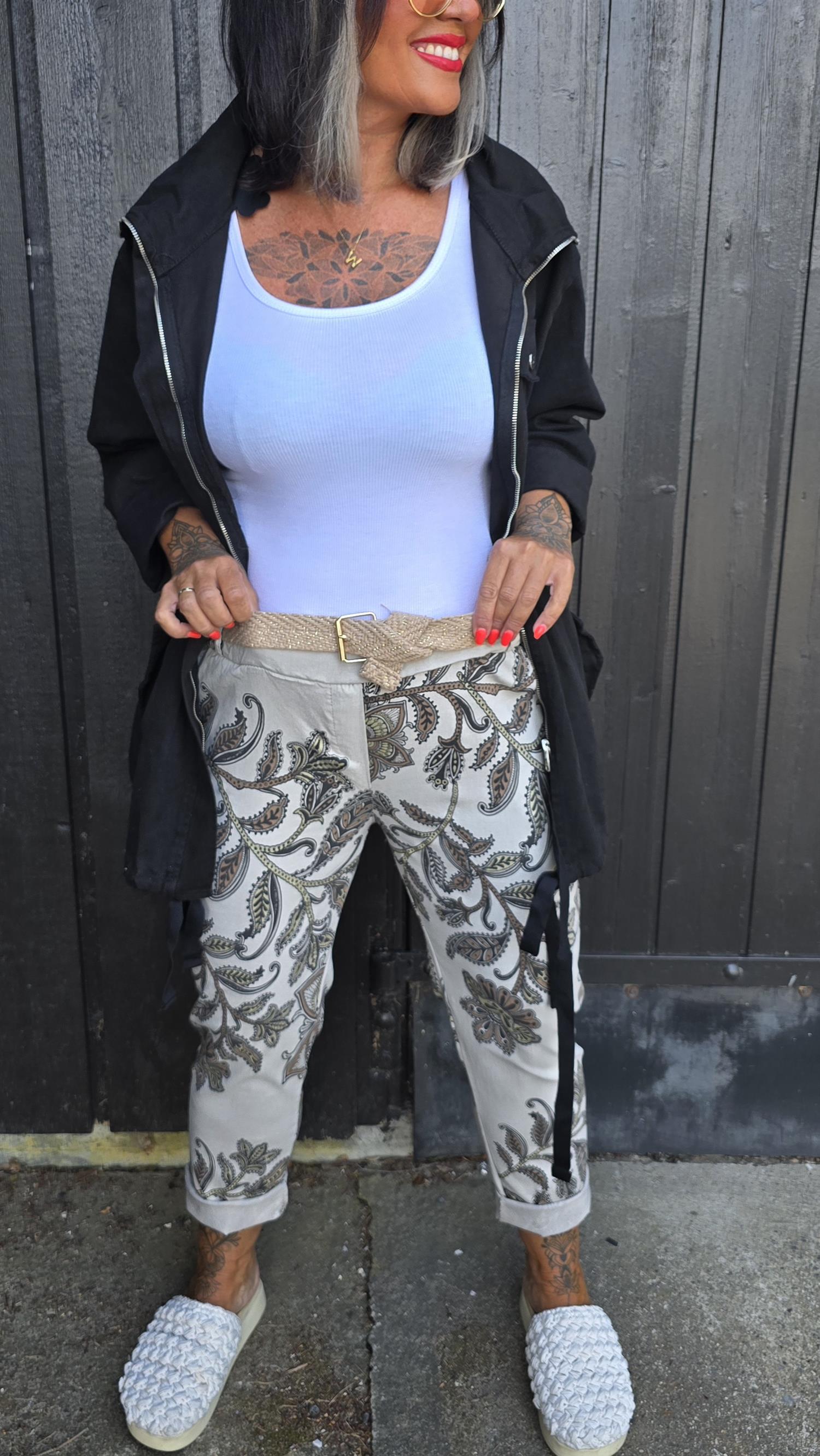 Snygg byxa med läckert print. Super stretchig kvalitet. Lommer I sidan och bak. Bälte följer med.