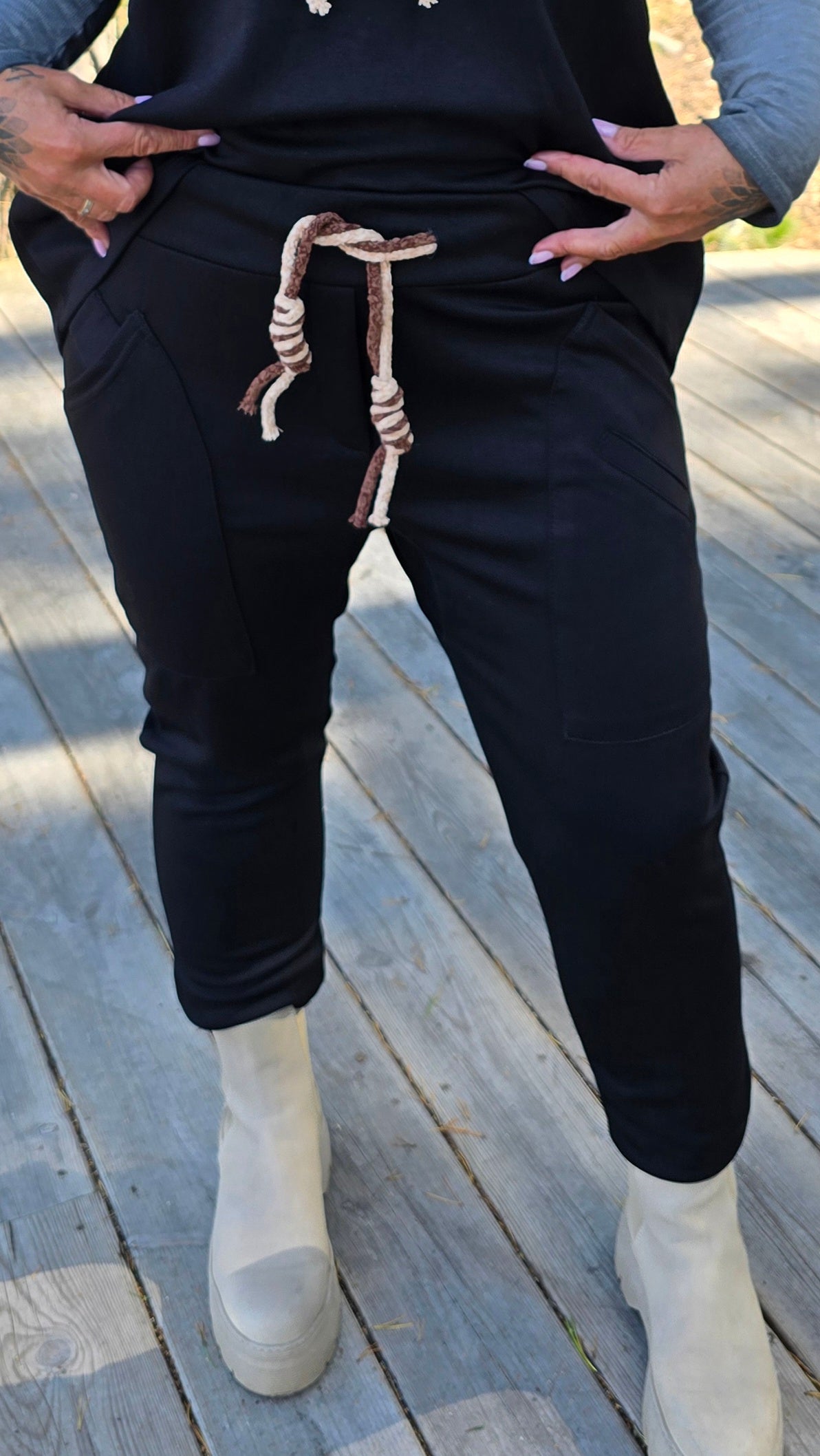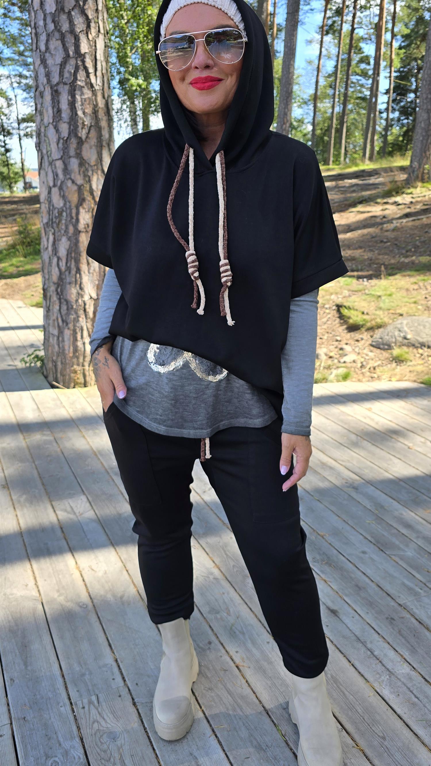 Byxa med läcker snöring. Strikk I midjan. Lommer I front och bak. Glattare stretchig matrial.