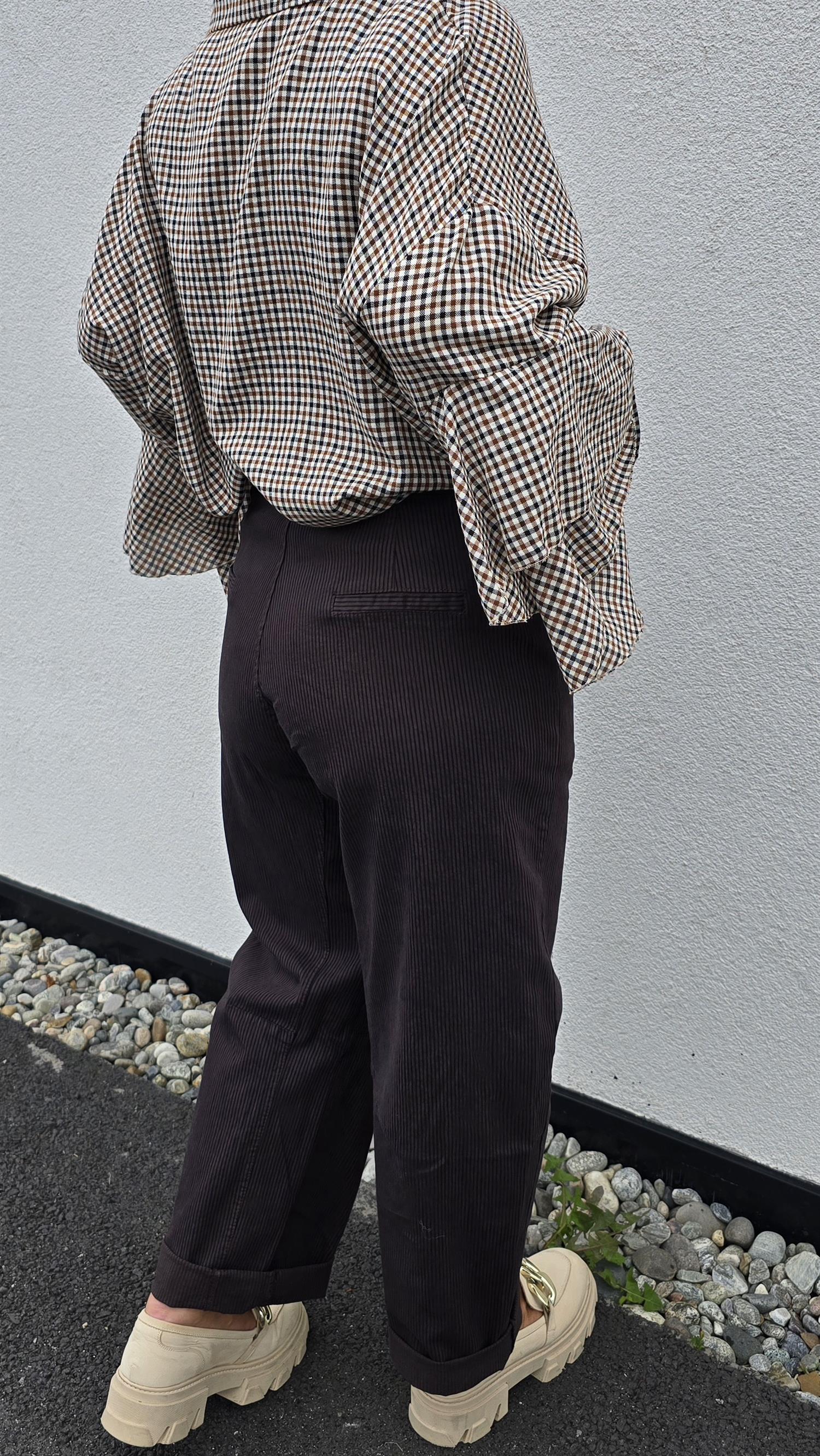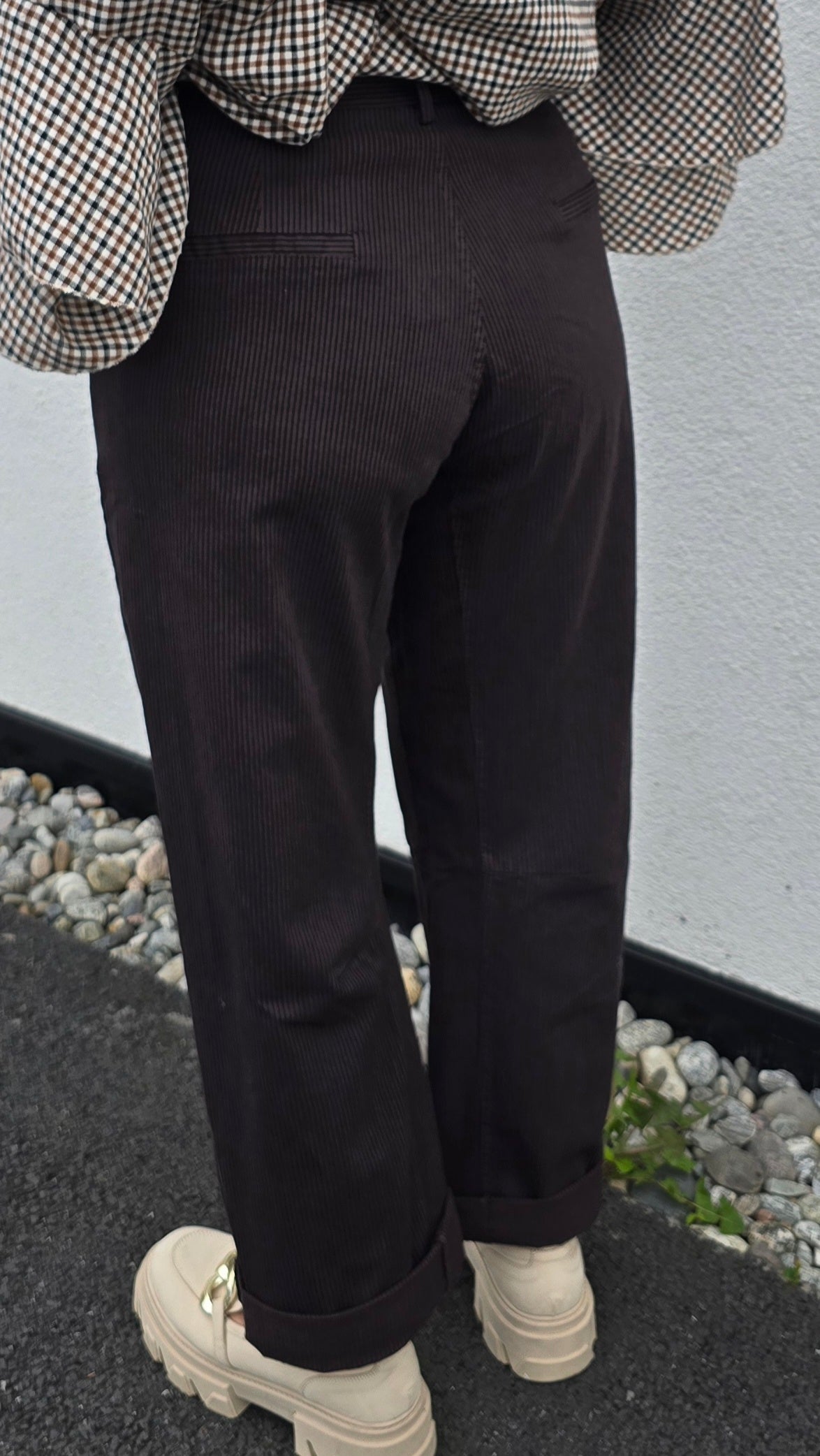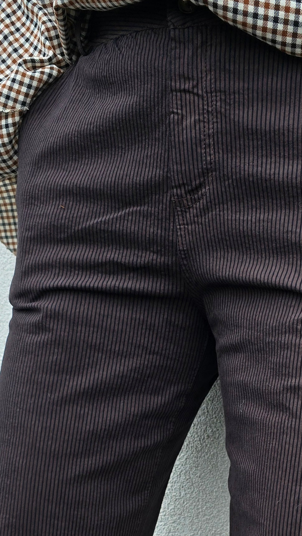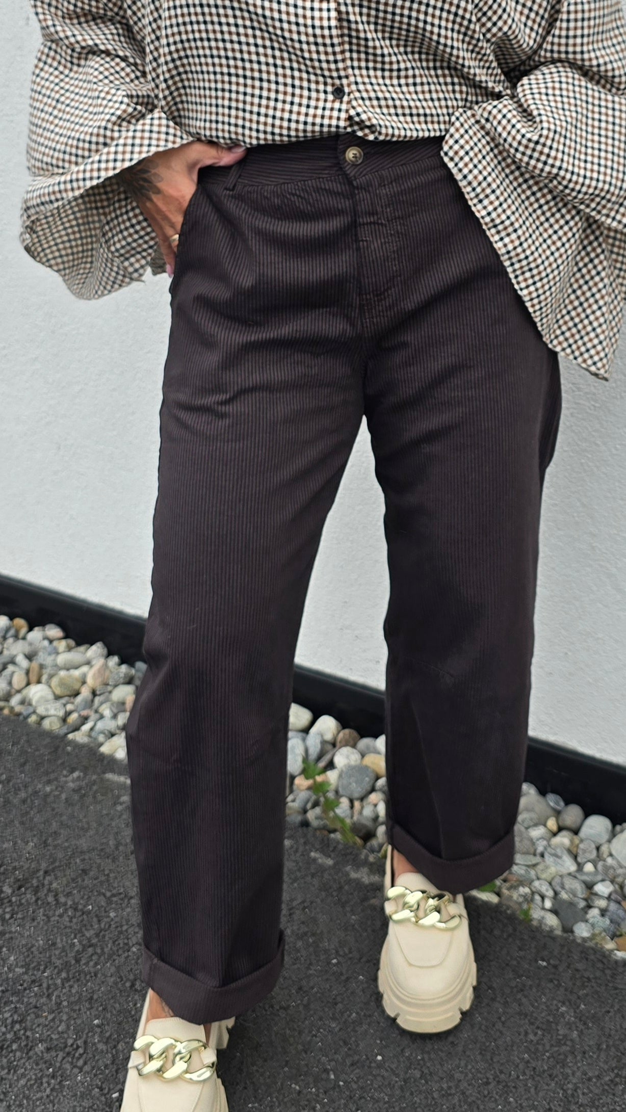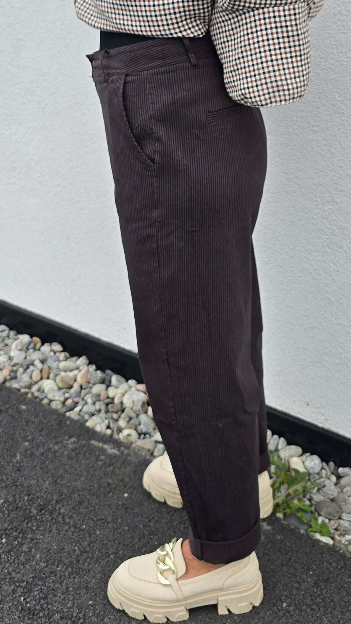 Så snygg byxa med smala striper I svart. Brun i botten. Lommer I sidan. Vidare ben som har kul fasong. Mycket behaglig på. Litt stretch i låren men mindre stretch I midjan.