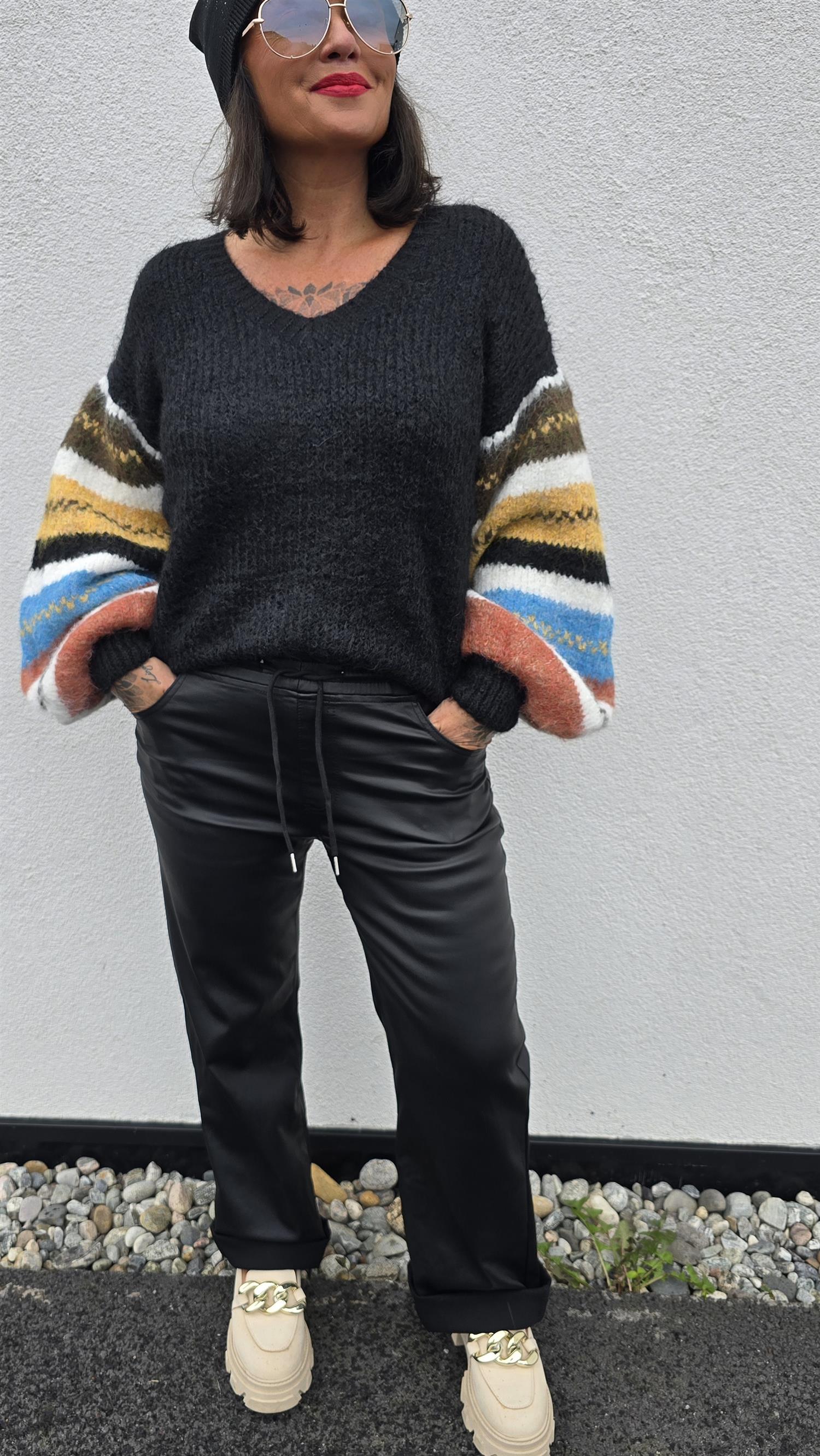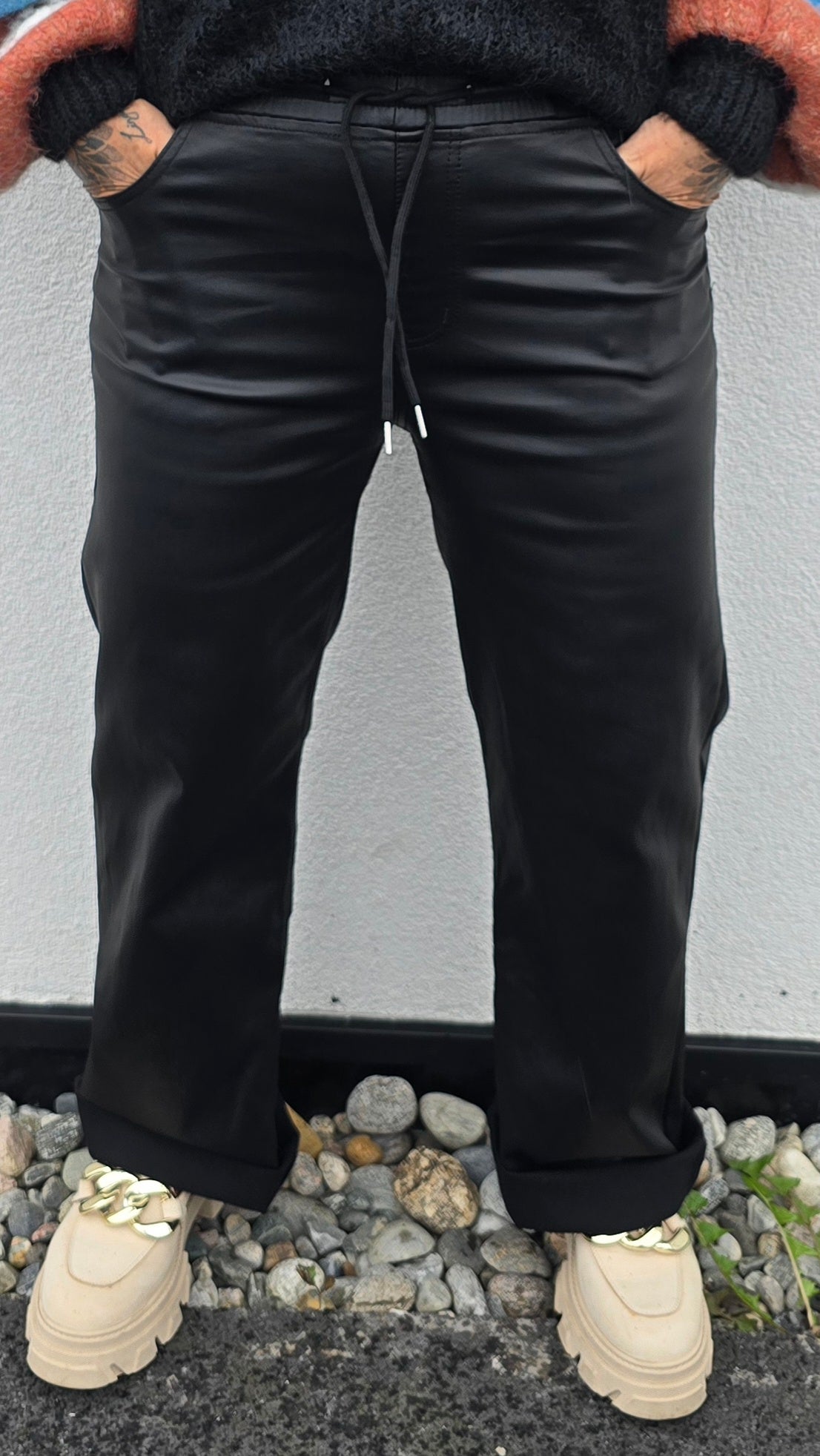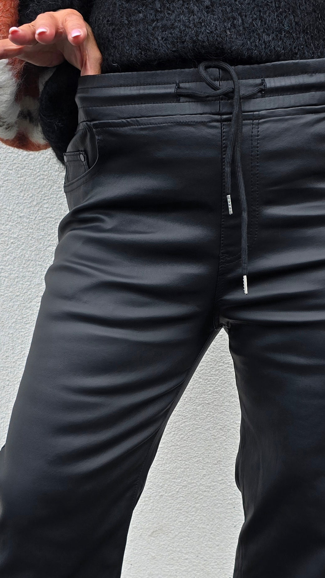 Byxa I skinn look med strikk och snöring I midjan. Lommer I sidan och bak. Skön stretch. Normal I str men vill man ha den lösare på ta en str större. Vidde I benen.