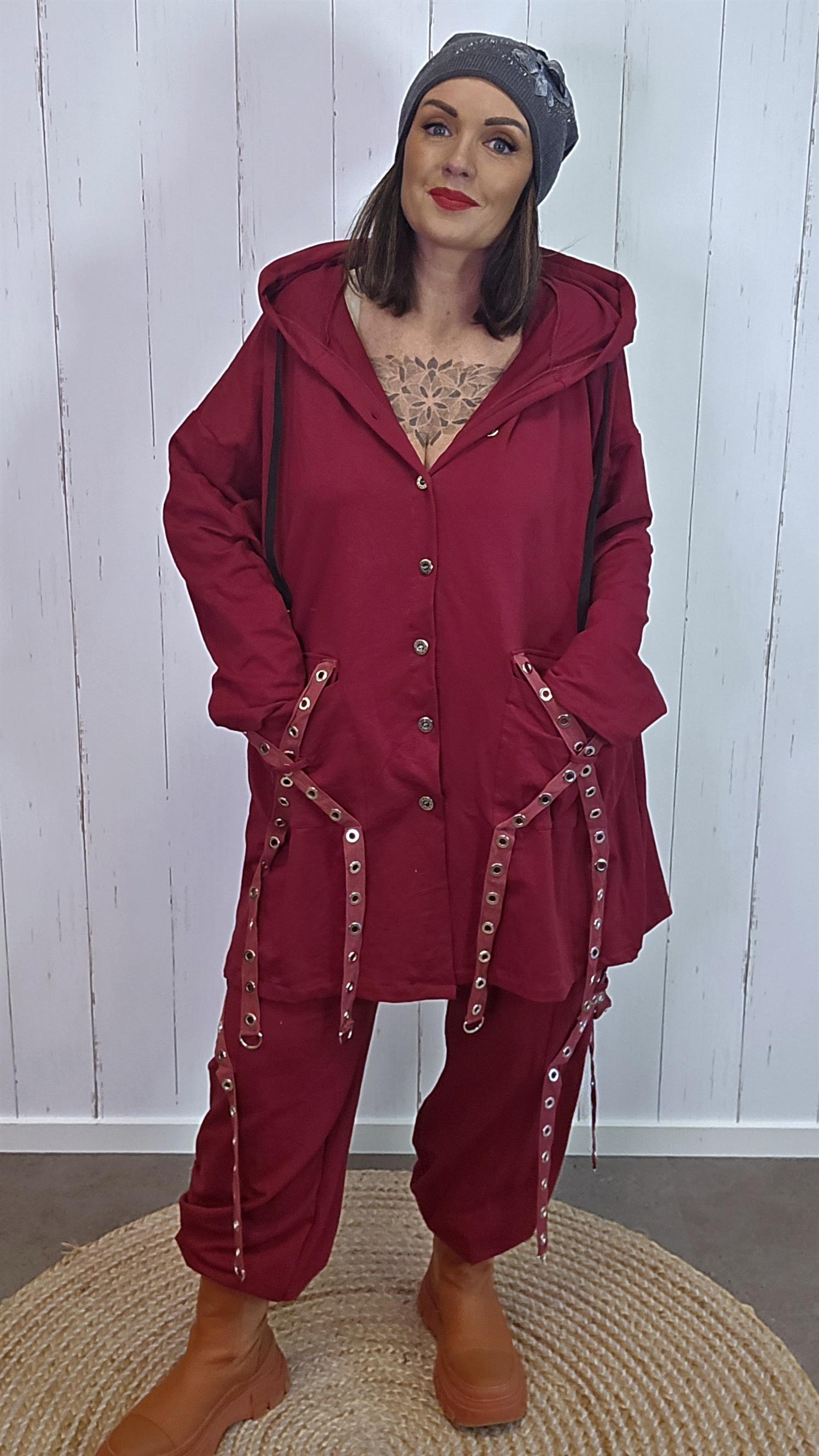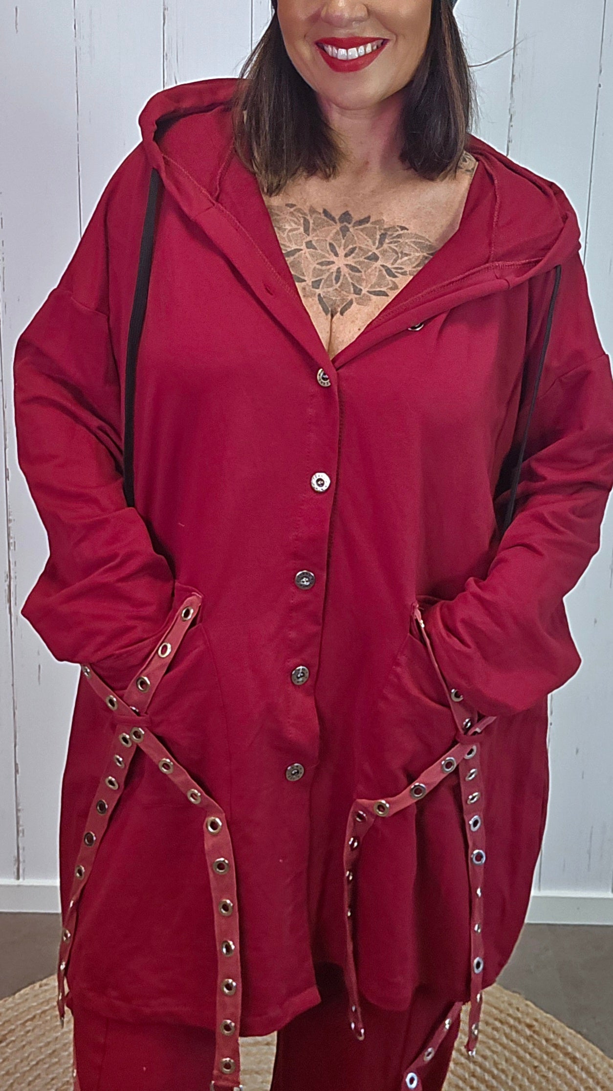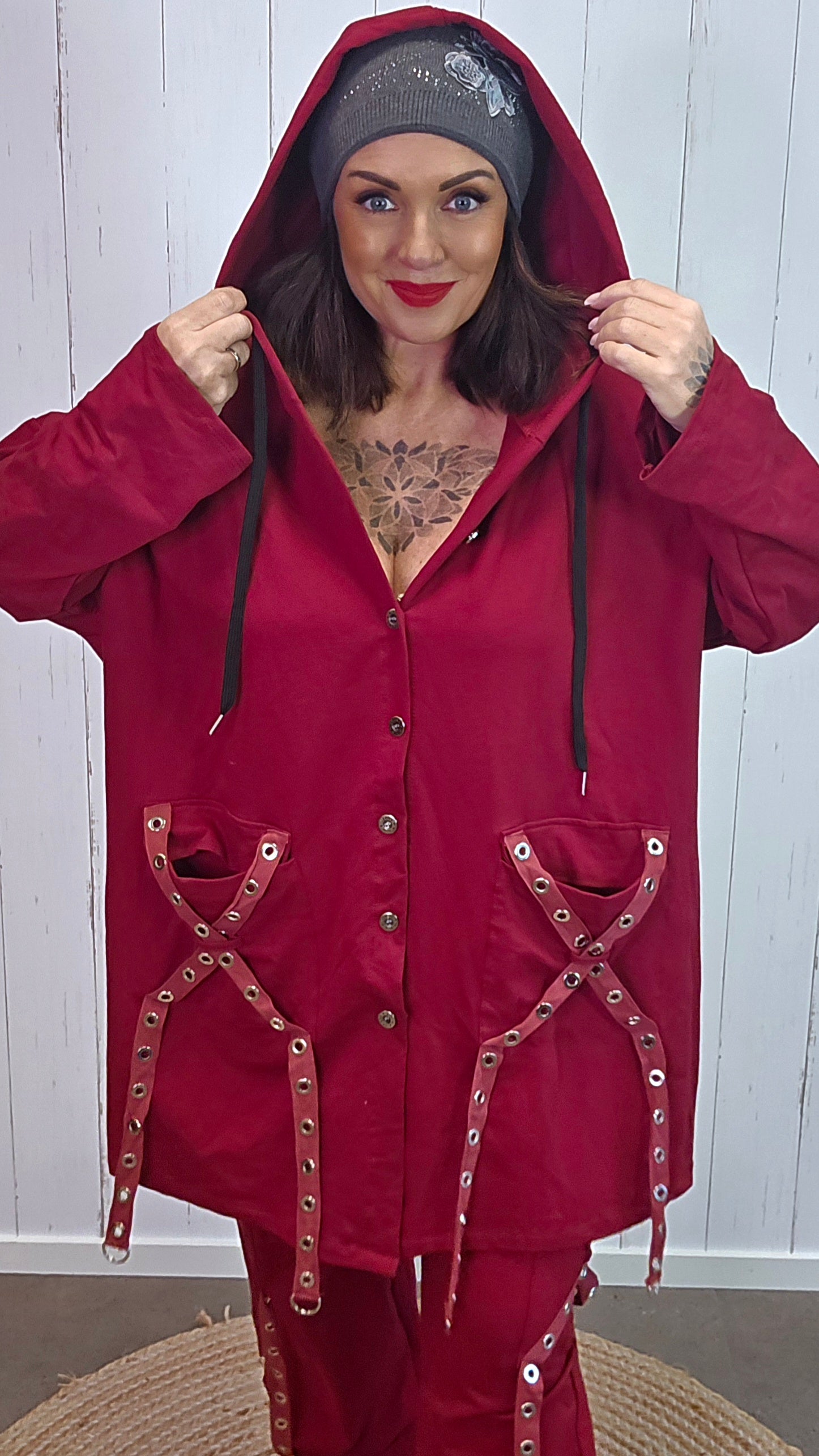 En tøff og komfortabel lang hettejakke med knapperekke i front og hette med snøring. Modellen har sidelommer, oppbrettbare ermer og dekorative stropper med maljer foran, som gir et unikt og moderne uttrykk. Den myke og stretchy bomullskvaliteten gjør den behagelig å bruke, samtidig som fasongen gir en avslappet og kul look.