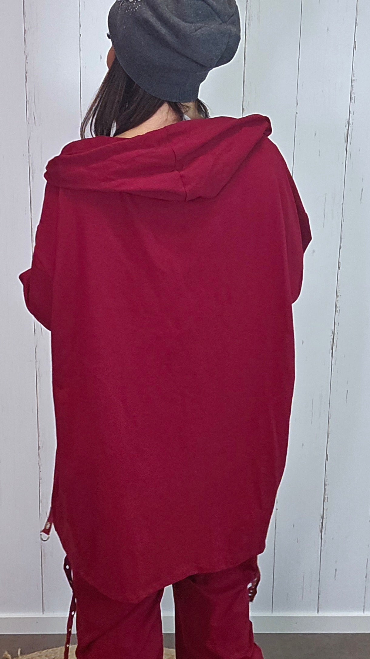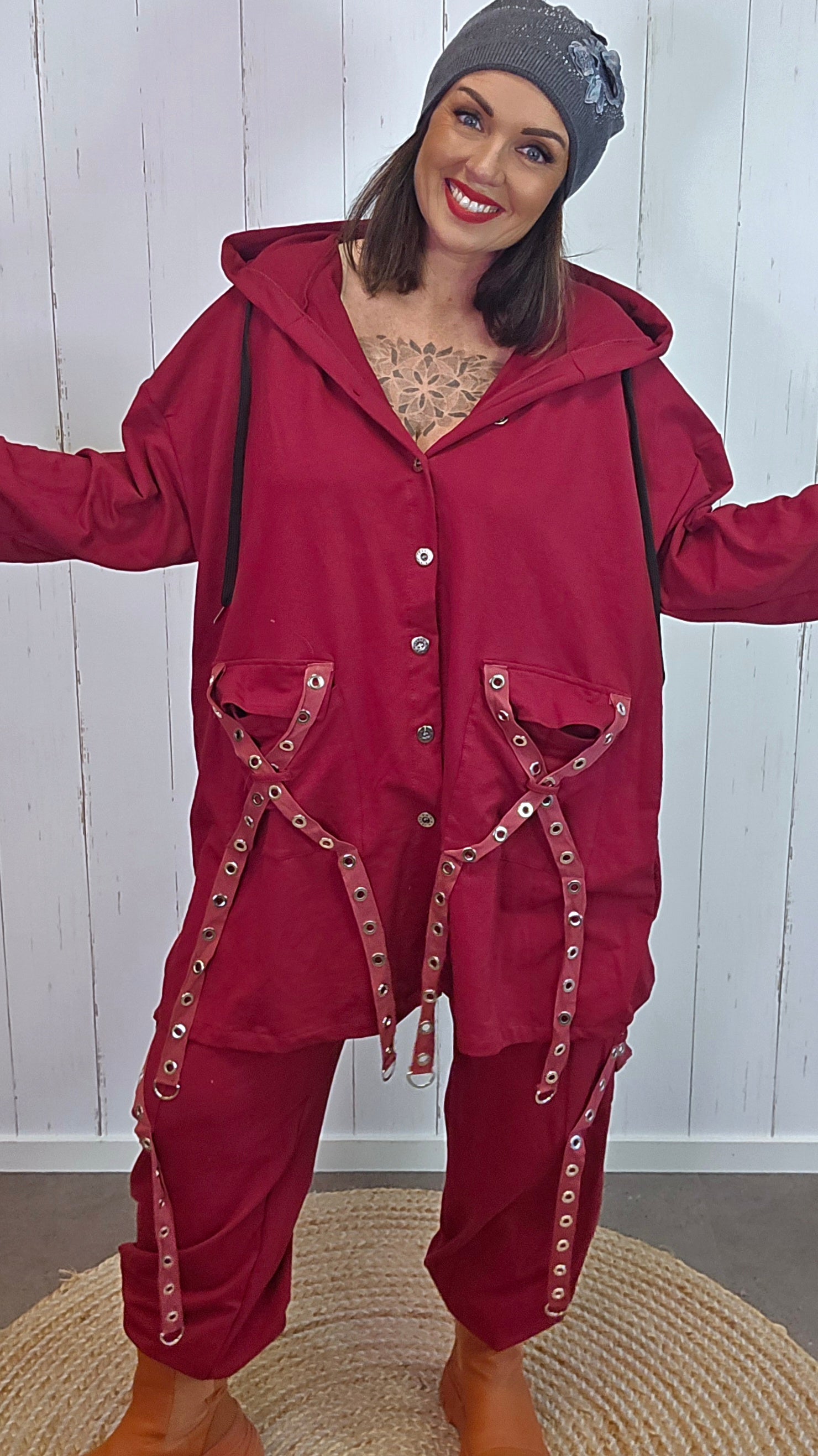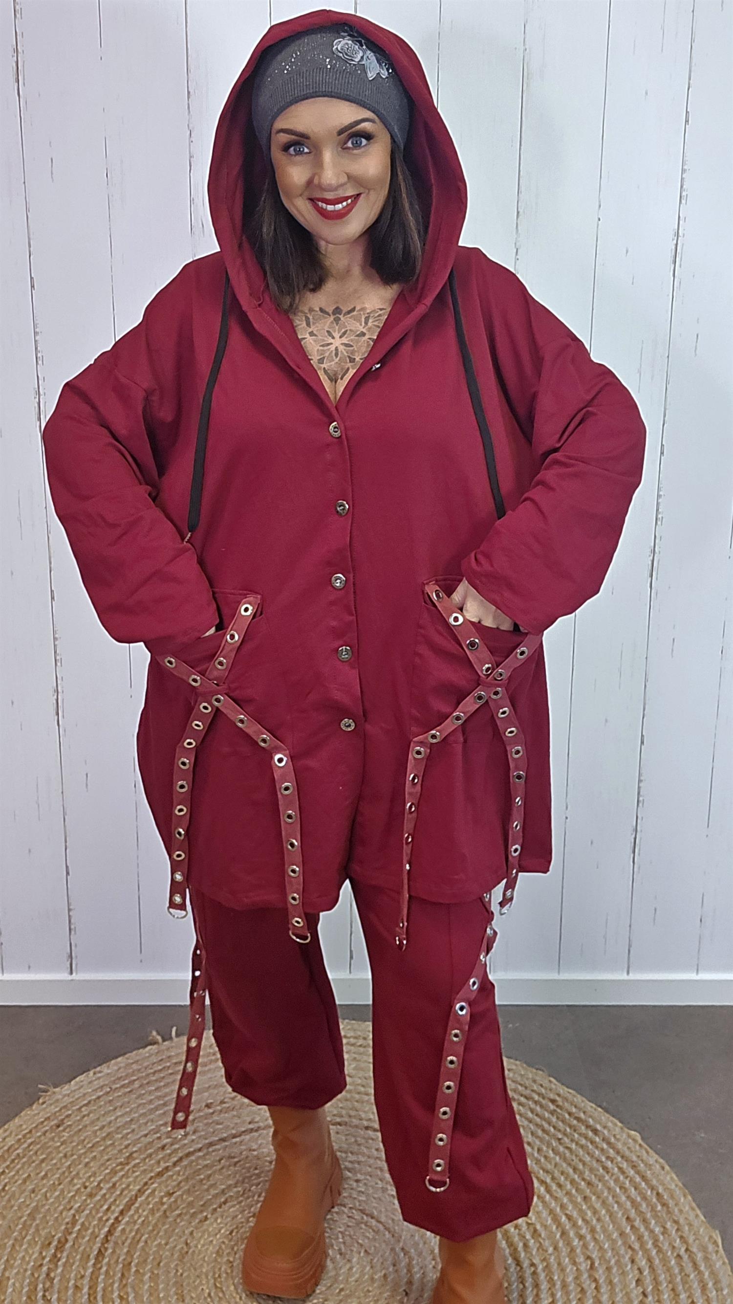En tøff og komfortabel lang hettejakke med knapperekke i front og hette med snøring. Modellen har sidelommer, oppbrettbare ermer og dekorative stropper med maljer foran, som gir et unikt og moderne uttrykk. Den myke og stretchy bomullskvaliteten gjør den behagelig å bruke, samtidig som fasongen gir en avslappet og kul look.