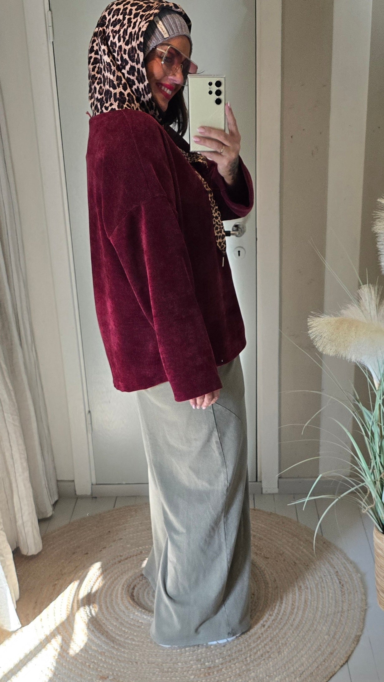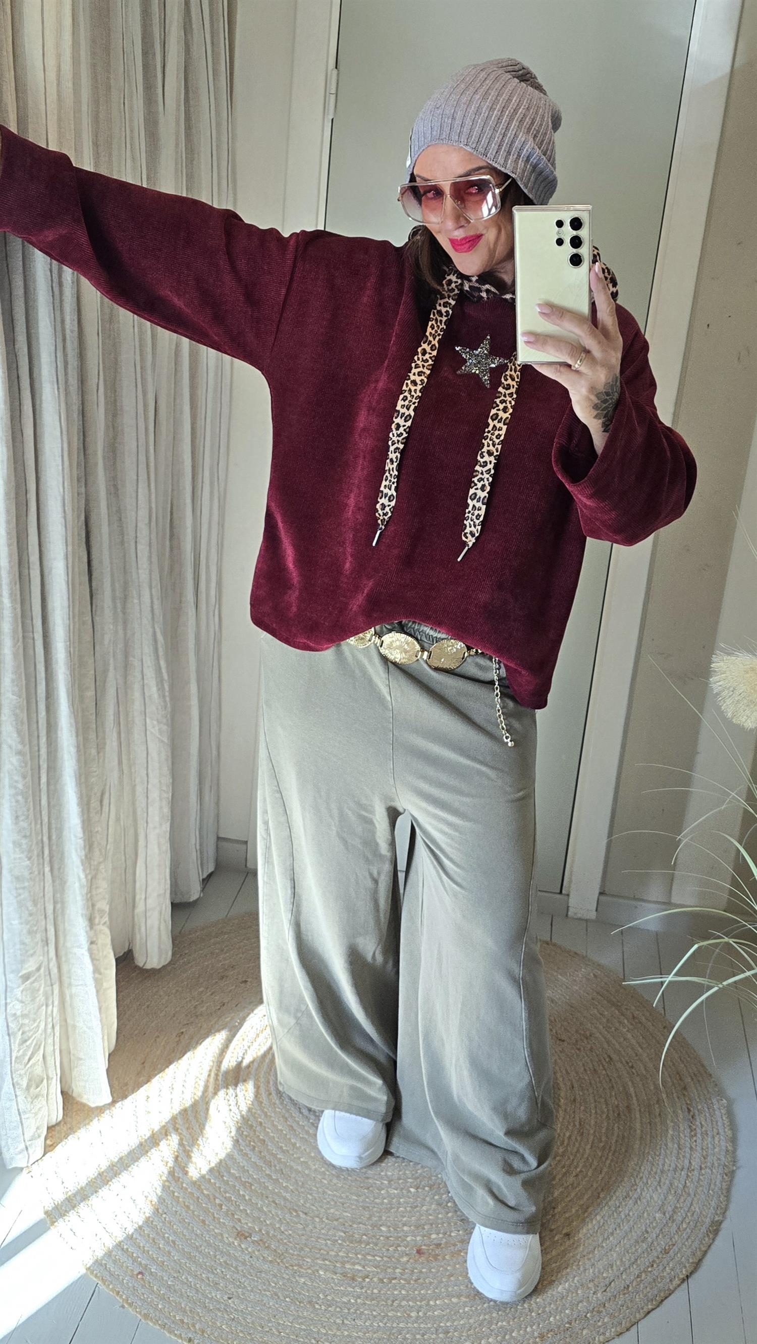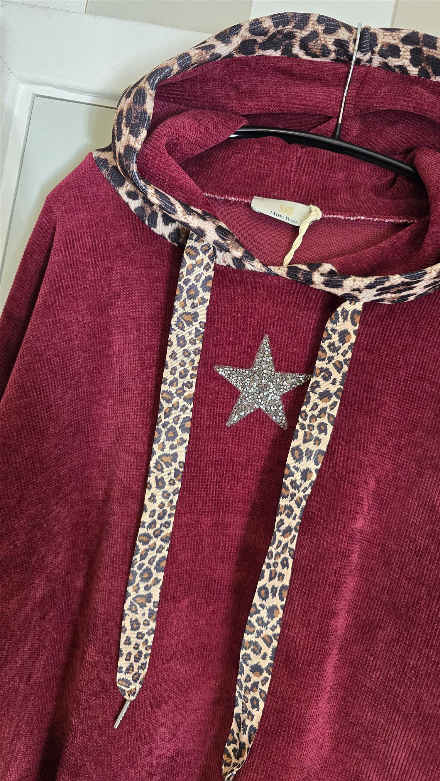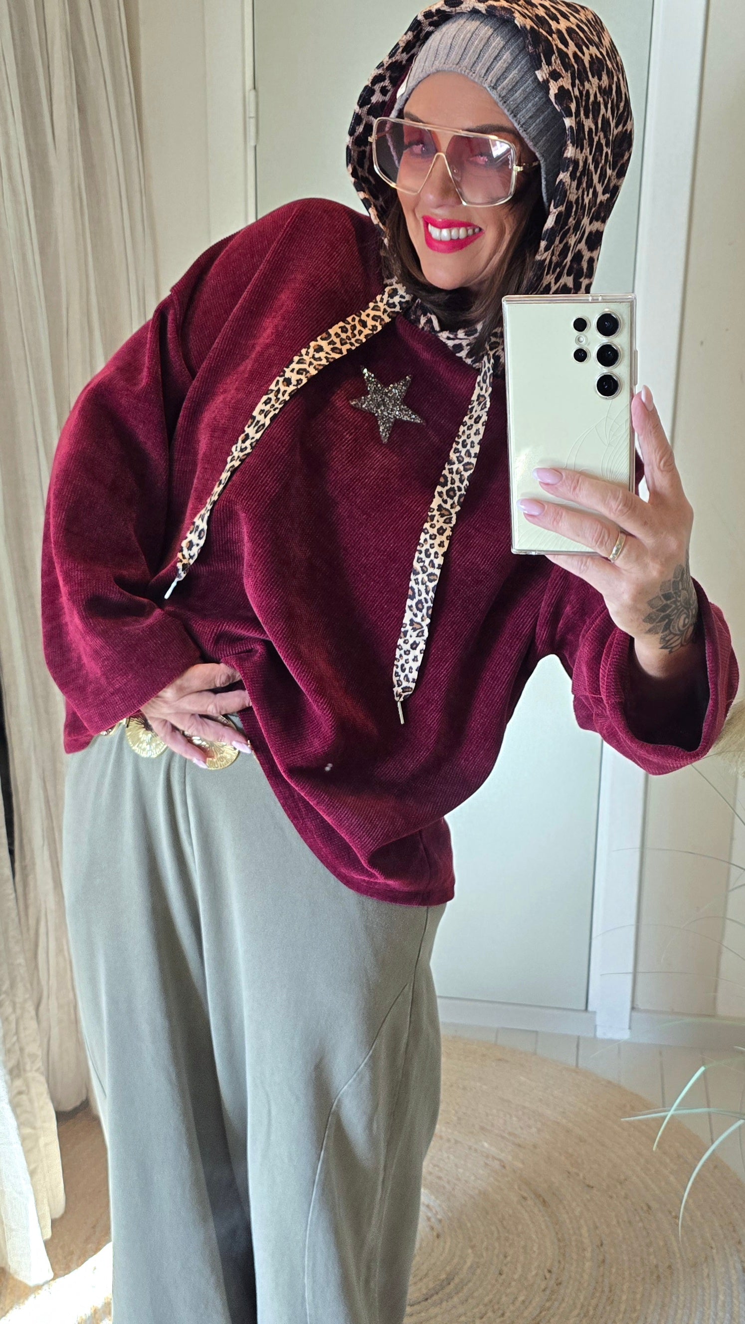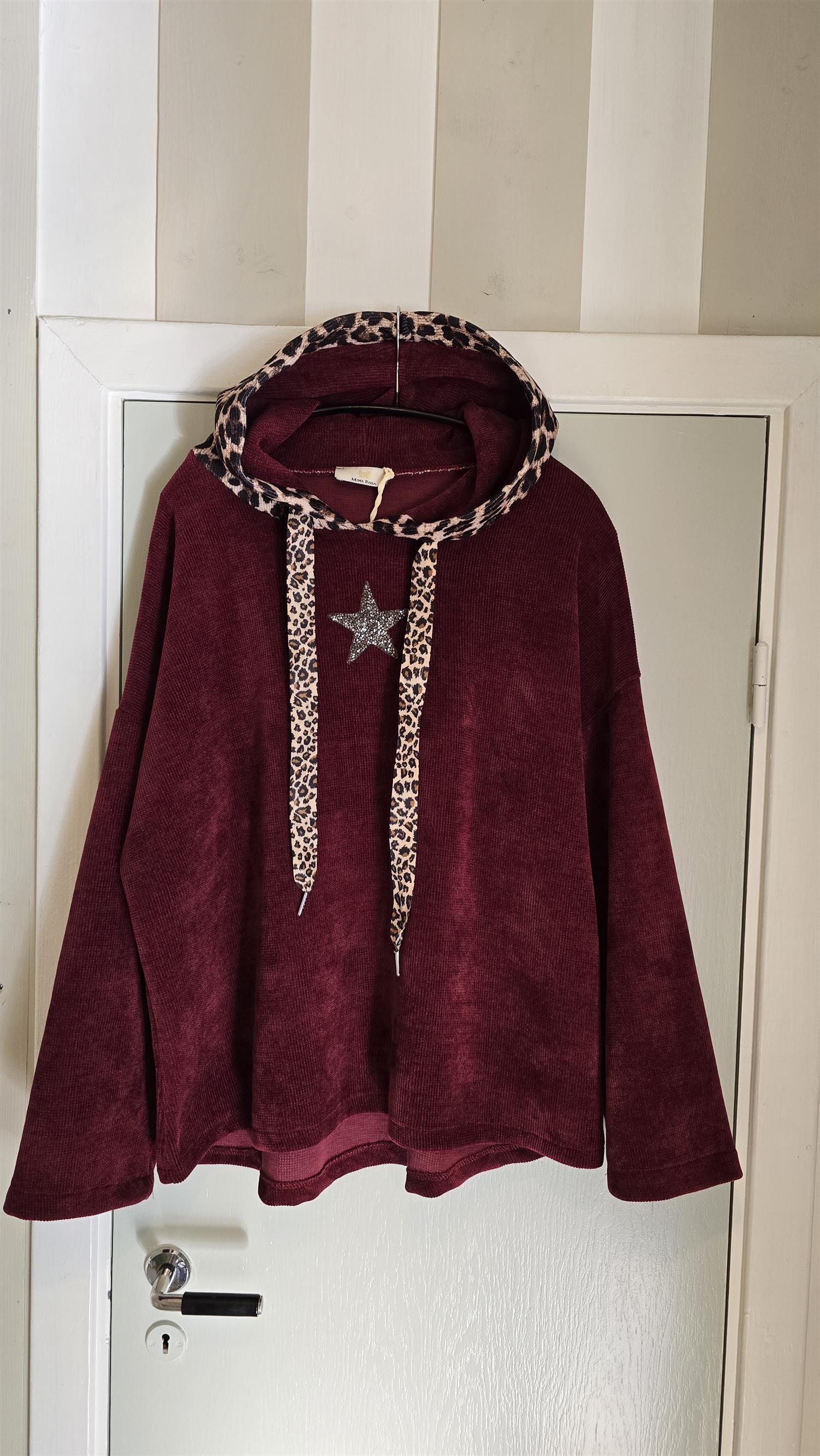 En myk og komfortabel velourgenser med hette og snøring i leopardmønster. På brystet har den en stilig bling-stjerne som gir plagget et unikt preg. Modellen har lange ermer, fin passform og er designet litt lengre bak for en flatterende silhuett. Et lekkert og behagelig plagg som kombinerer hverdagskomfort med et hint av glam.