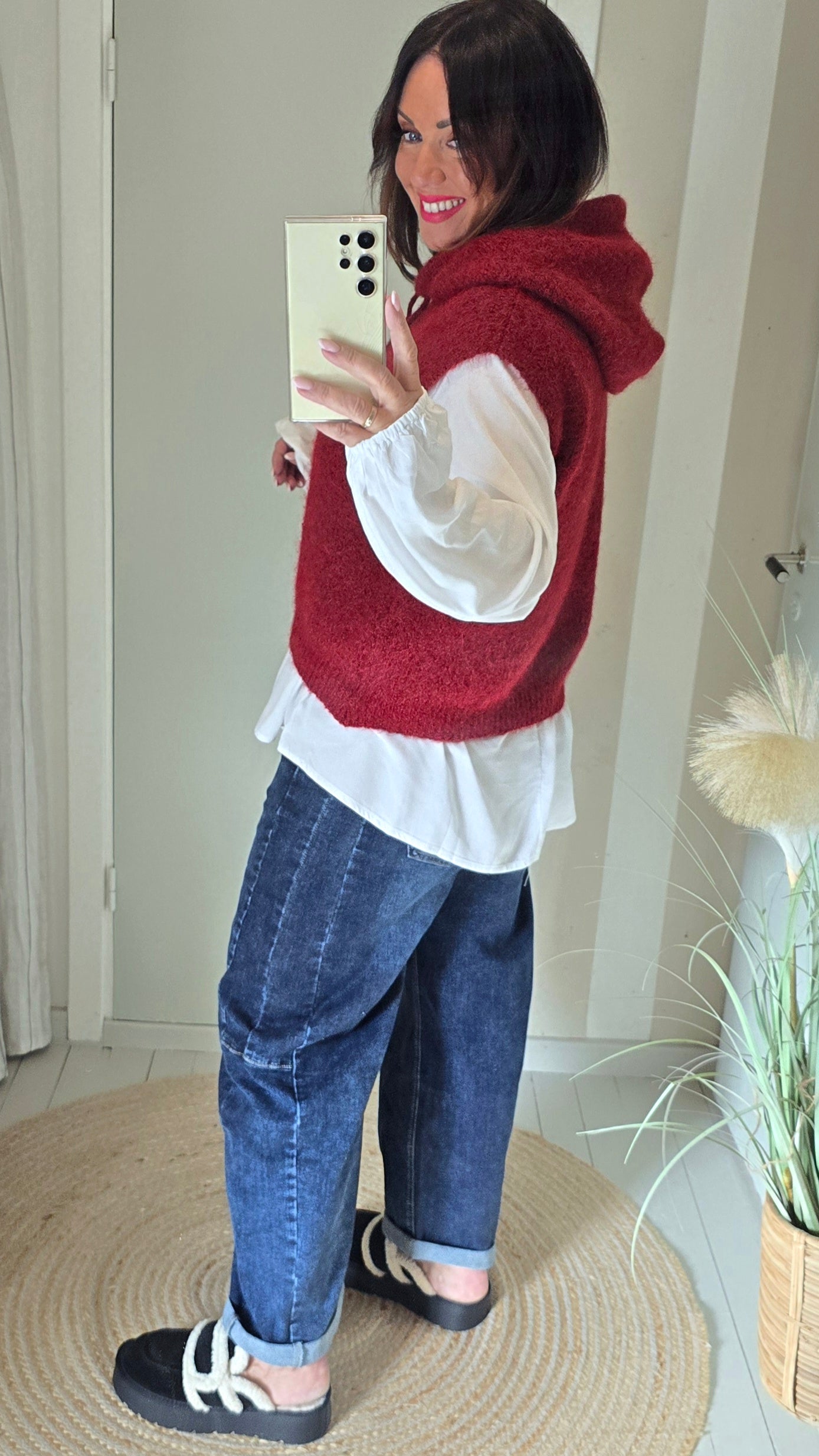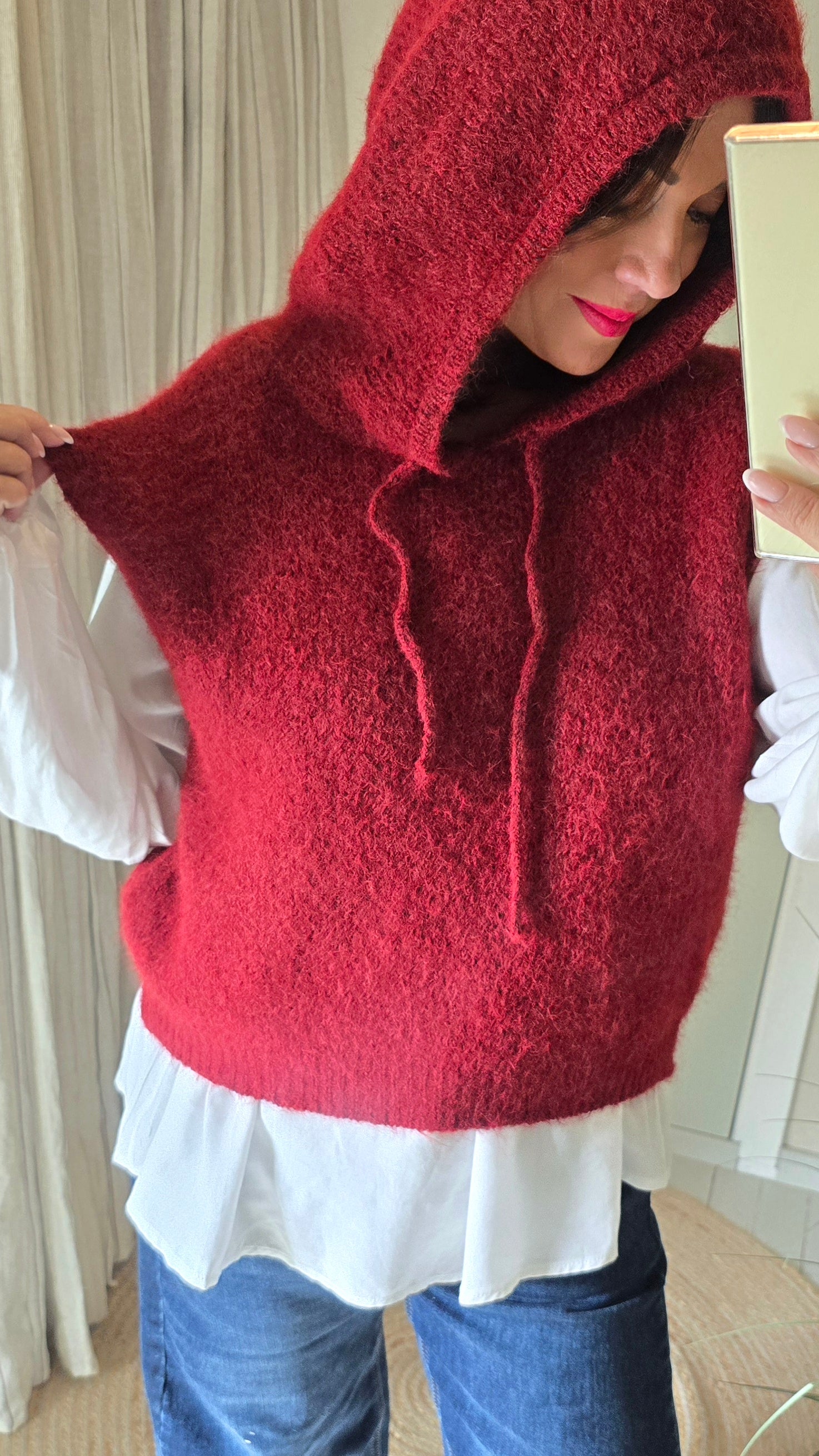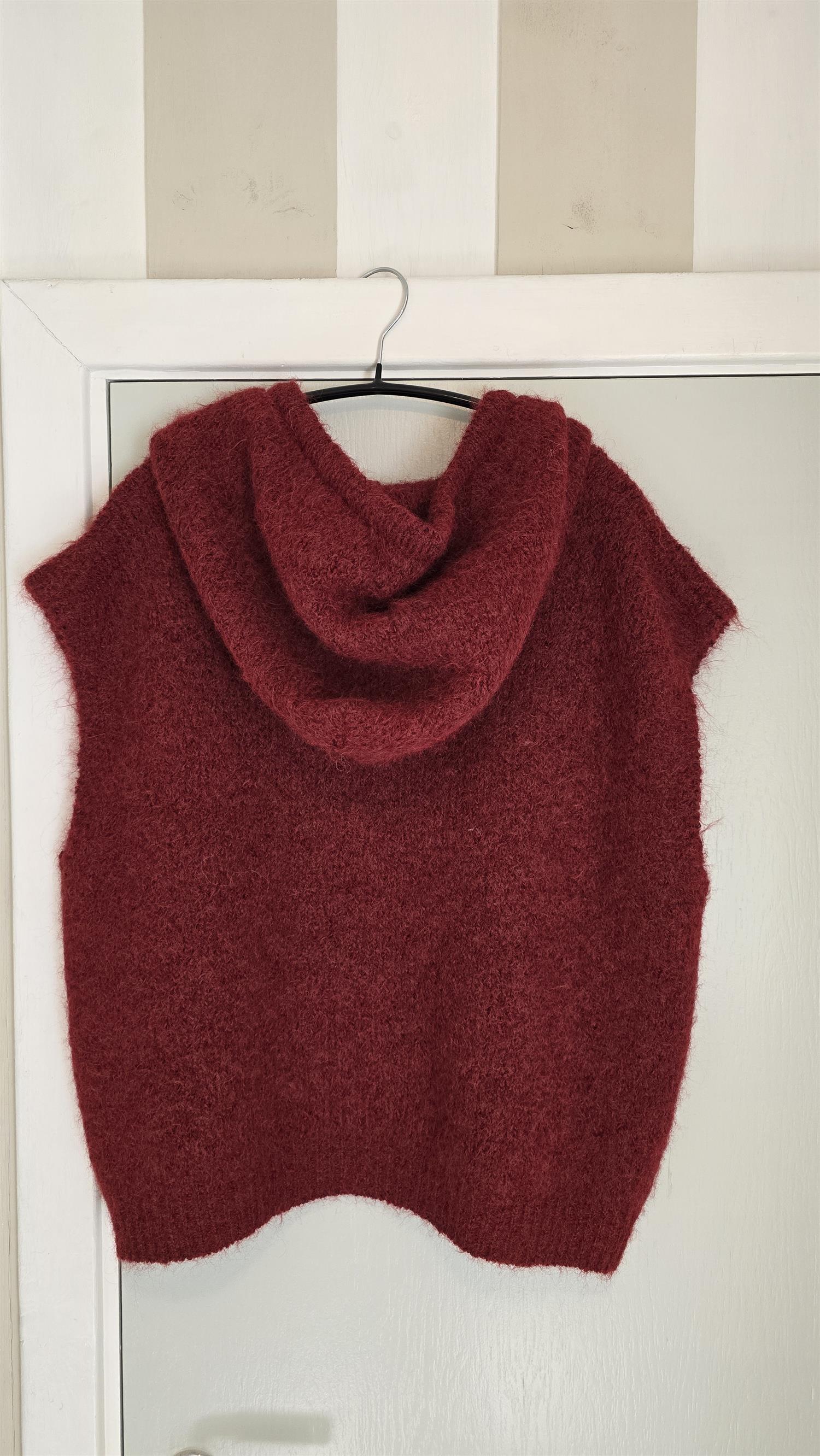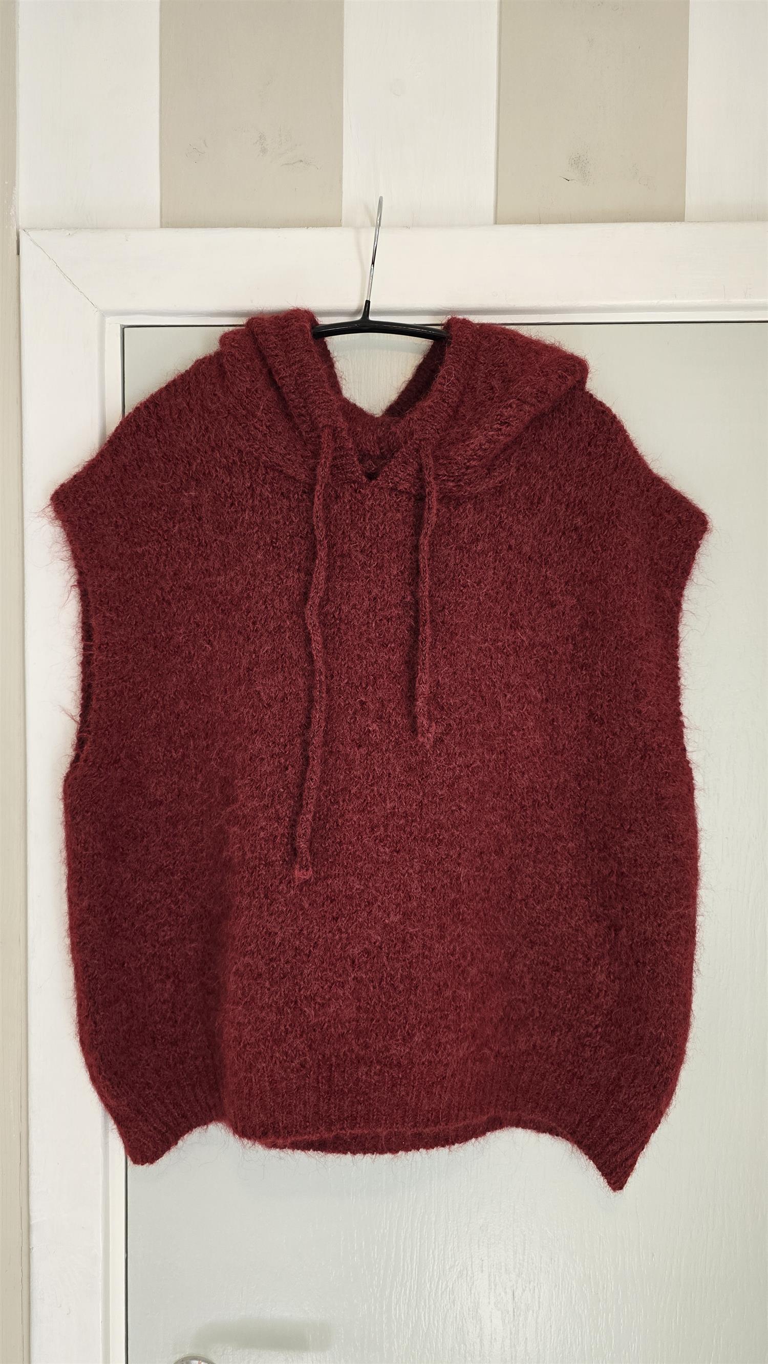 En fresh og stilfull strikket vest med en stor og fin hette. Hetten har snøring i samme strikk som resten av plagget, og designet er åpent fra skulder til under skulder slik at hele armen er fri. Vesten avsluttes med en bred ribbkant nederst og har en myk og behagelig kvalitet med 8 % ull. Et trendy plagg som gir et feminint og moderne uttrykk.