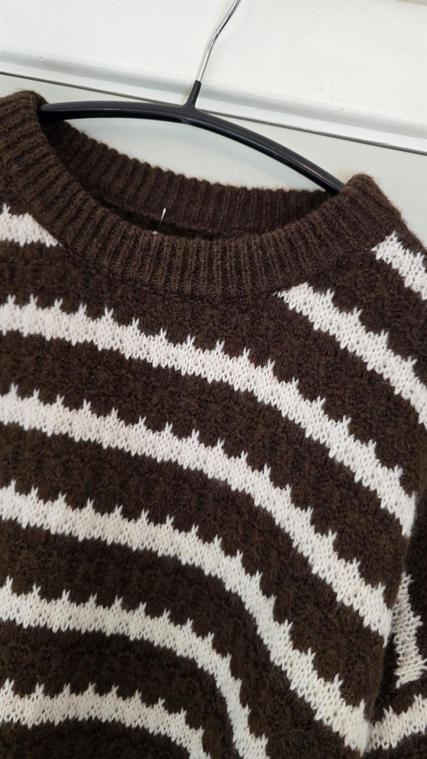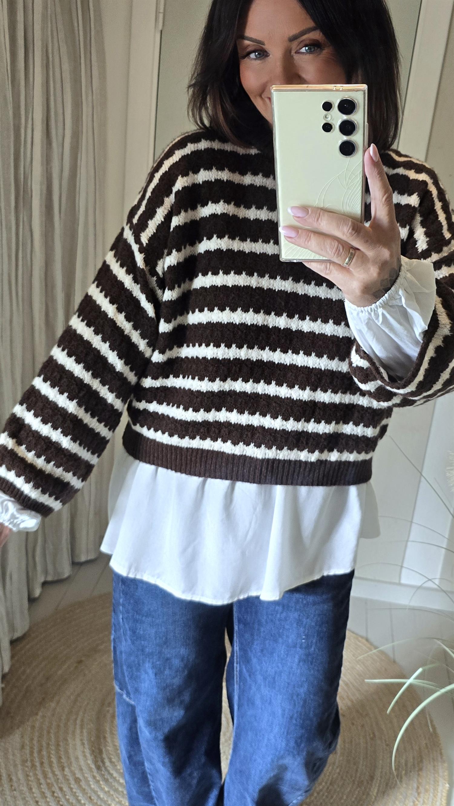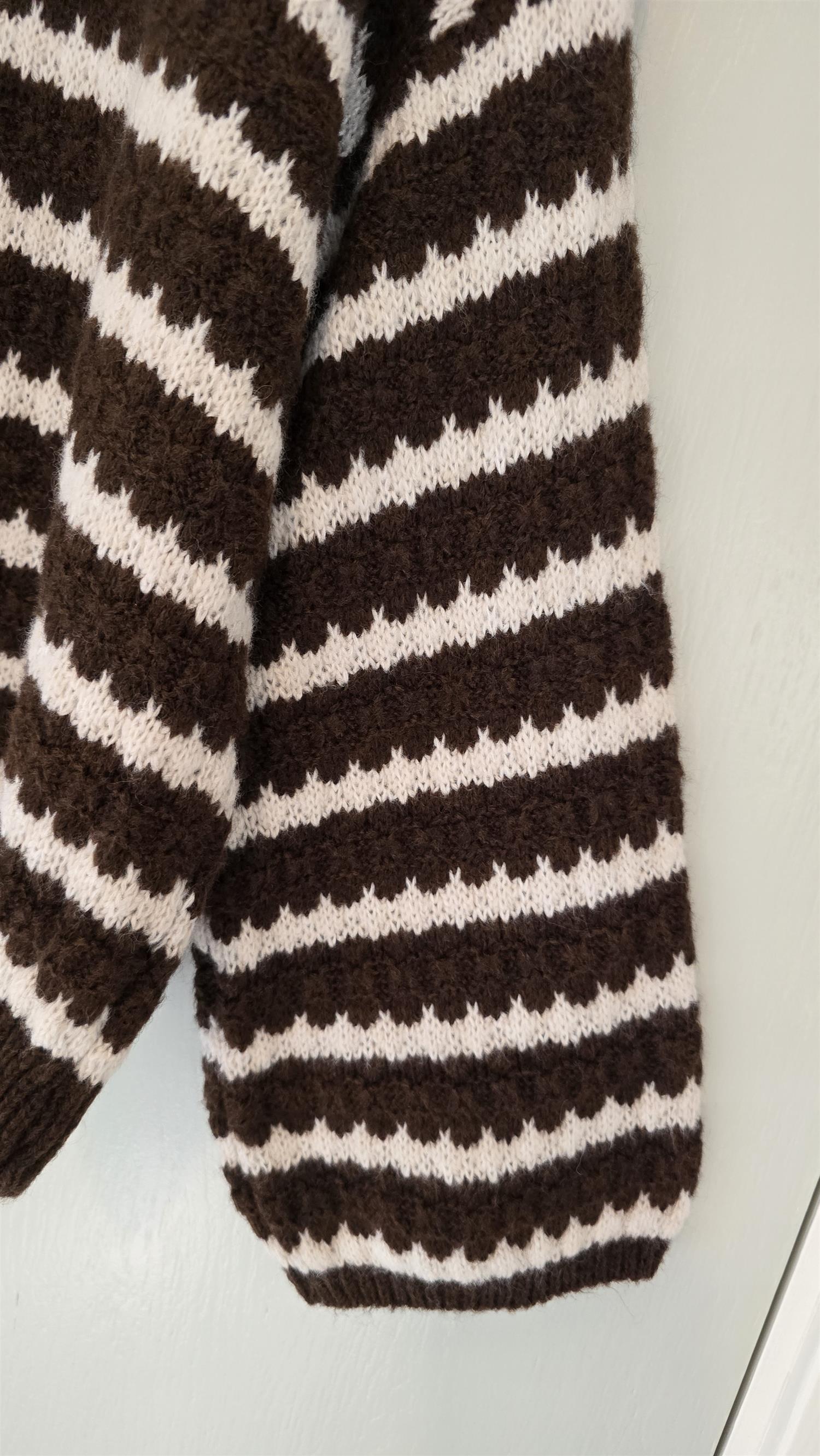 En deilig og myk strikkegenser i brun- og kremfargede striper. Genseren har rund hals med bred ribbkant, lange ermer med kant nederst og en bred avslutning nederst på bolen. En behagelig og tidløs modell som er enkel å style til både hverdag og en mer pyntet anledning.