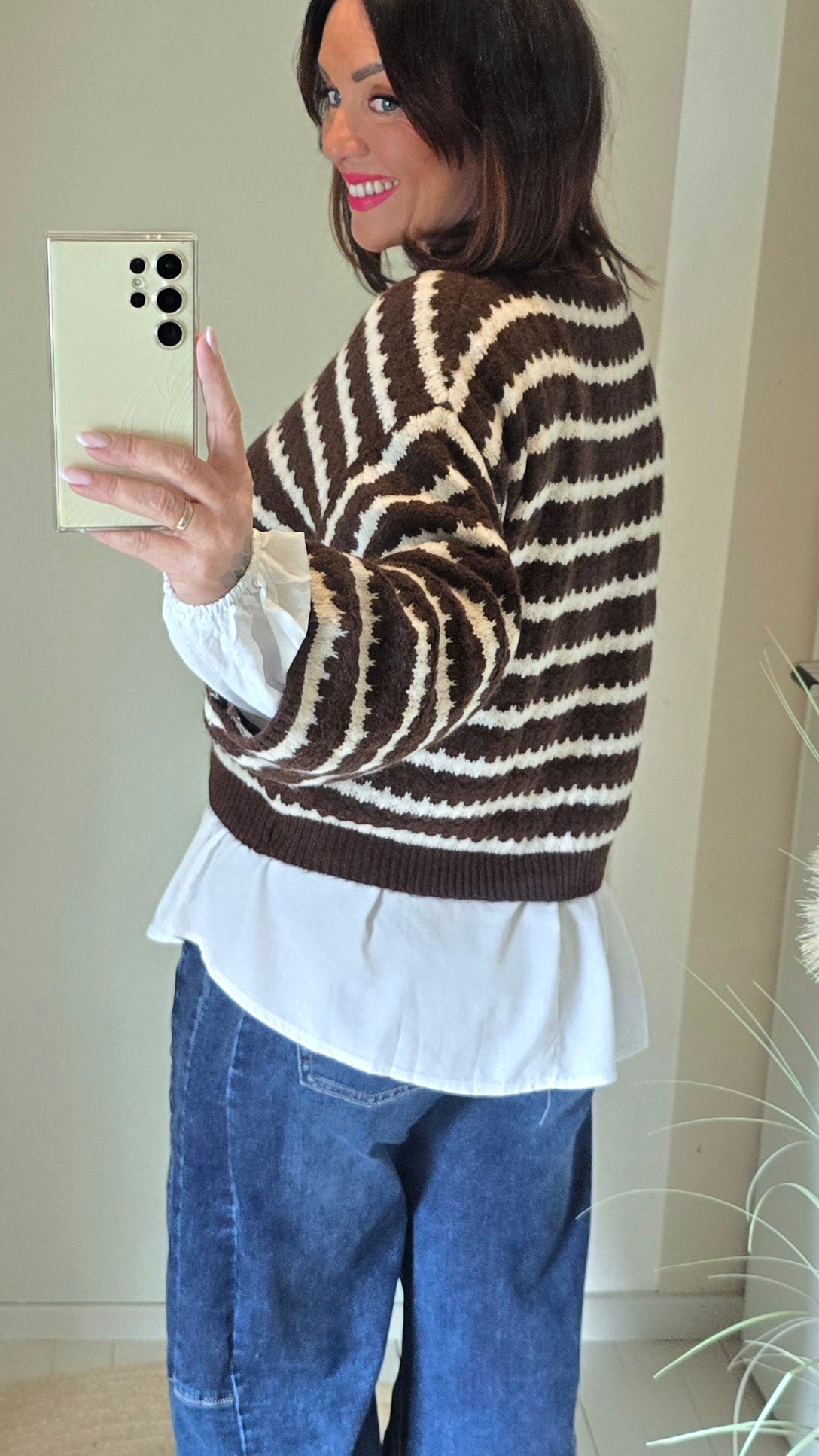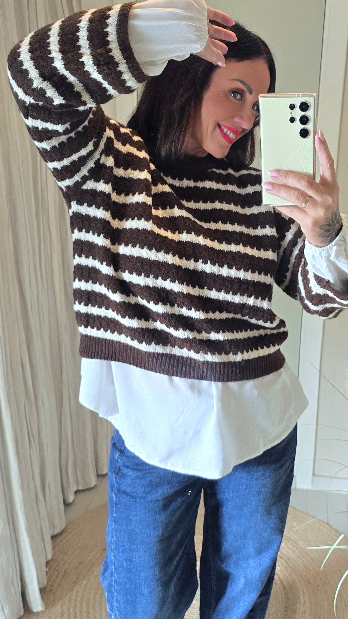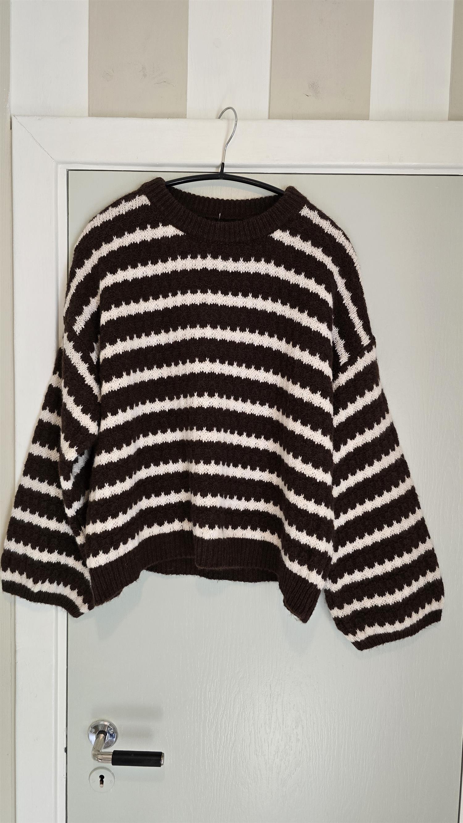 En deilig og myk strikkegenser i brun- og kremfargede striper. Genseren har rund hals med bred ribbkant, lange ermer med kant nederst og en bred avslutning nederst på bolen. En behagelig og tidløs modell som er enkel å style til både hverdag og en mer pyntet anledning.