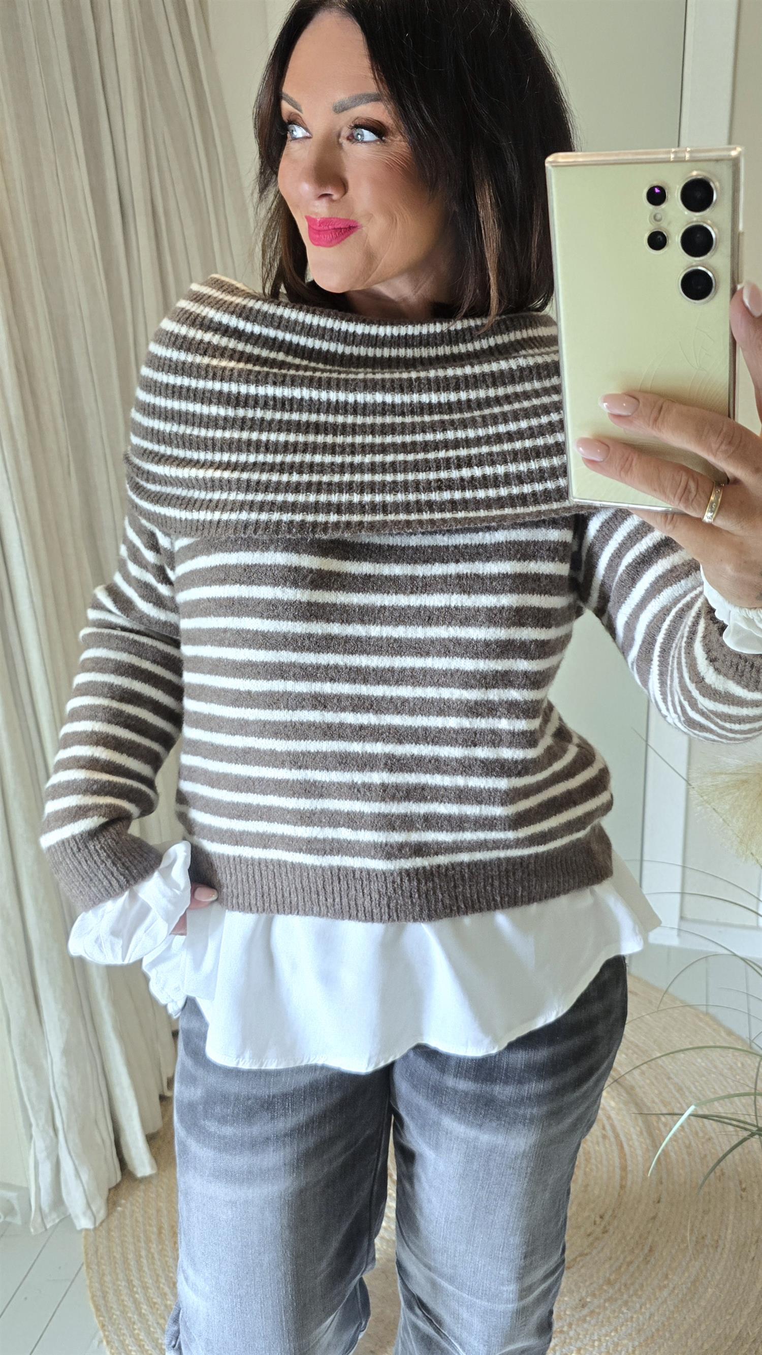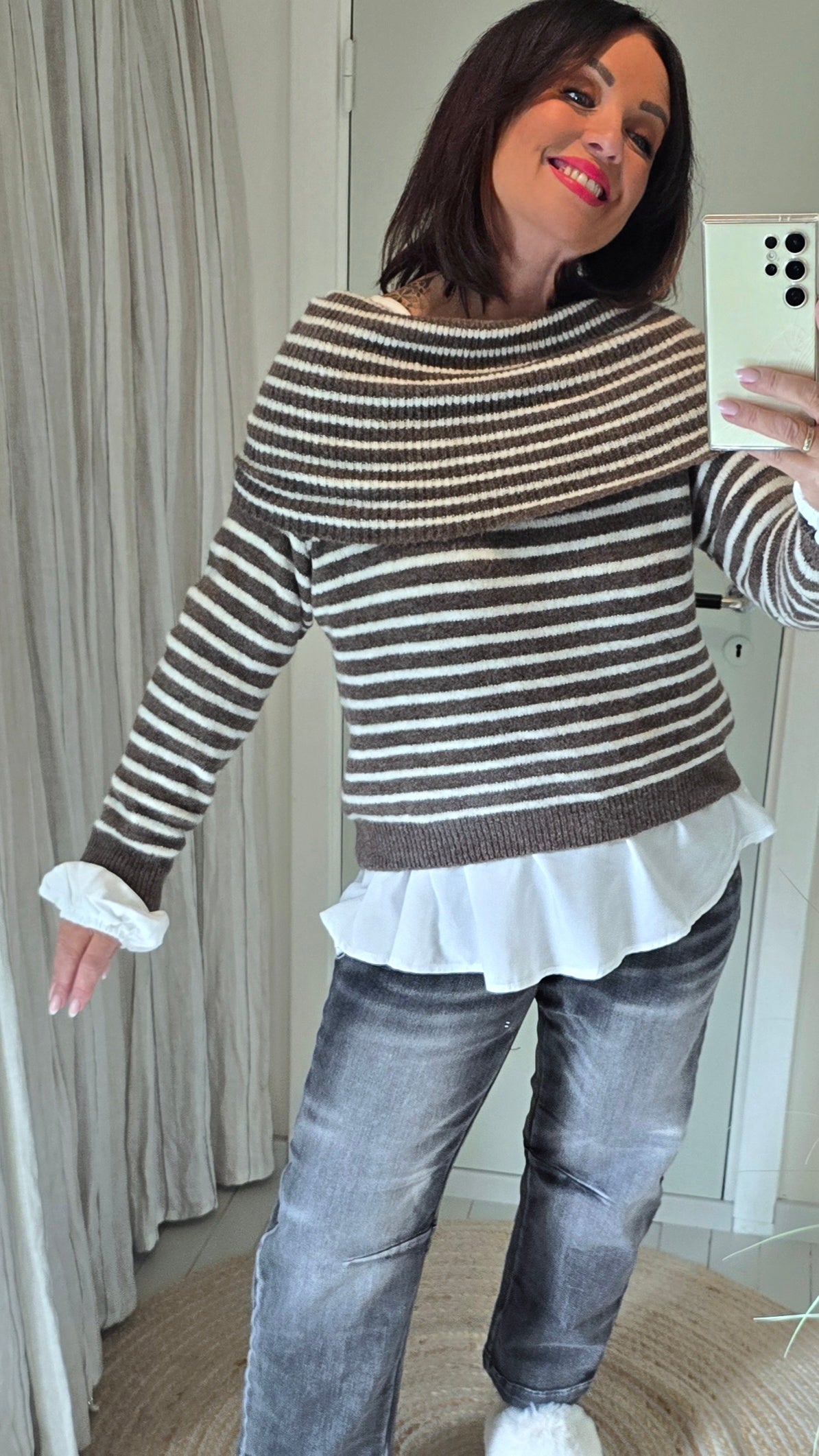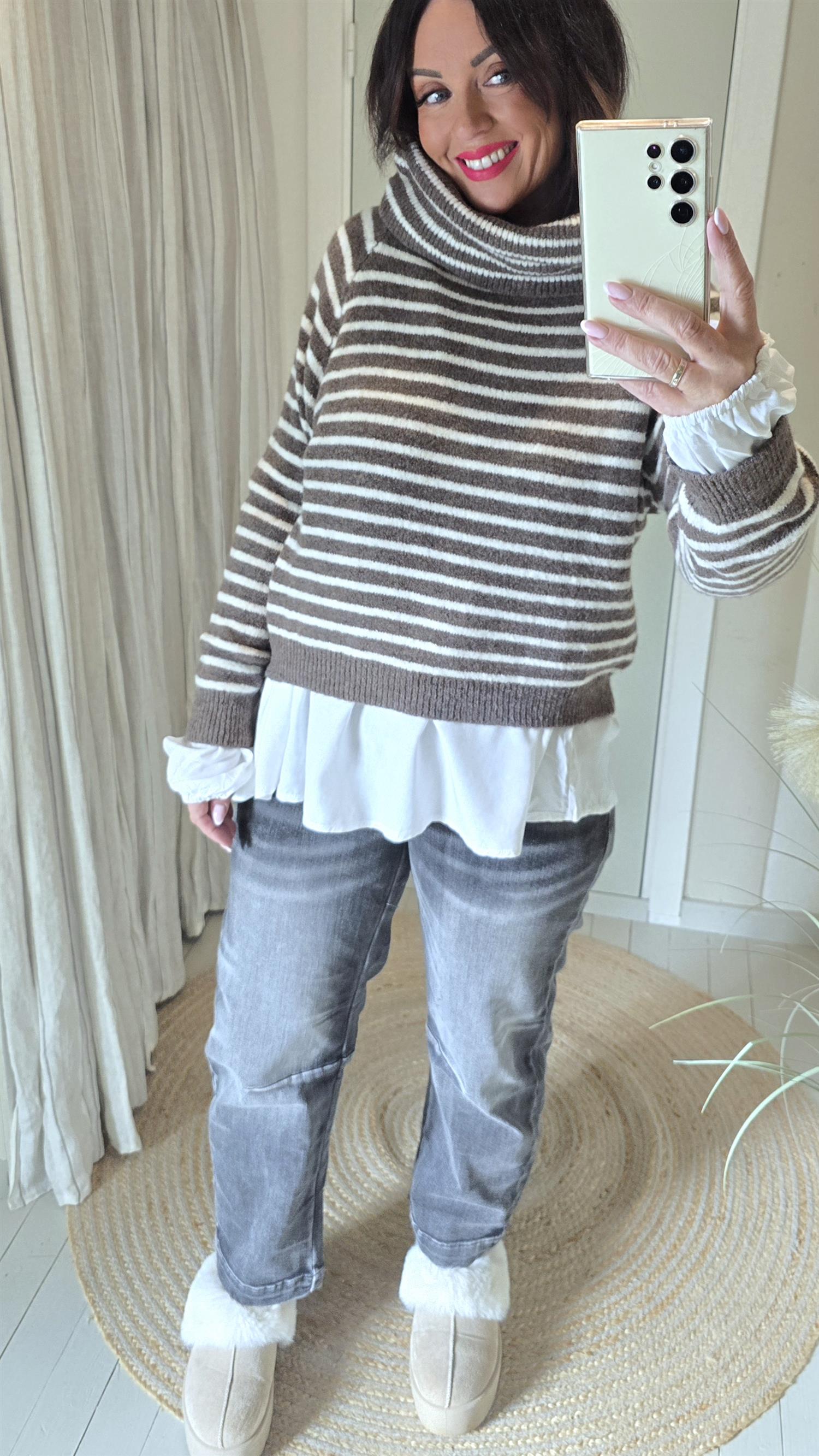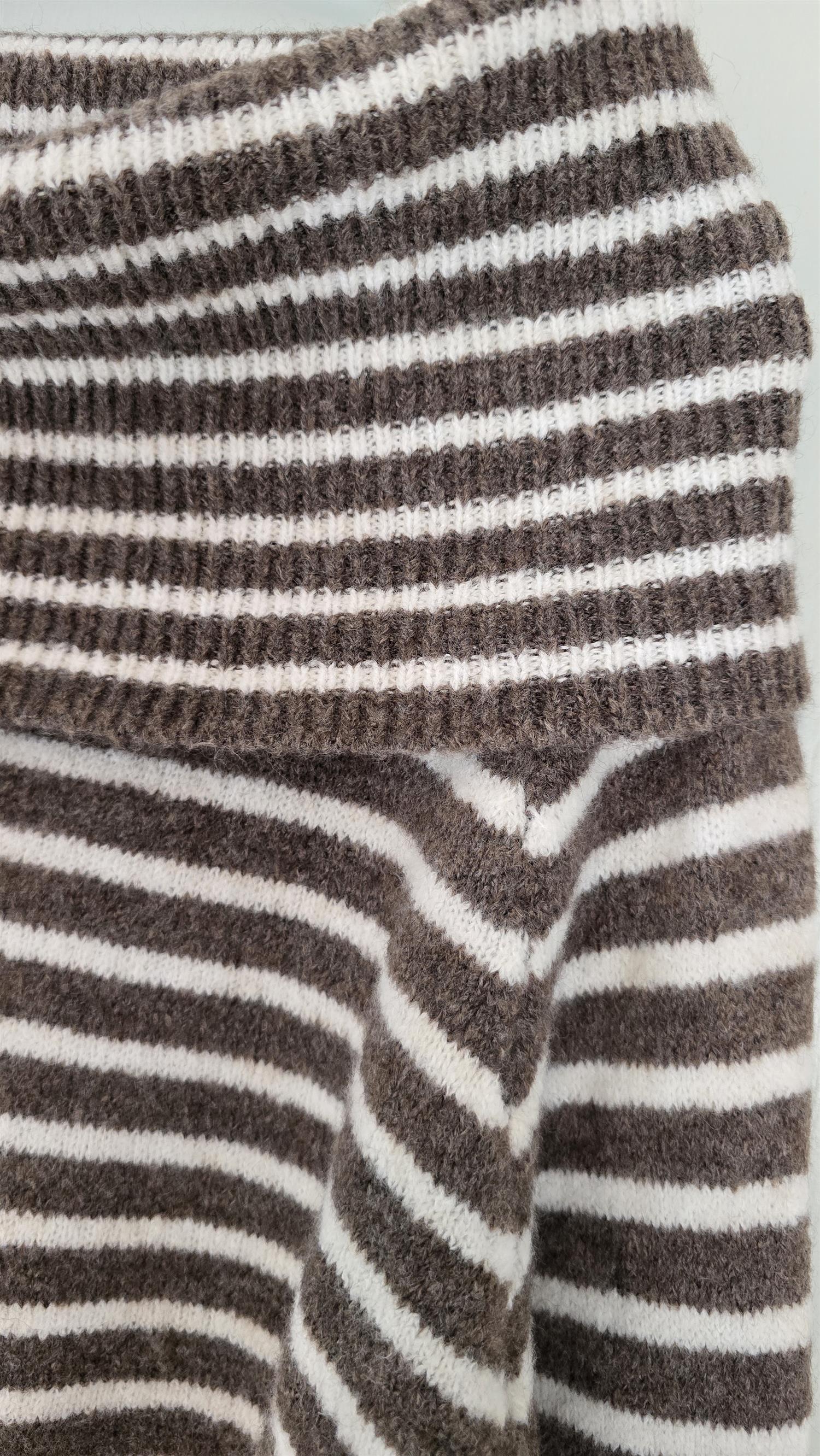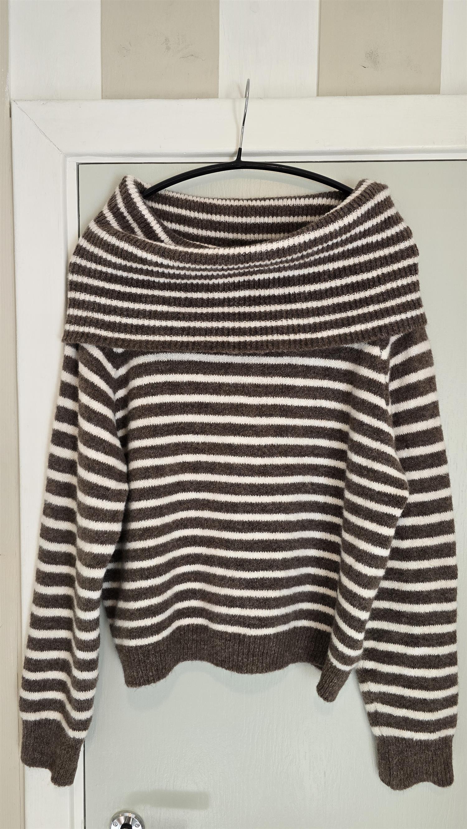 En myk og behagelig genser i strikk med høy hals som også kan bæres off-shoulder. Modellen har lange ermer, klassisk stripemønster og brede ribbkanter både nederst og på ermene. En allsidig genser som enkelt kan styles til både hverdag og en mer pyntet anledning.