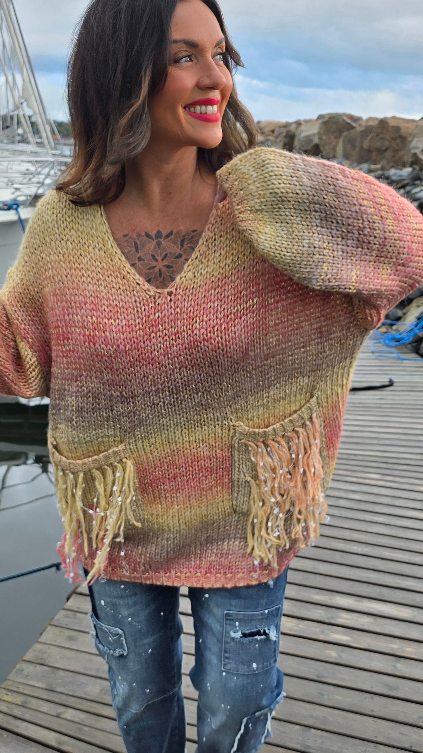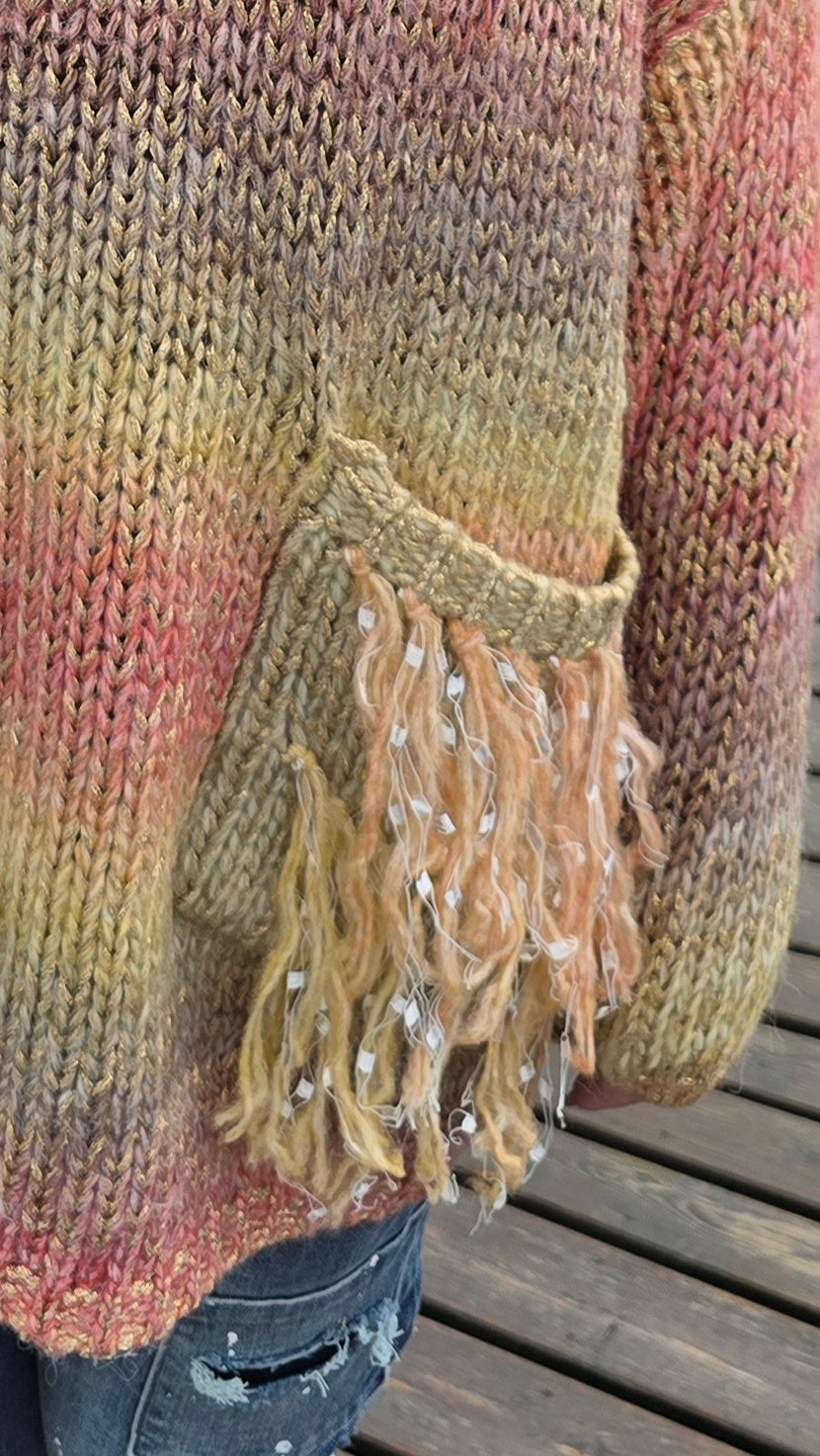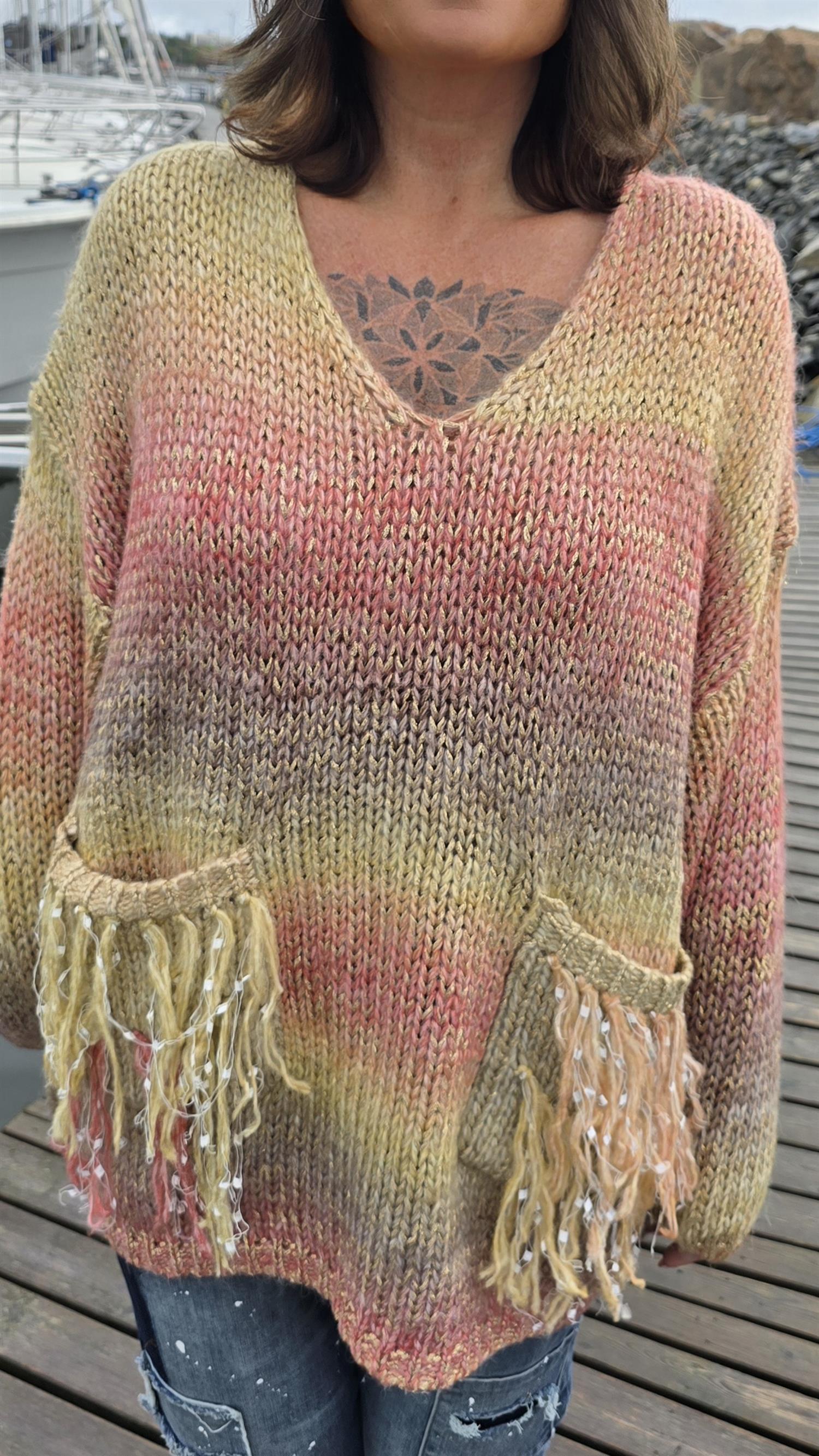 En myk og spennende strikkegenser med dyp V-hals og lange ermer. Den har lommer i front med frynser, og strikken kommer i rosa- og gyldne beigefarger som flyter vakkert inn i hverandre. Gulltråder er strikket inn og gir genseren et ekstra skinn og et unikt uttrykk.