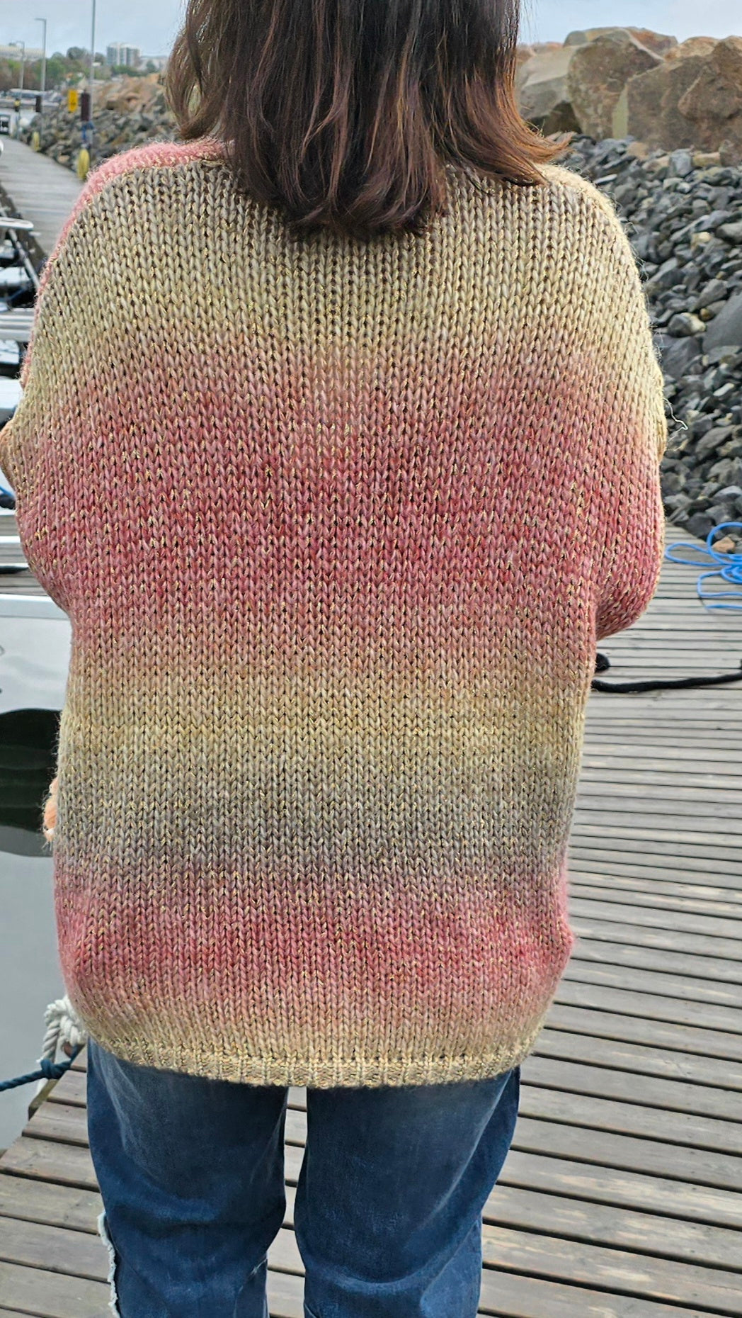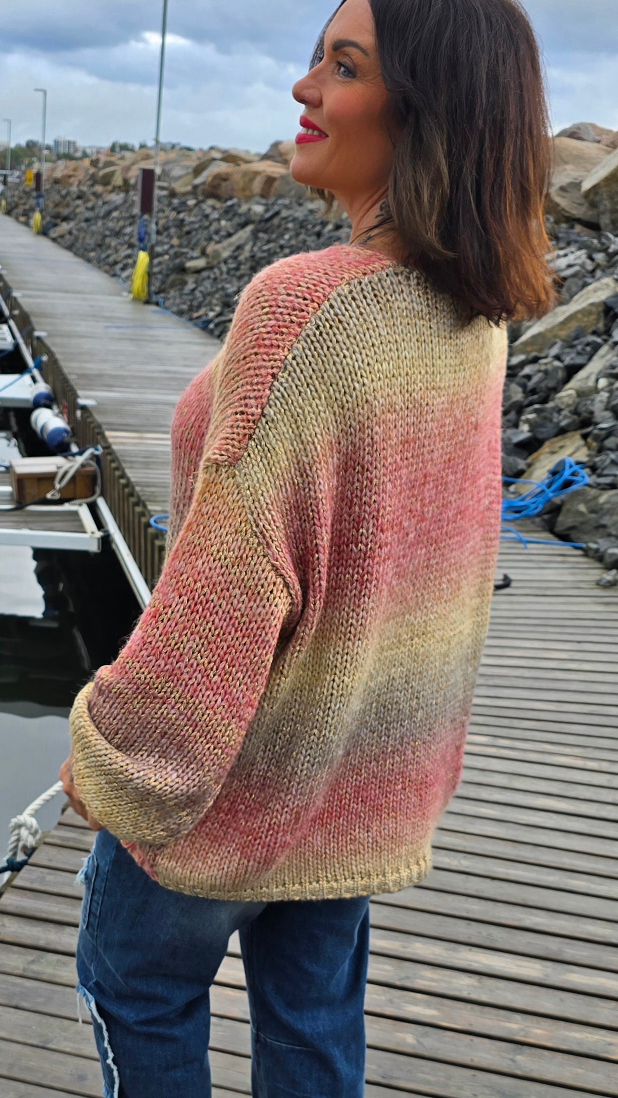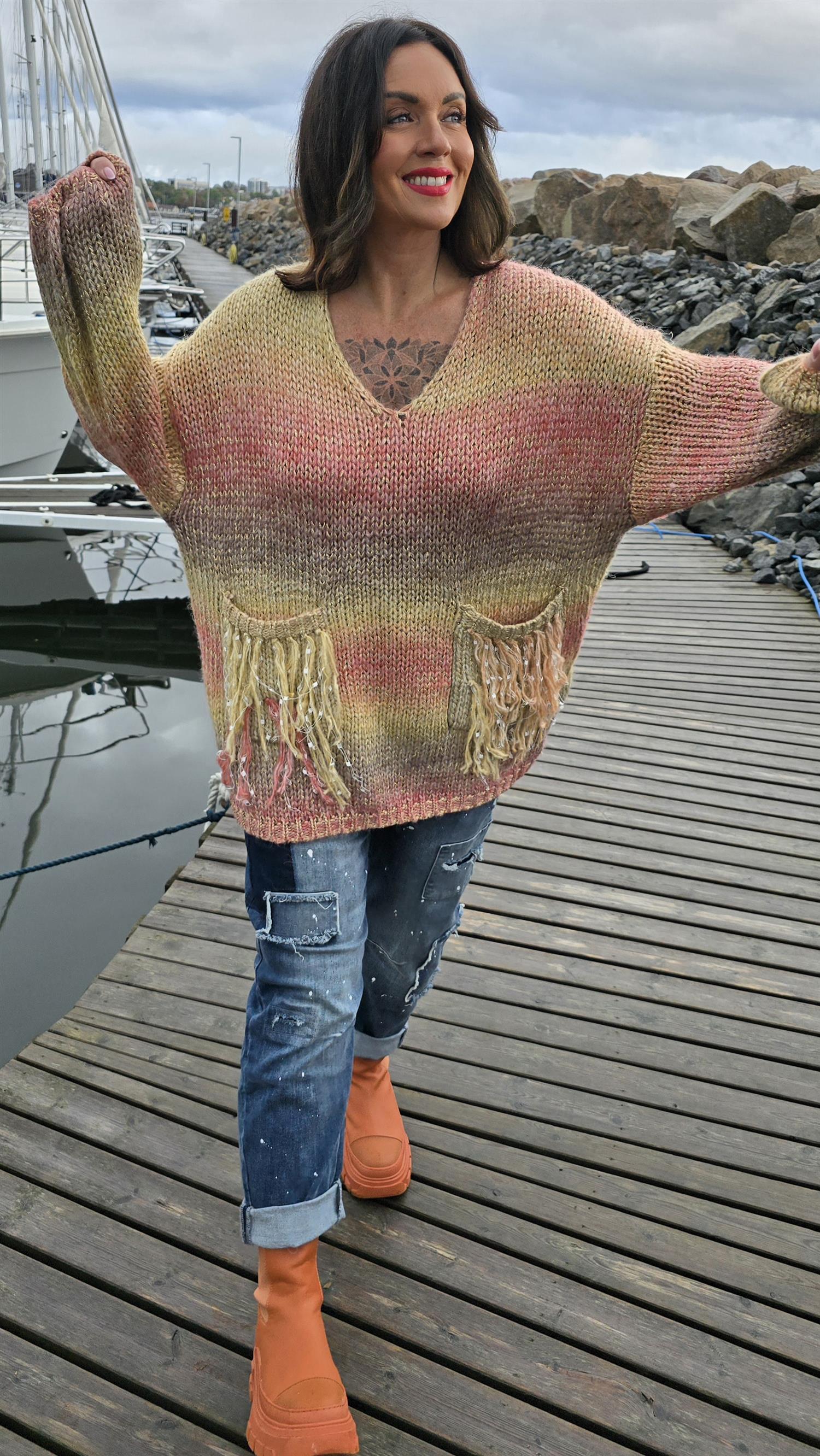 En myk og spennende strikkegenser med dyp V-hals og lange ermer. Den har lommer i front med frynser, og strikken kommer i rosa- og gyldne beigefarger som flyter vakkert inn i hverandre. Gulltråder er strikket inn og gir genseren et ekstra skinn og et unikt uttrykk.