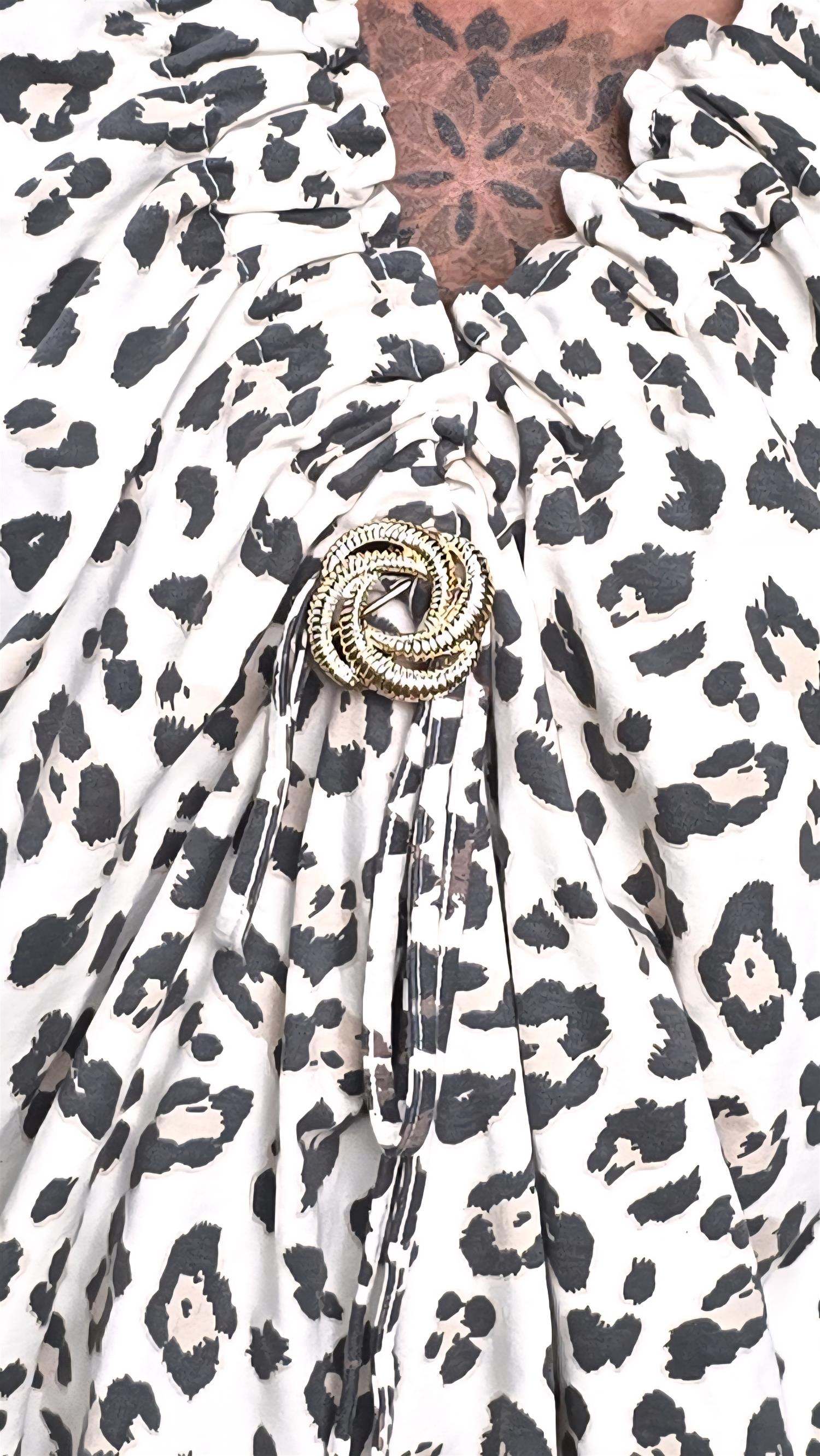 En unik genser i bomull med leoprint på beigefarget bunn. Den har lange ermer som kan brettes opp og festes med knapp, samt en bred V-hals med strikk som gir en behagelig og flatterende fasong. Genseren leveres også med en dekorativ brosje uten nål, laget spesielt for å brukes sammen med plagget, men kan tas av.