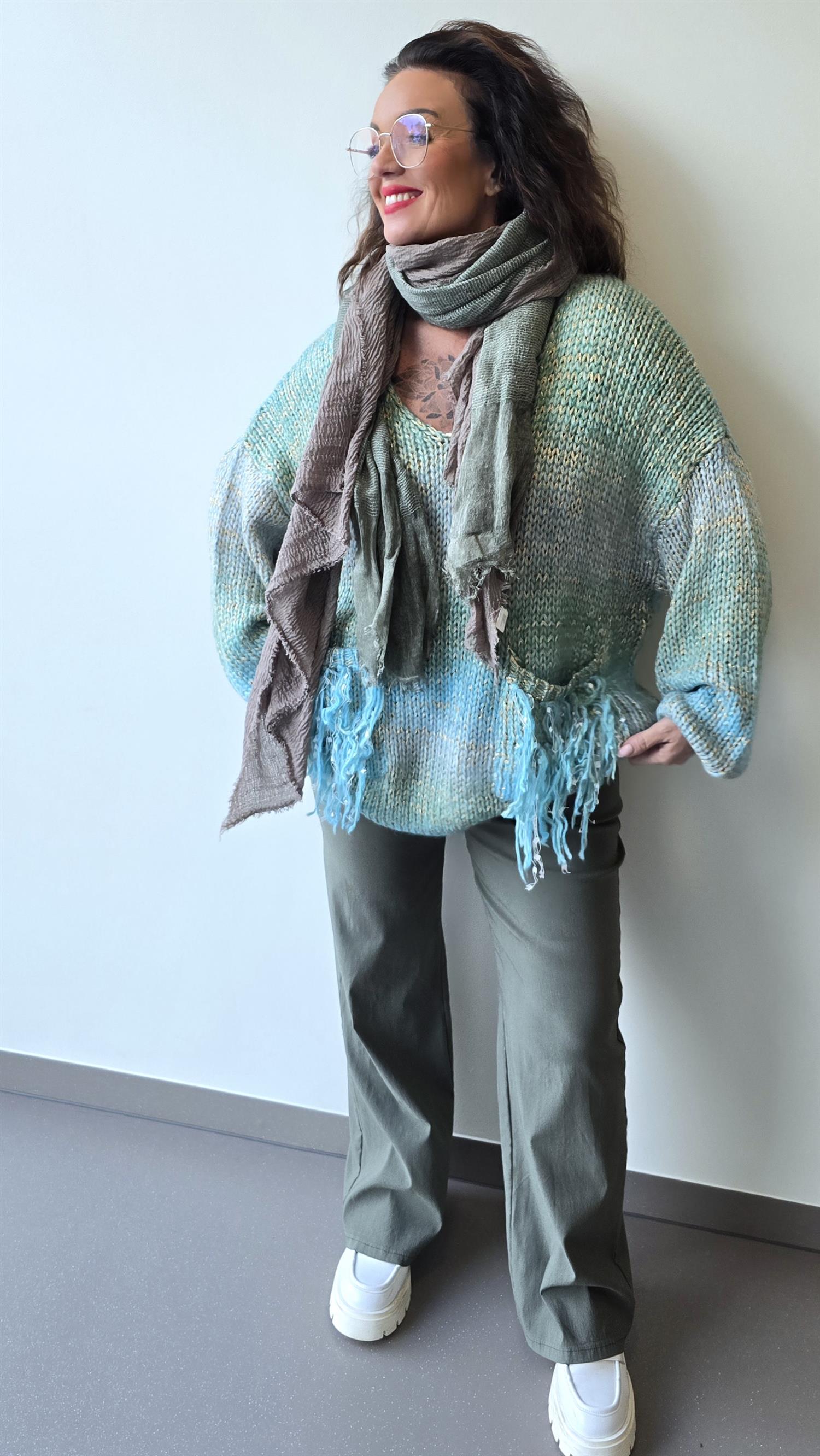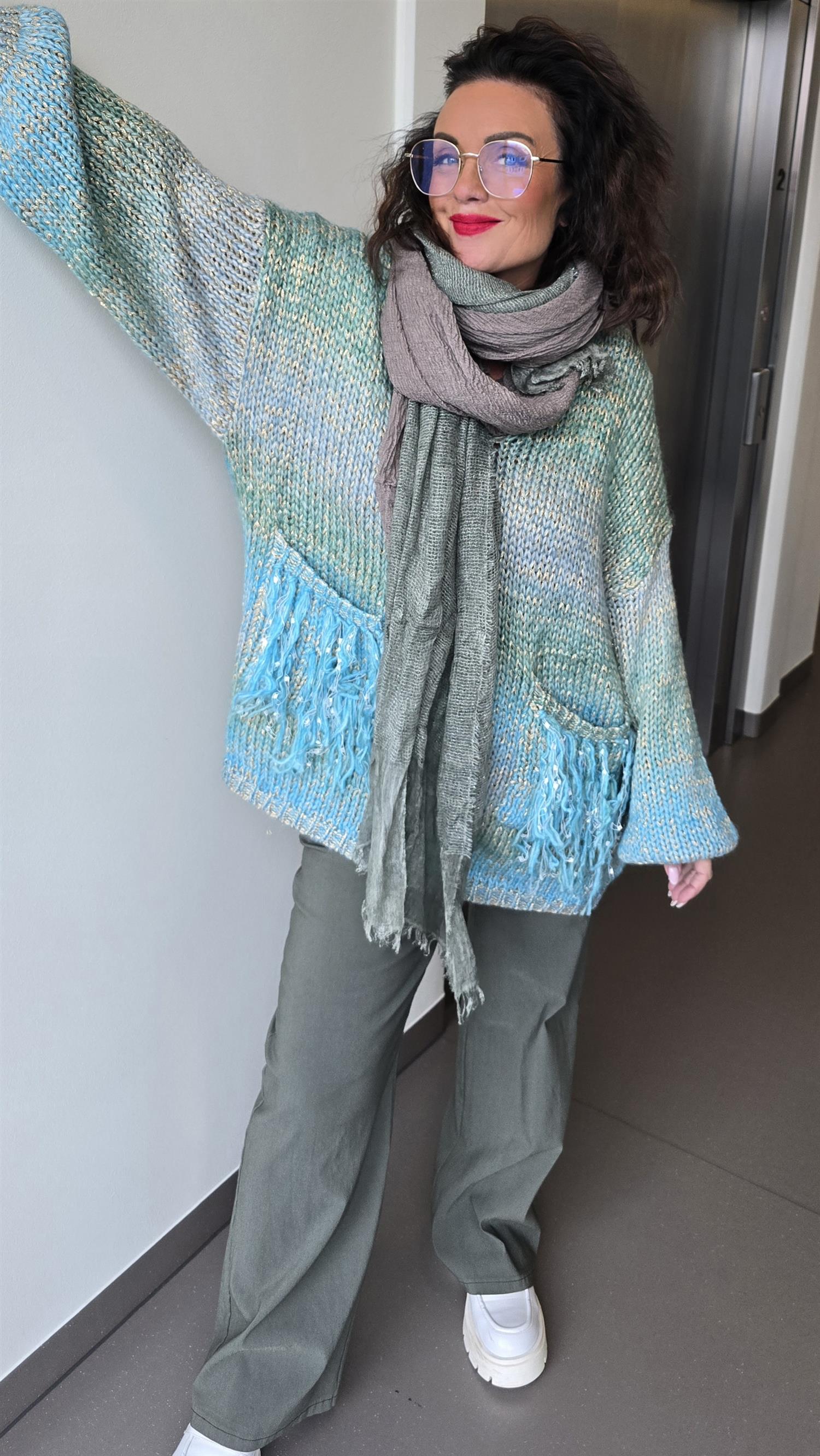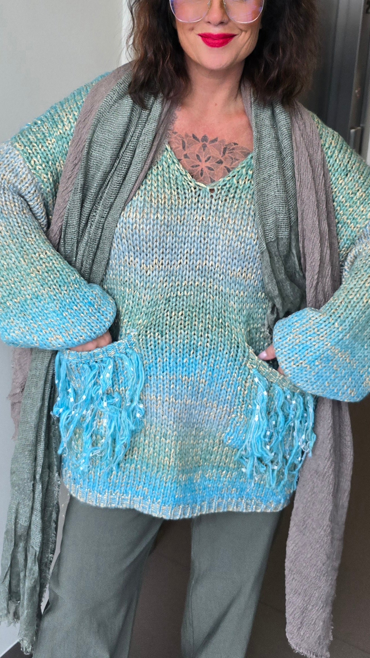 En myk og spennende strikkegenser med dyp V-hals og lange ermer. Den har lommer i front med frynser, og strikken er laget i blå- og grønn-toner som toner over i hverandre. Små gulltråder er tilfeldig strikket inn og gir genseren et lekent og unikt uttrykk.