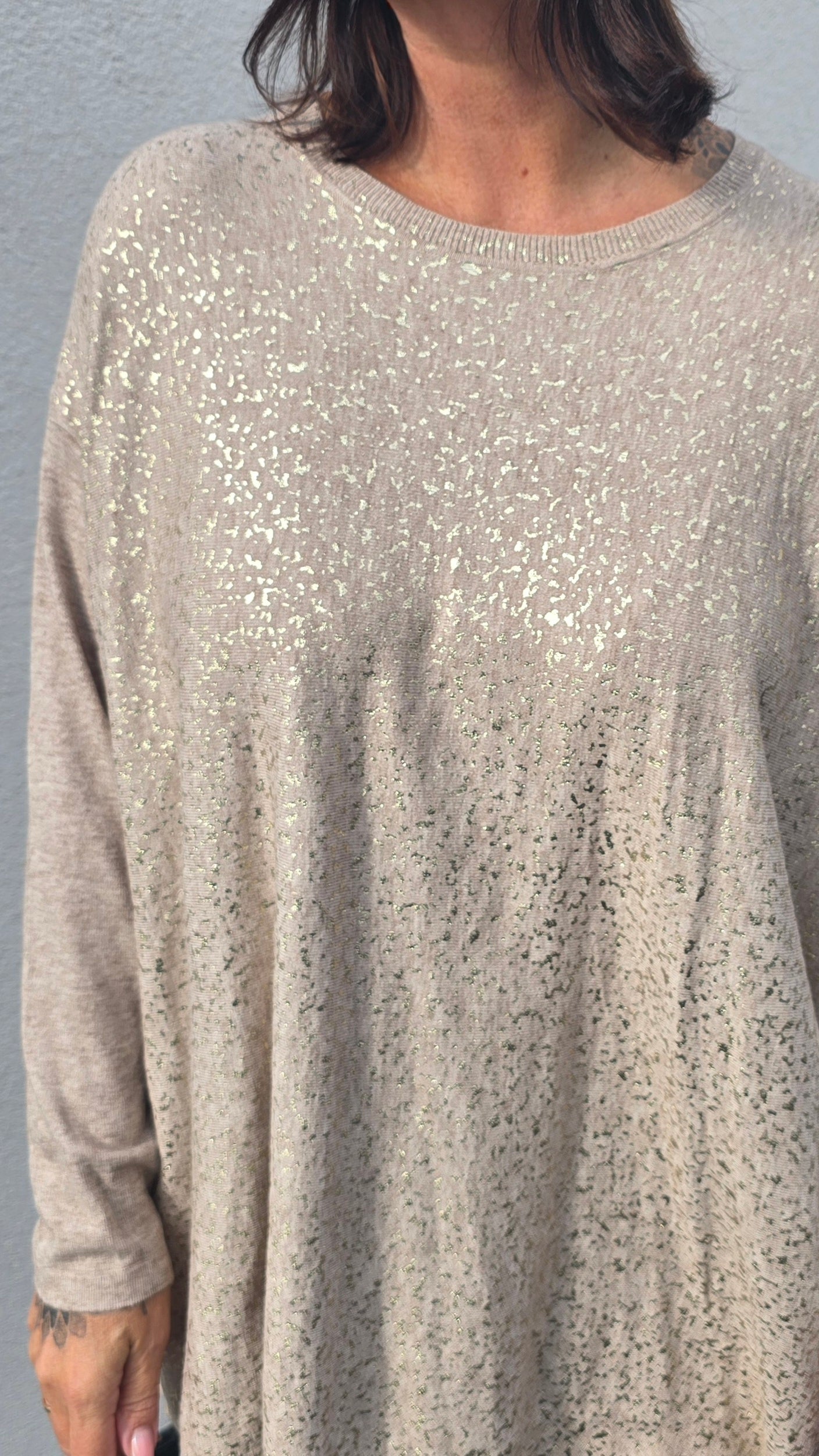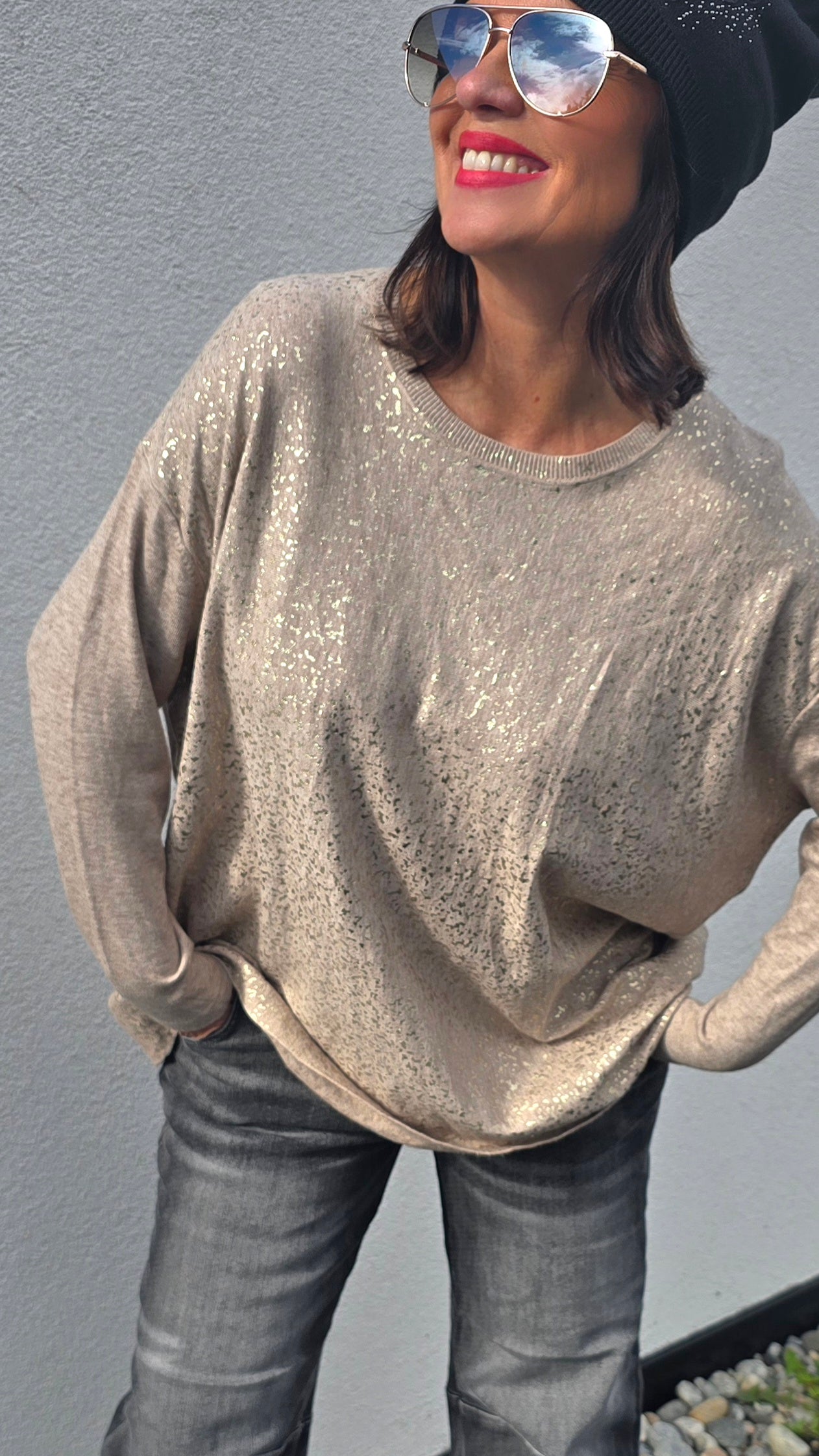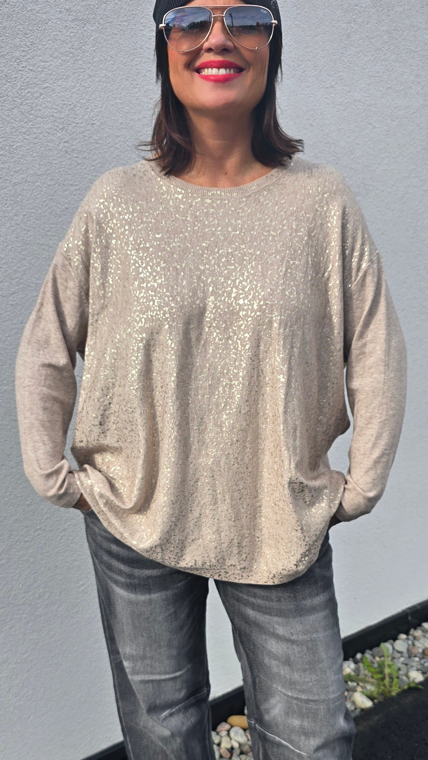 Mjuk skön genser med guld print I front. Rund hals. Långa armar.