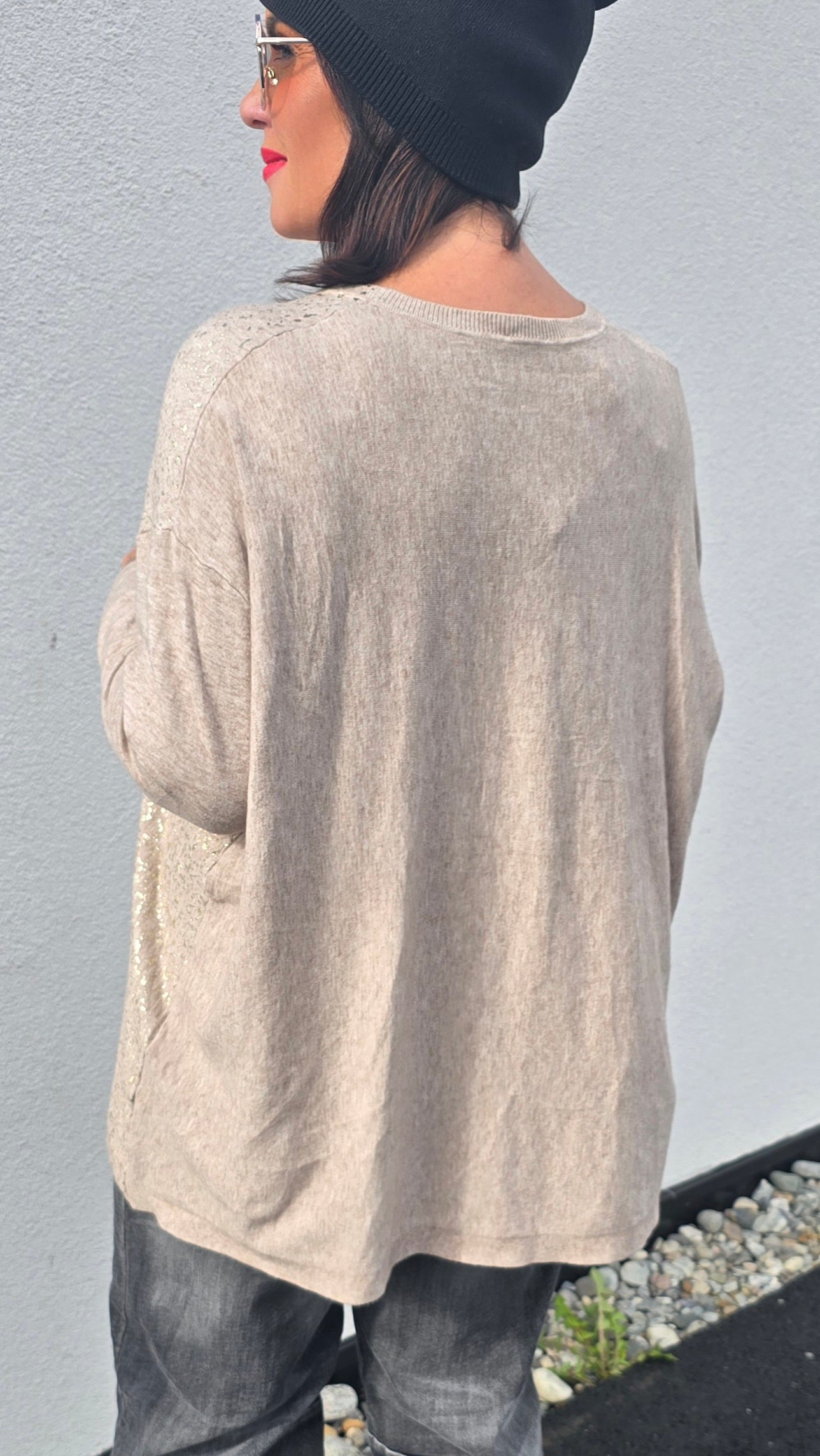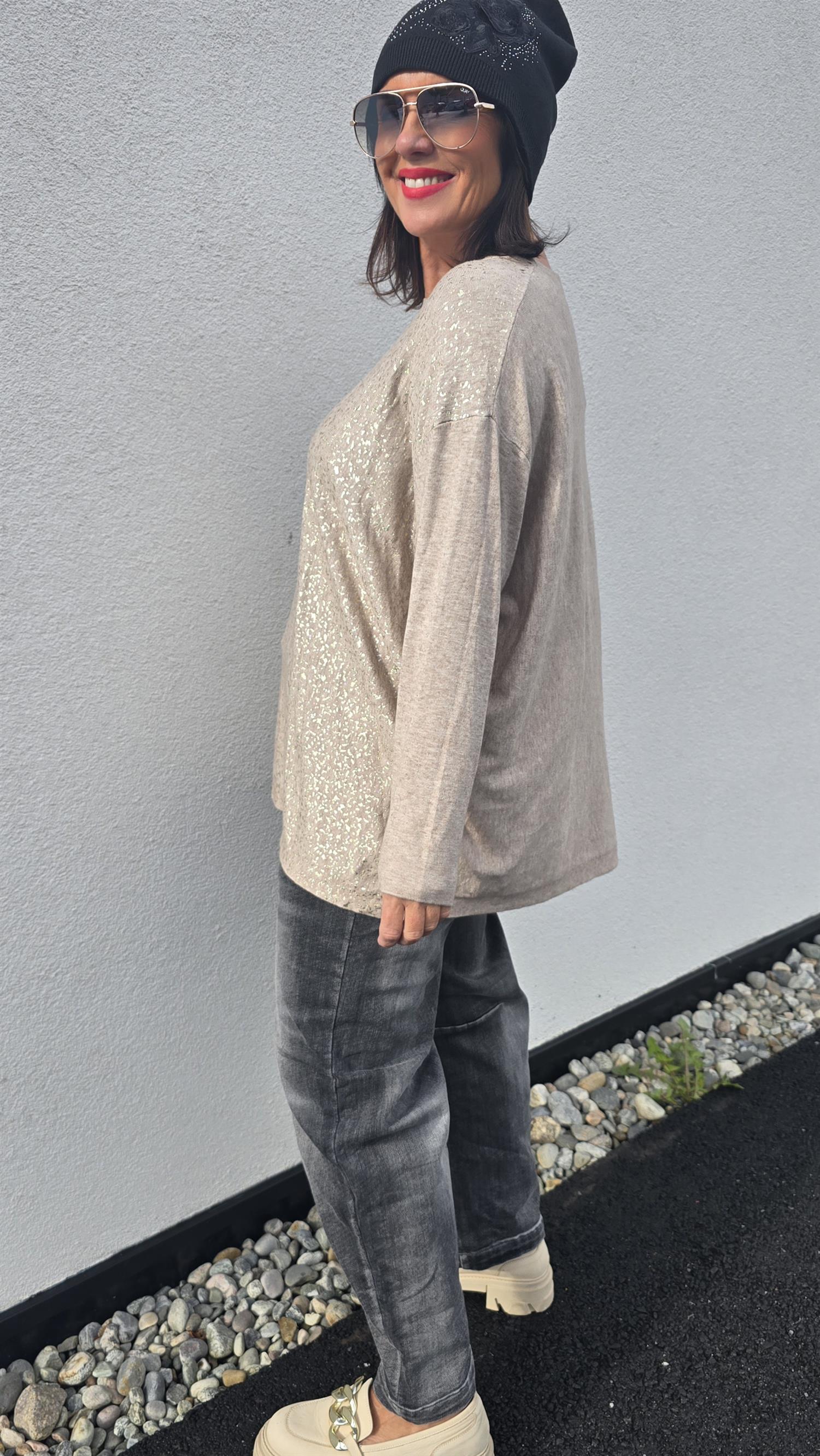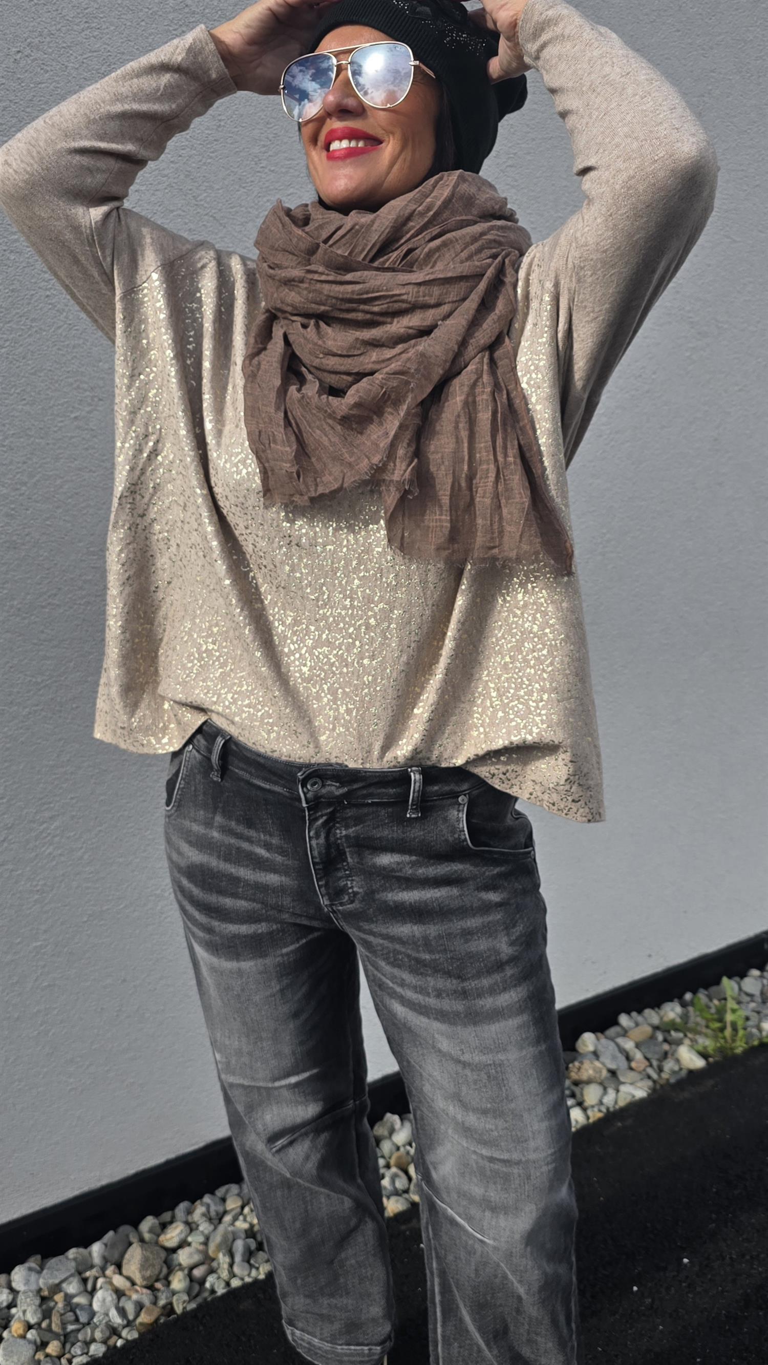 Mjuk skön genser med guld print I front. Rund hals. Långa armar.
