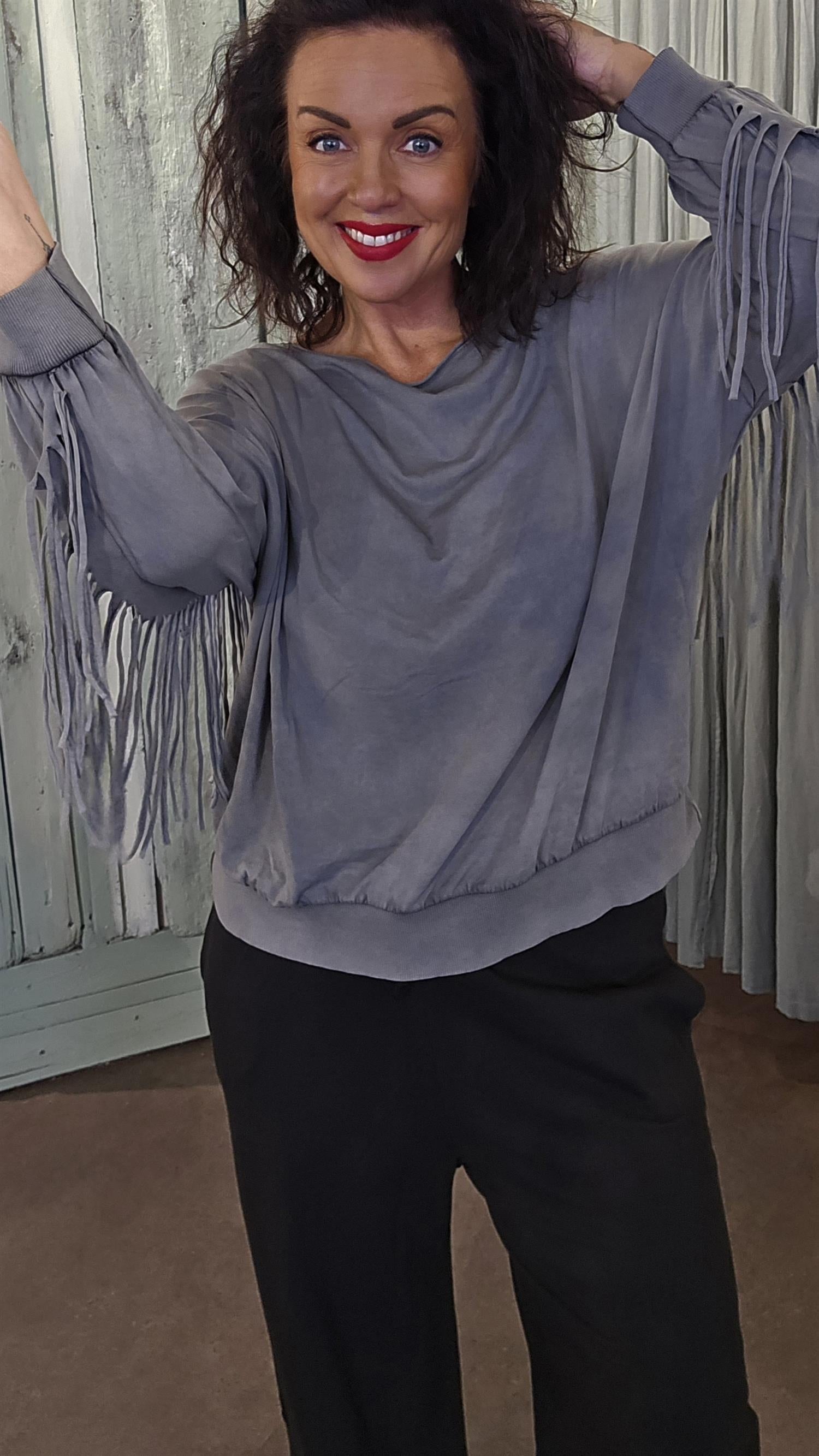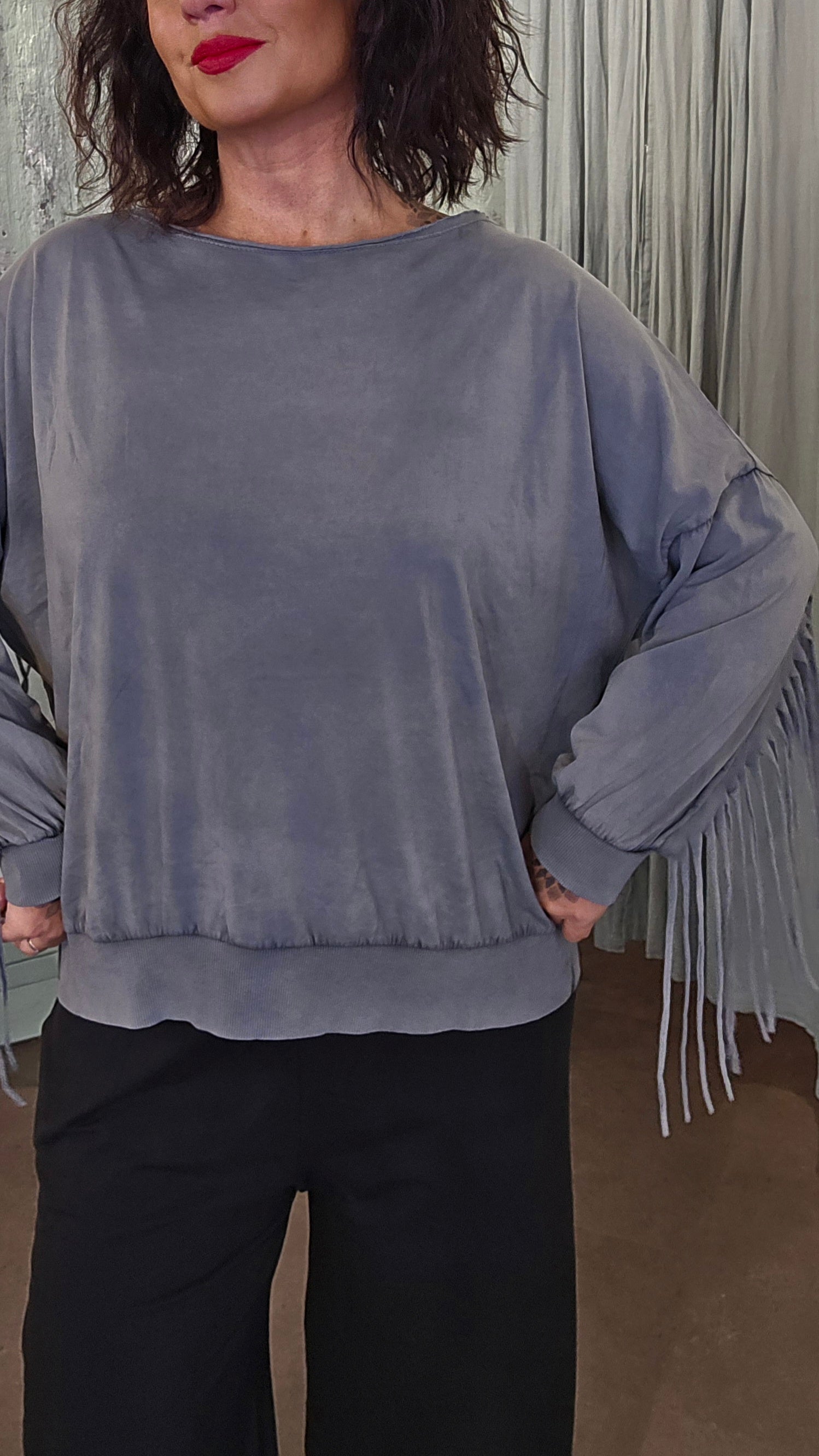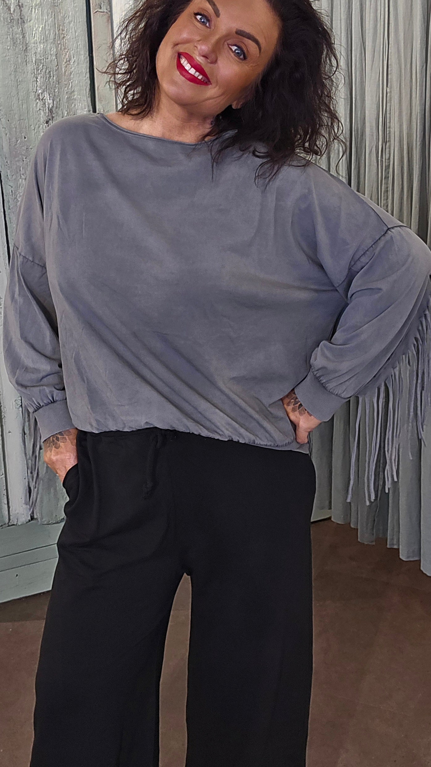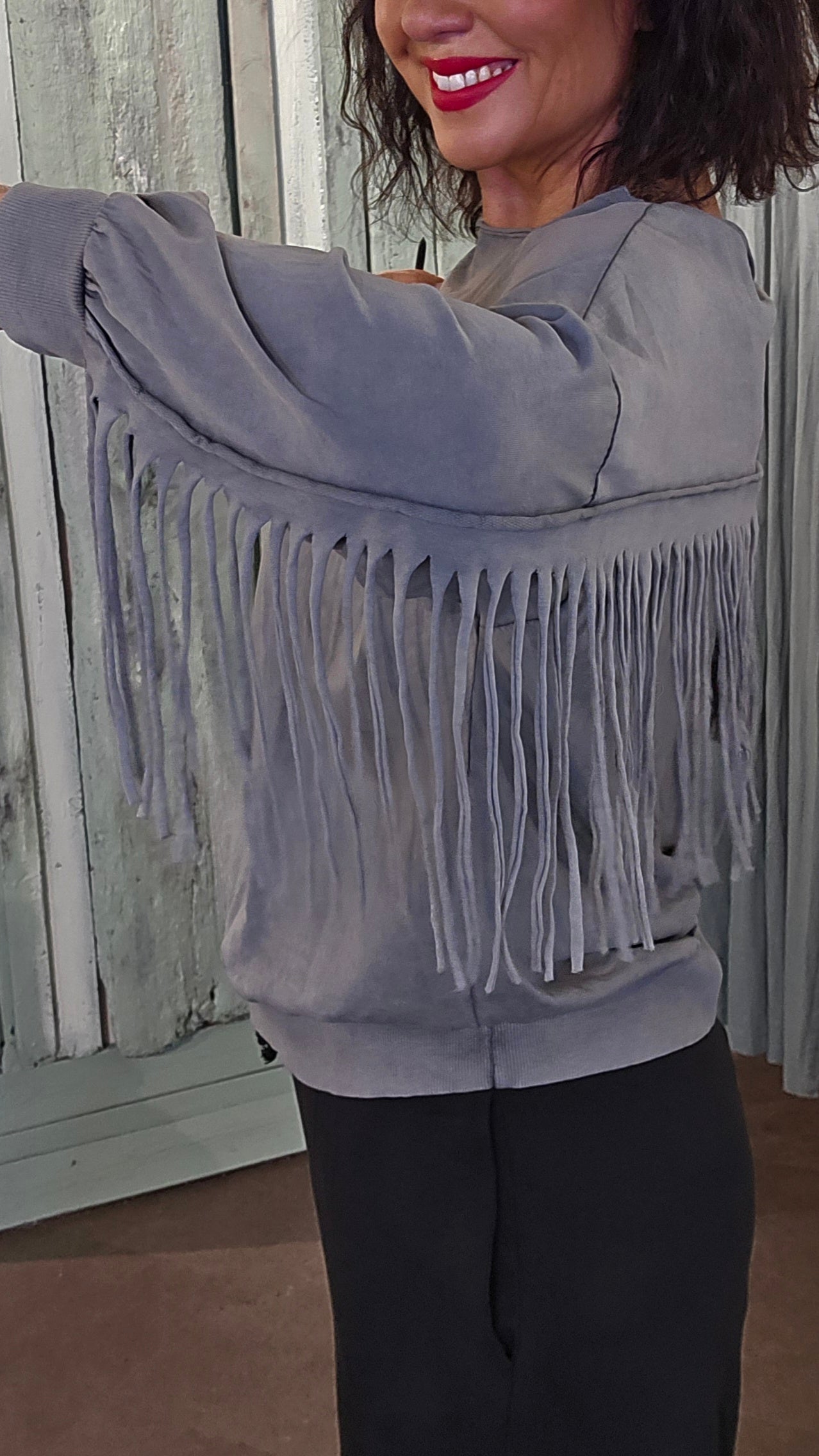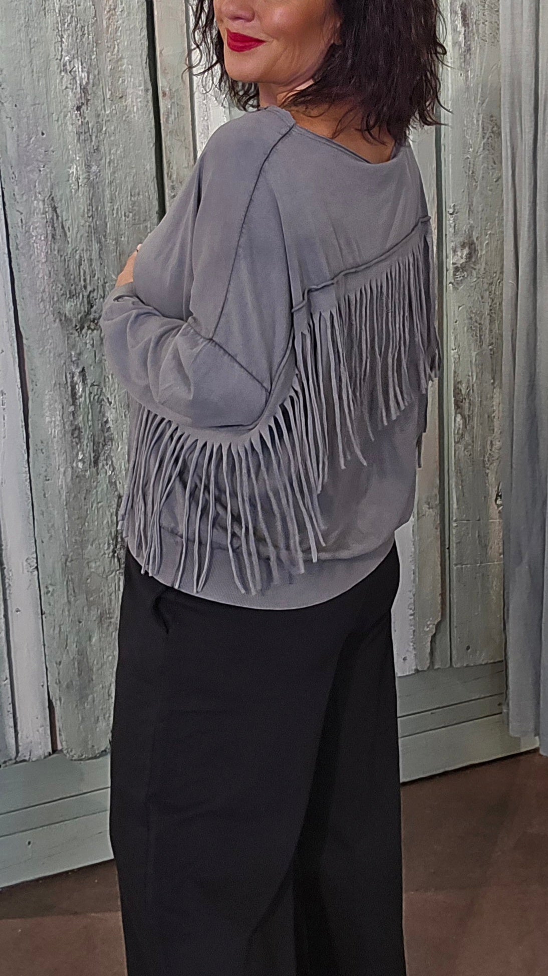 Kanonfin topp från Cabana Living med fransar bak på armen och ryggen. Extra bred ribbad kant nederst. Båthals. Tunn och så lätt och skön att ha på sig. Långa armar.