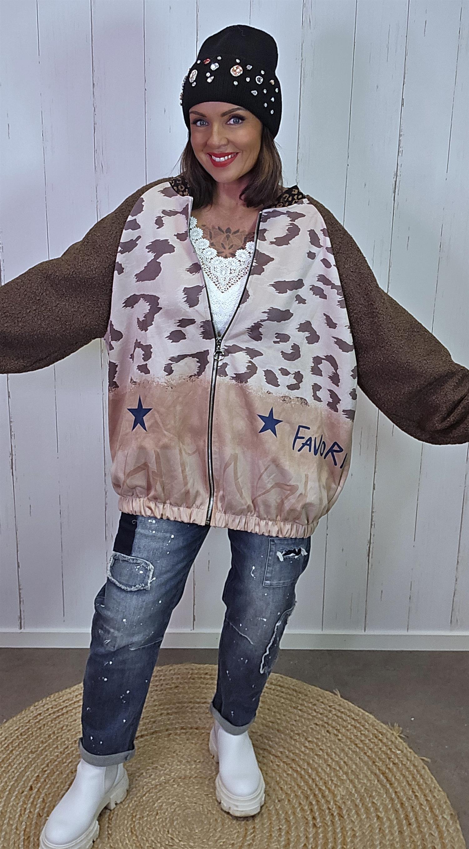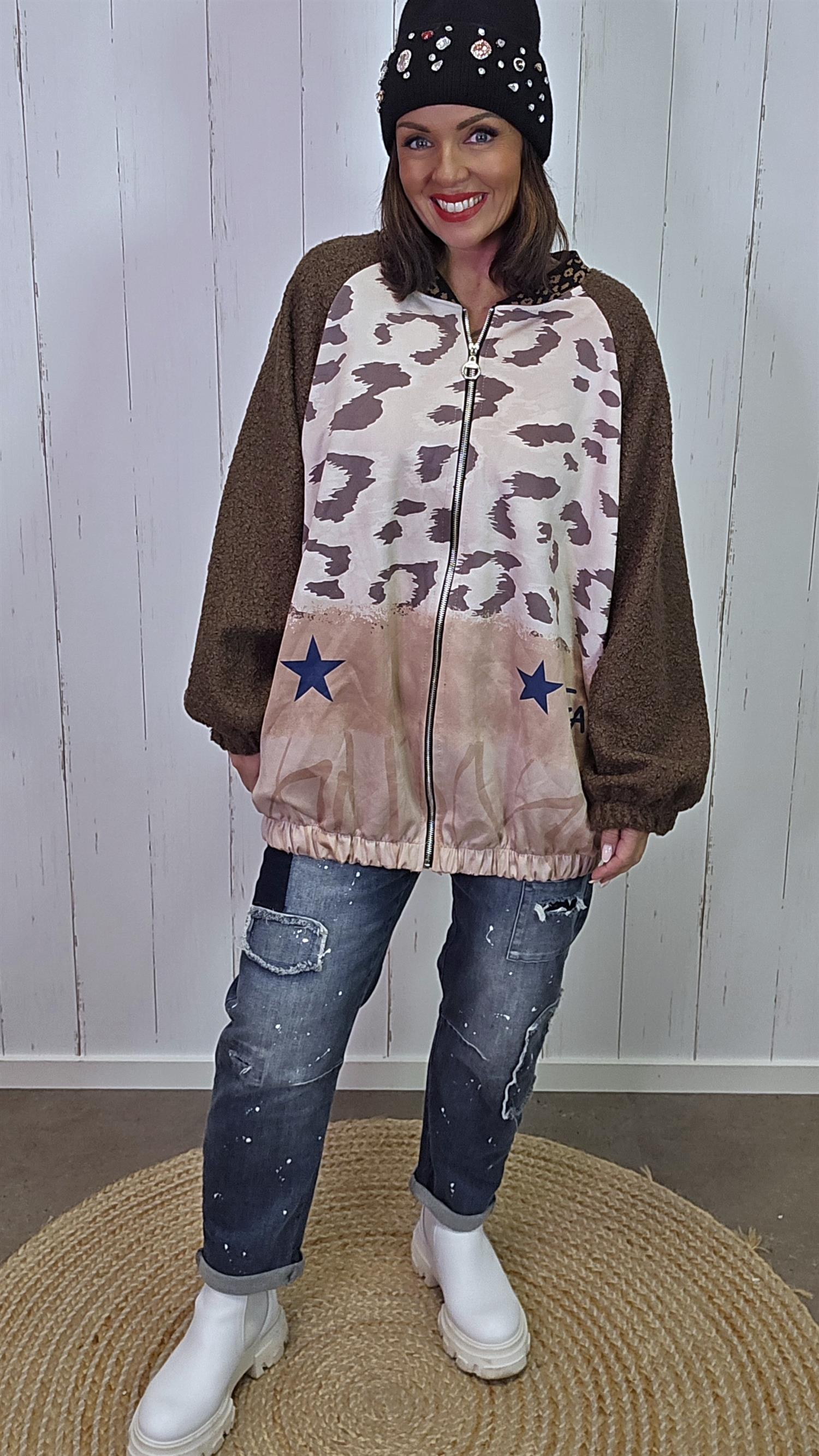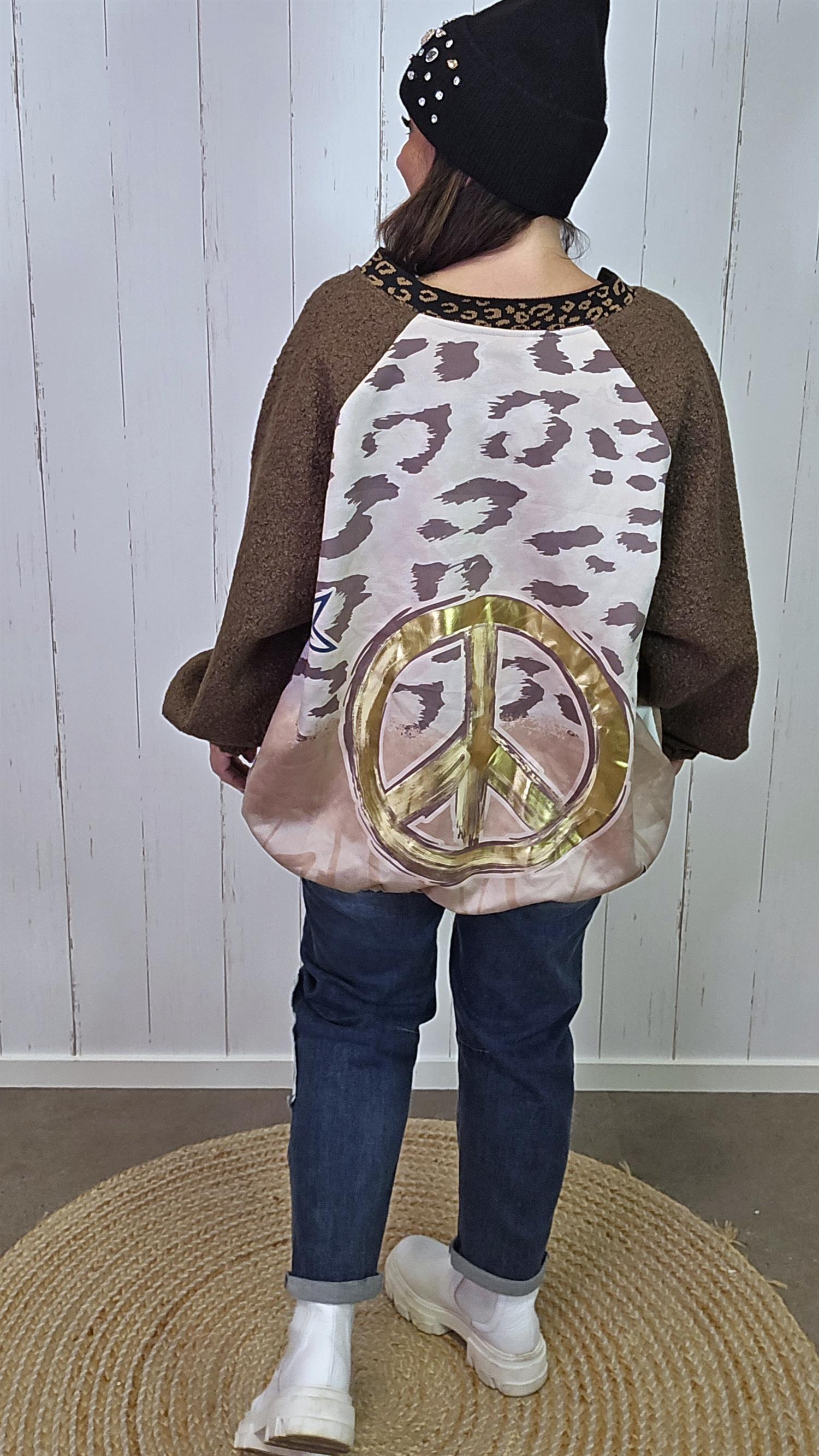 En råkul jakke med teddy-materiale på armene og mykt stoff på utsiden. Den har glidelås i front, lommer i siden og et stort peace-merke på ryggen som gir et unikt og tøft uttrykk. Jakken har lange ermer med strikk nederst, samt bred strikk nederst på selve jakken for en god og flatterende passform.