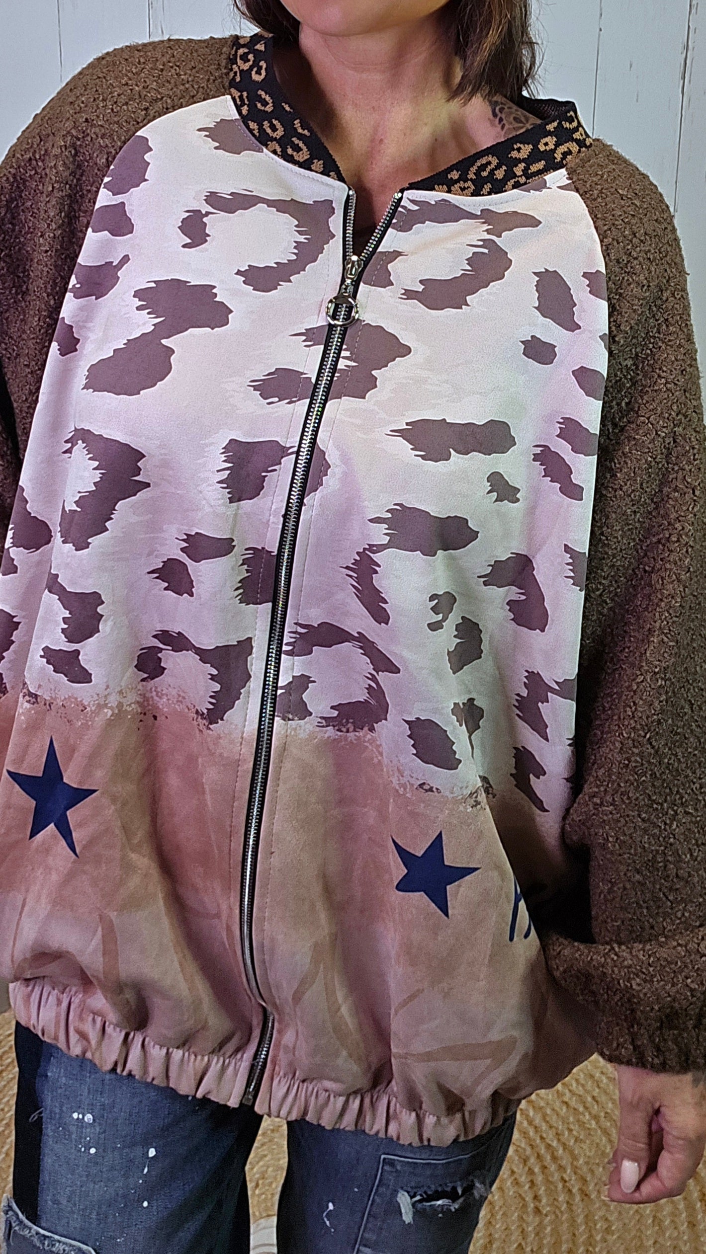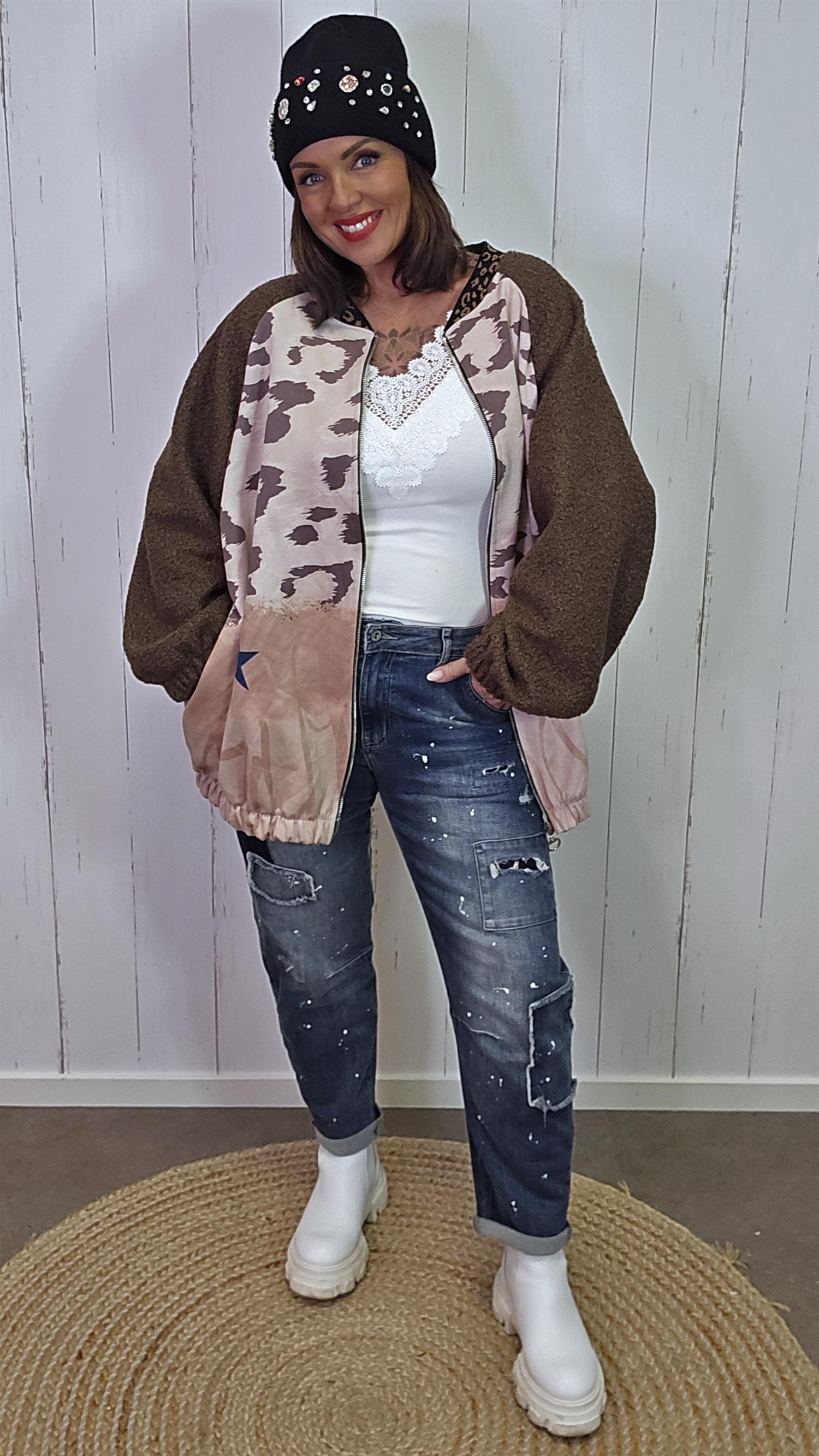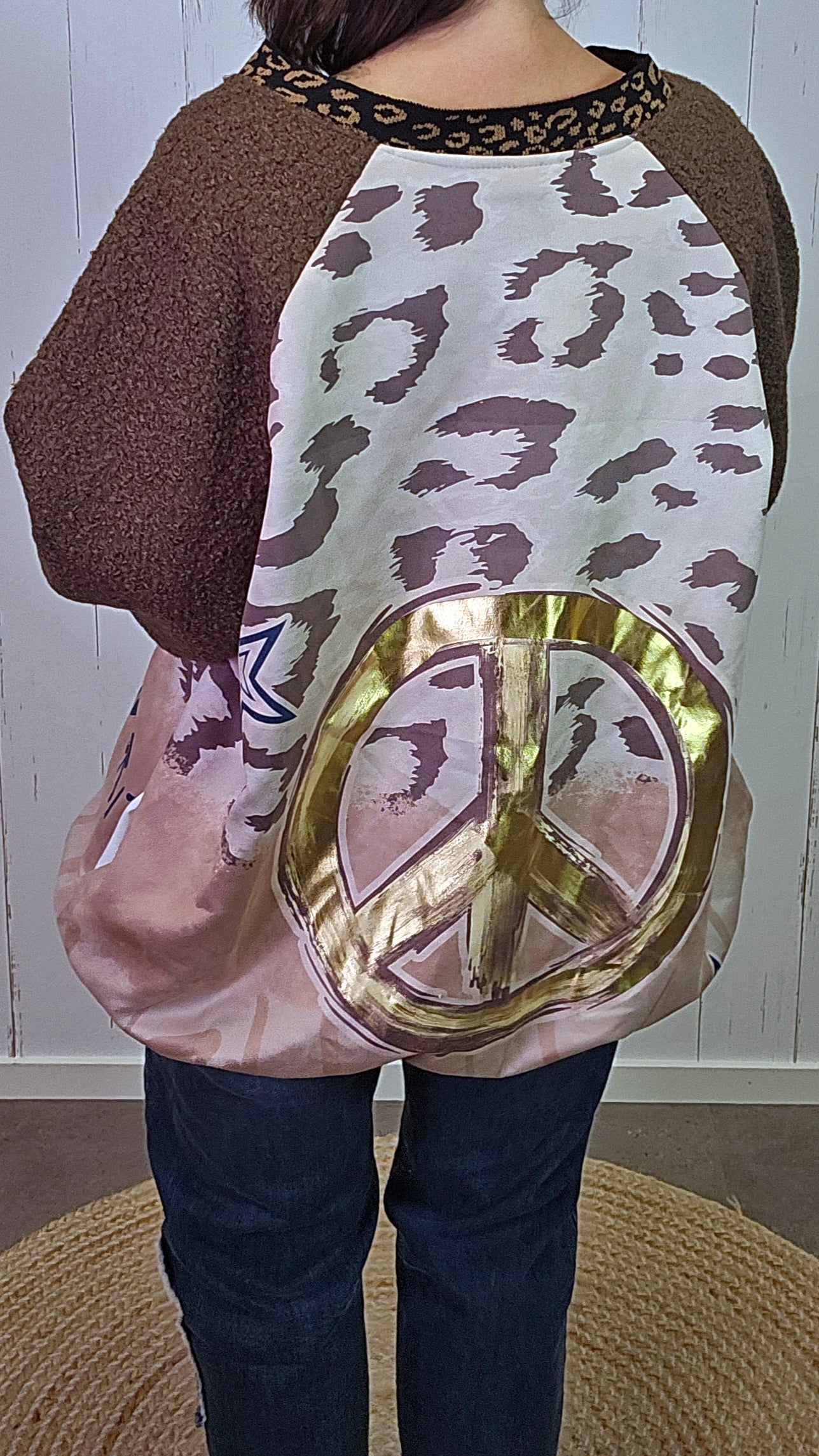 En råkul jakke med teddy-materiale på armene og mykt stoff på utsiden. Den har glidelås i front, lommer i siden og et stort peace-merke på ryggen som gir et unikt og tøft uttrykk. Jakken har lange ermer med strikk nederst, samt bred strikk nederst på selve jakken for en god og flatterende passform.
