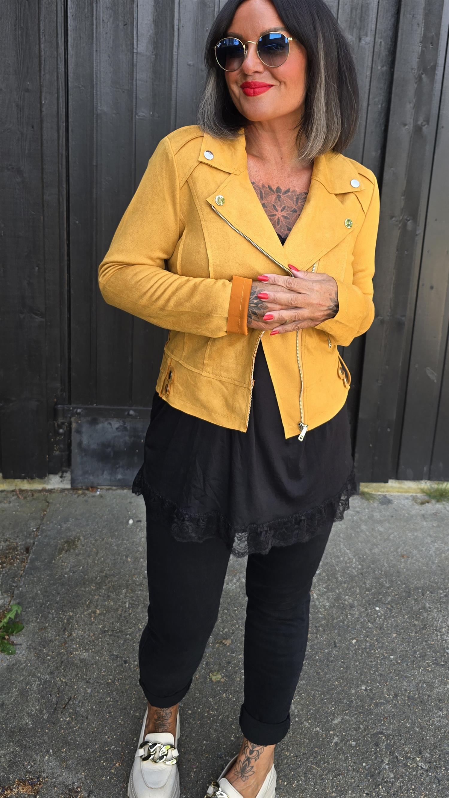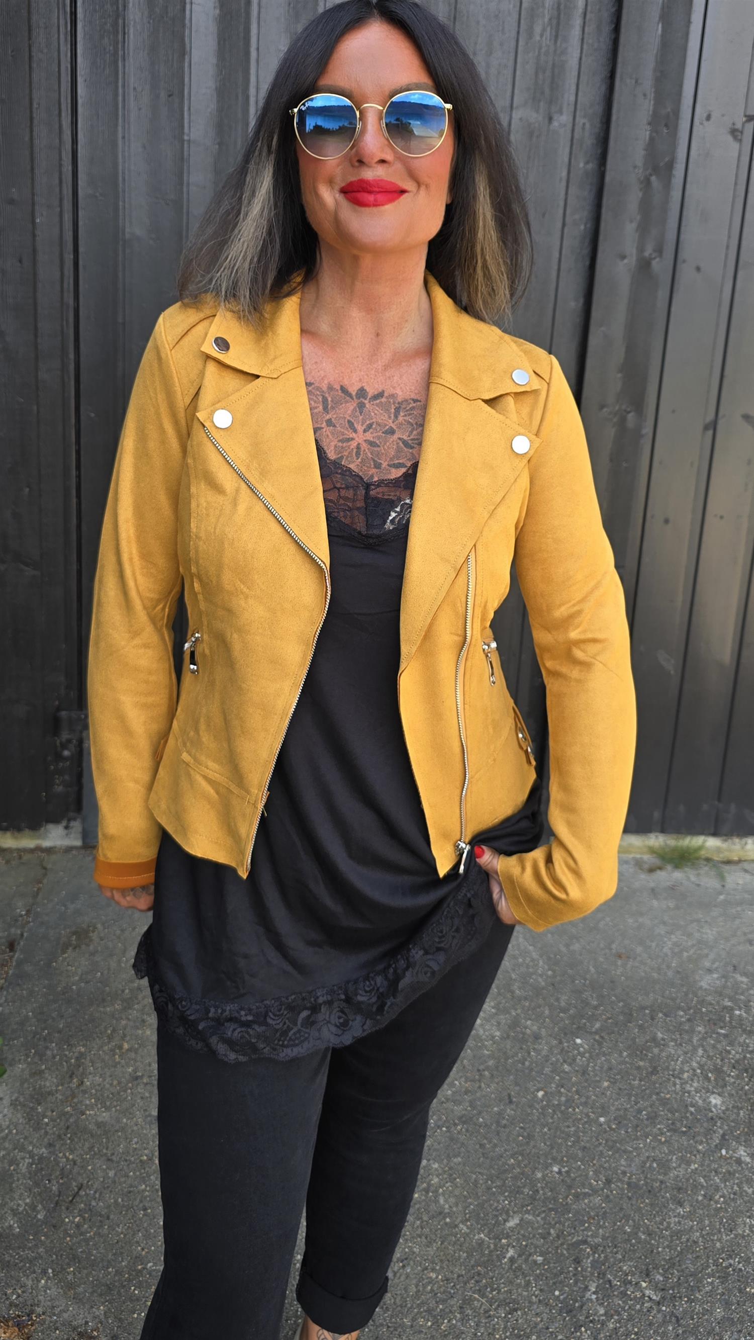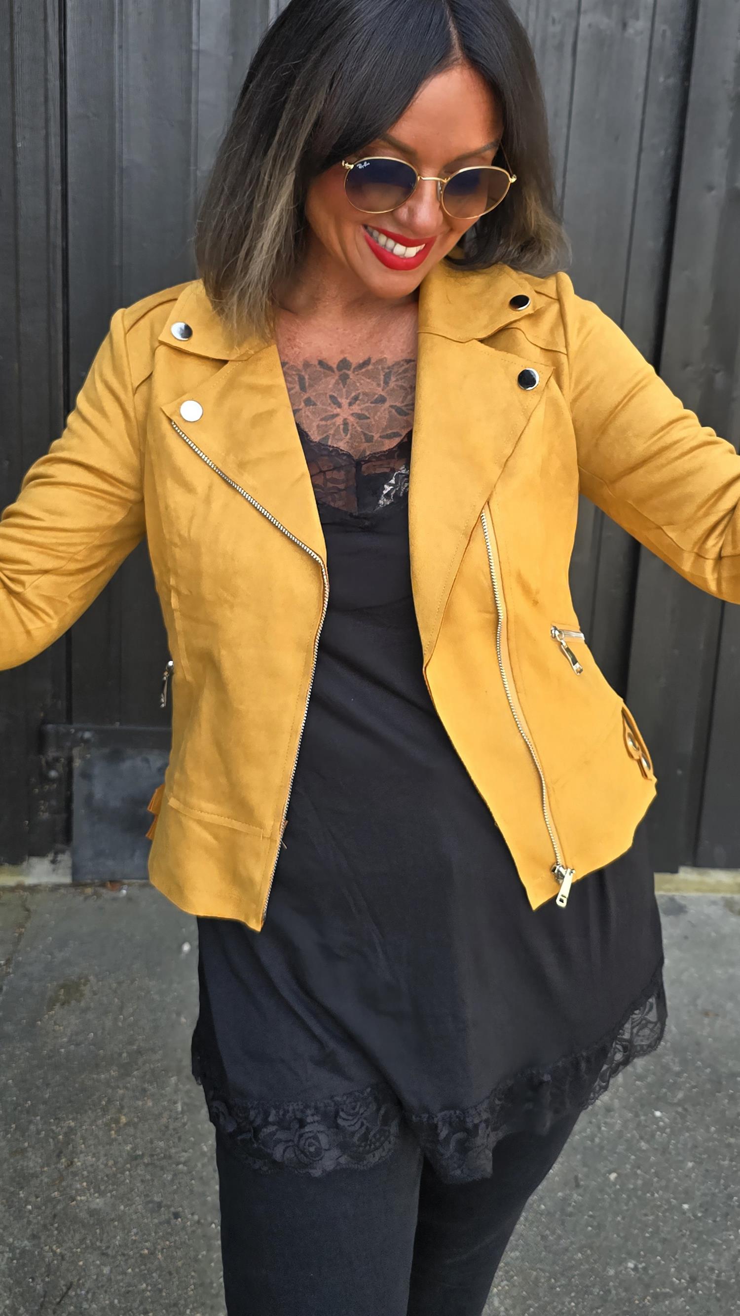 Stretchig jakka med fina detaljer. Fake skinn look. Glidelås I front. Fin passform över bysten. Normal I str. Men vill man ha den mer lös på ta en str större.
