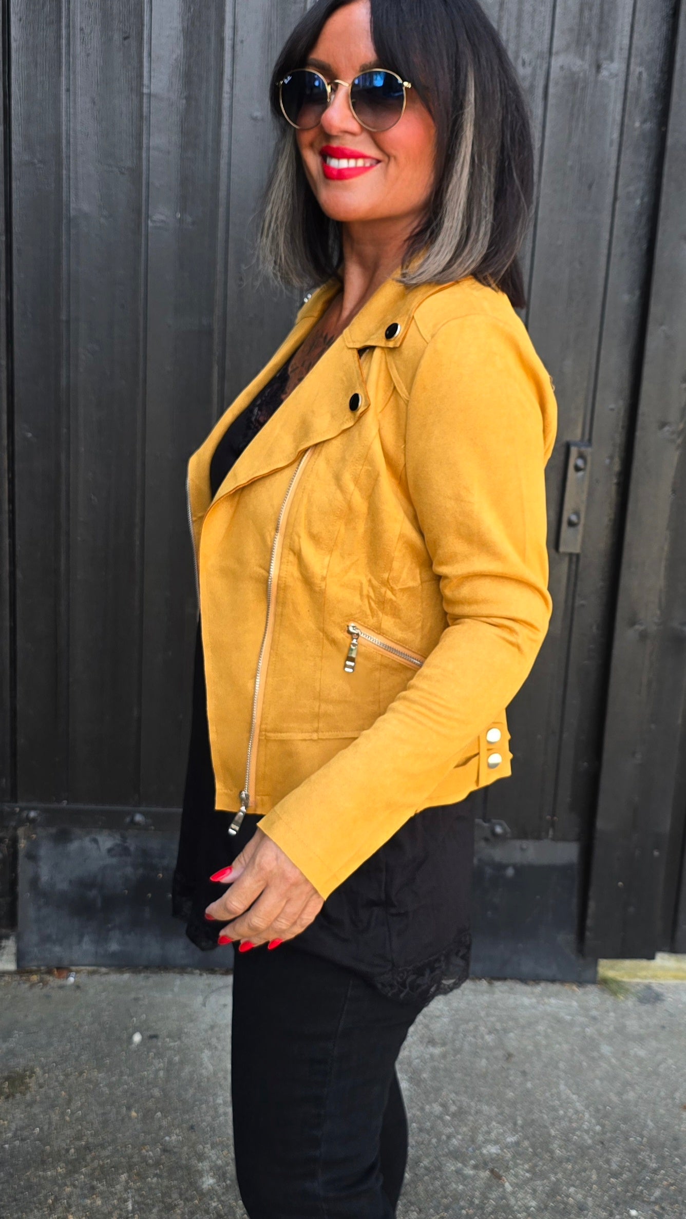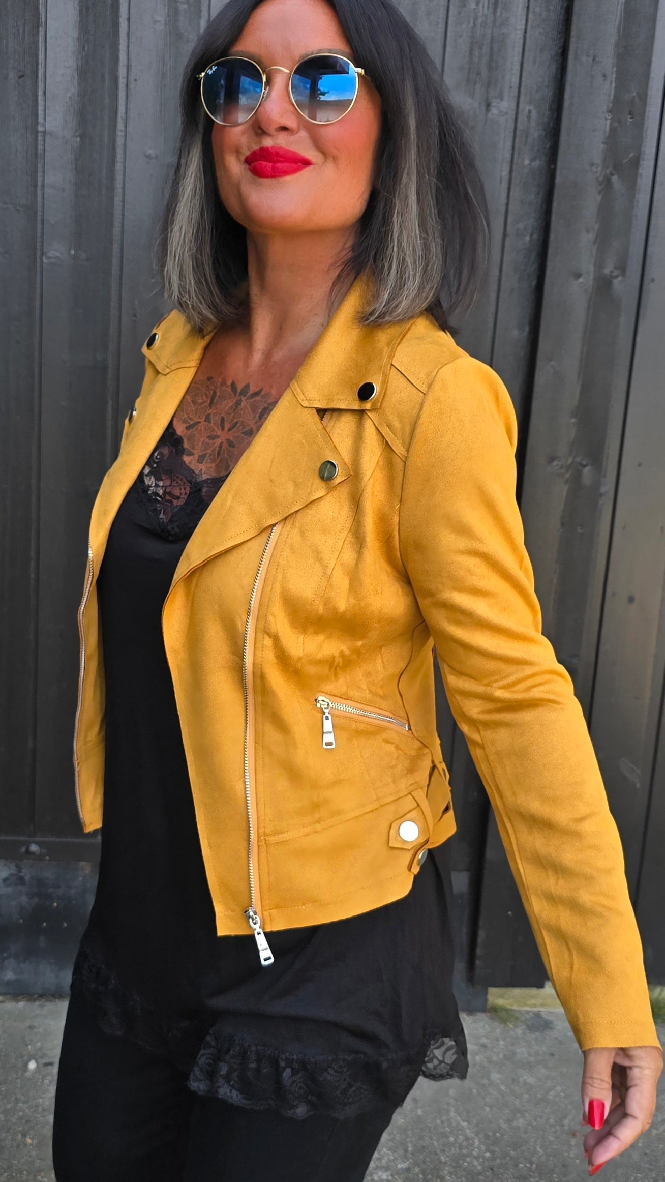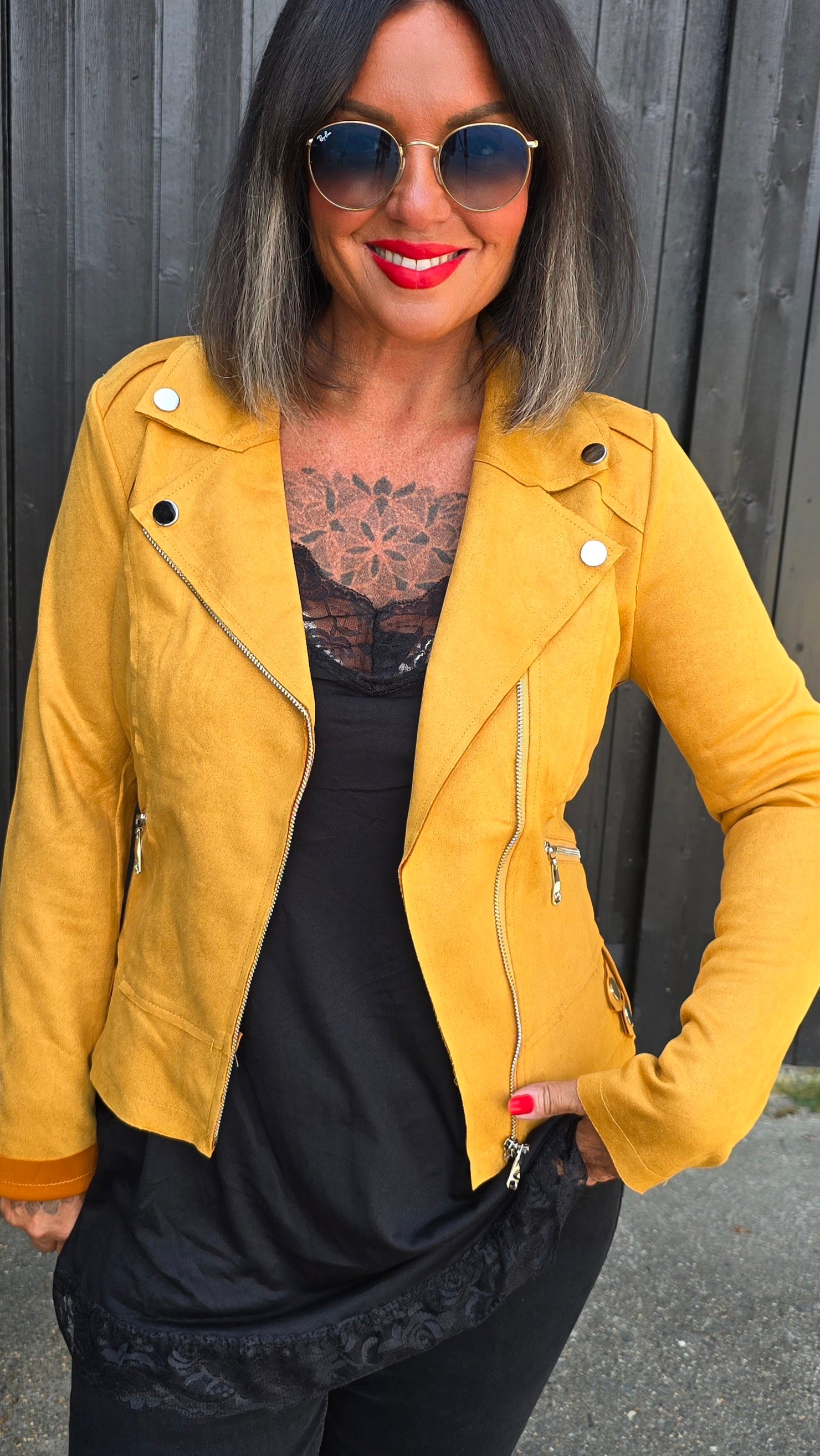 Stretchig jakka med fina detaljer. Fake skinn look. Glidelås I front. Fin passform över bysten. Normal I str. Men vill man ha den mer lös på ta en str större.