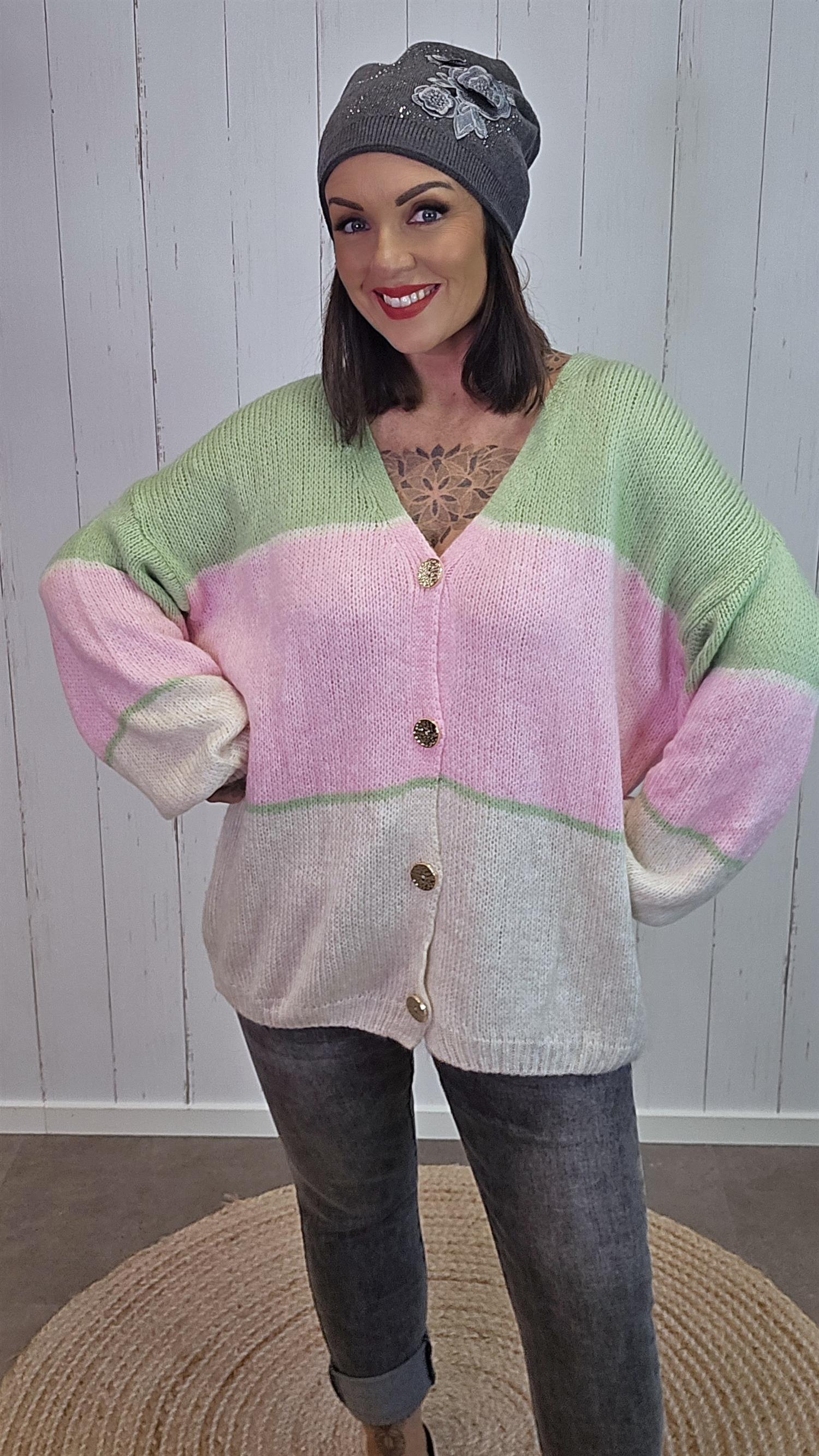 En vakker cardigan i strikket kvalitet med dekorative gullknapper i front. Modellen har dyp v-hals, lange ermer og en komfortabel passform. Den myke strikken faller fint og gir et avslappet uttrykk, perfekt til både hverdags og koselige kvelder.