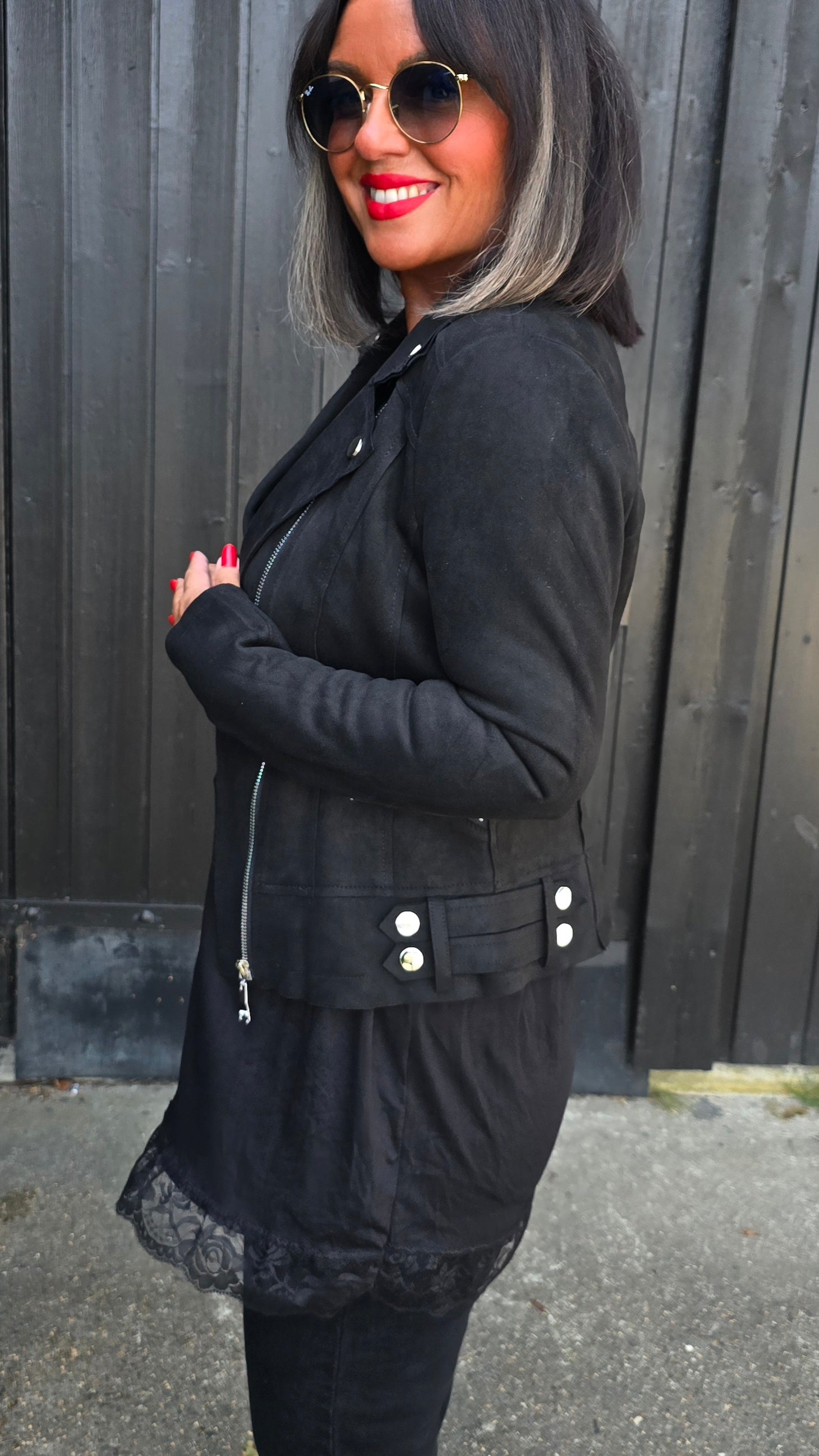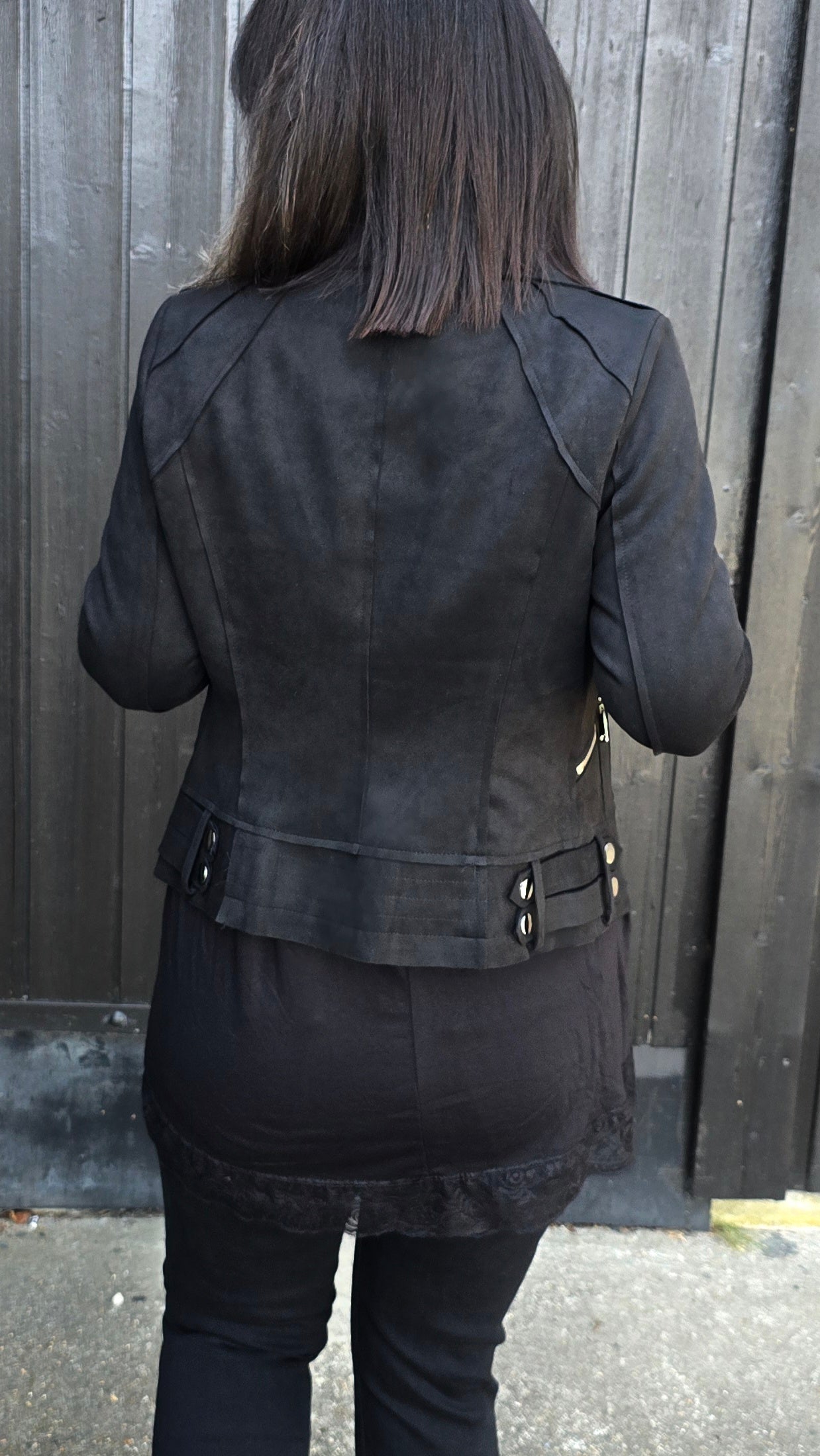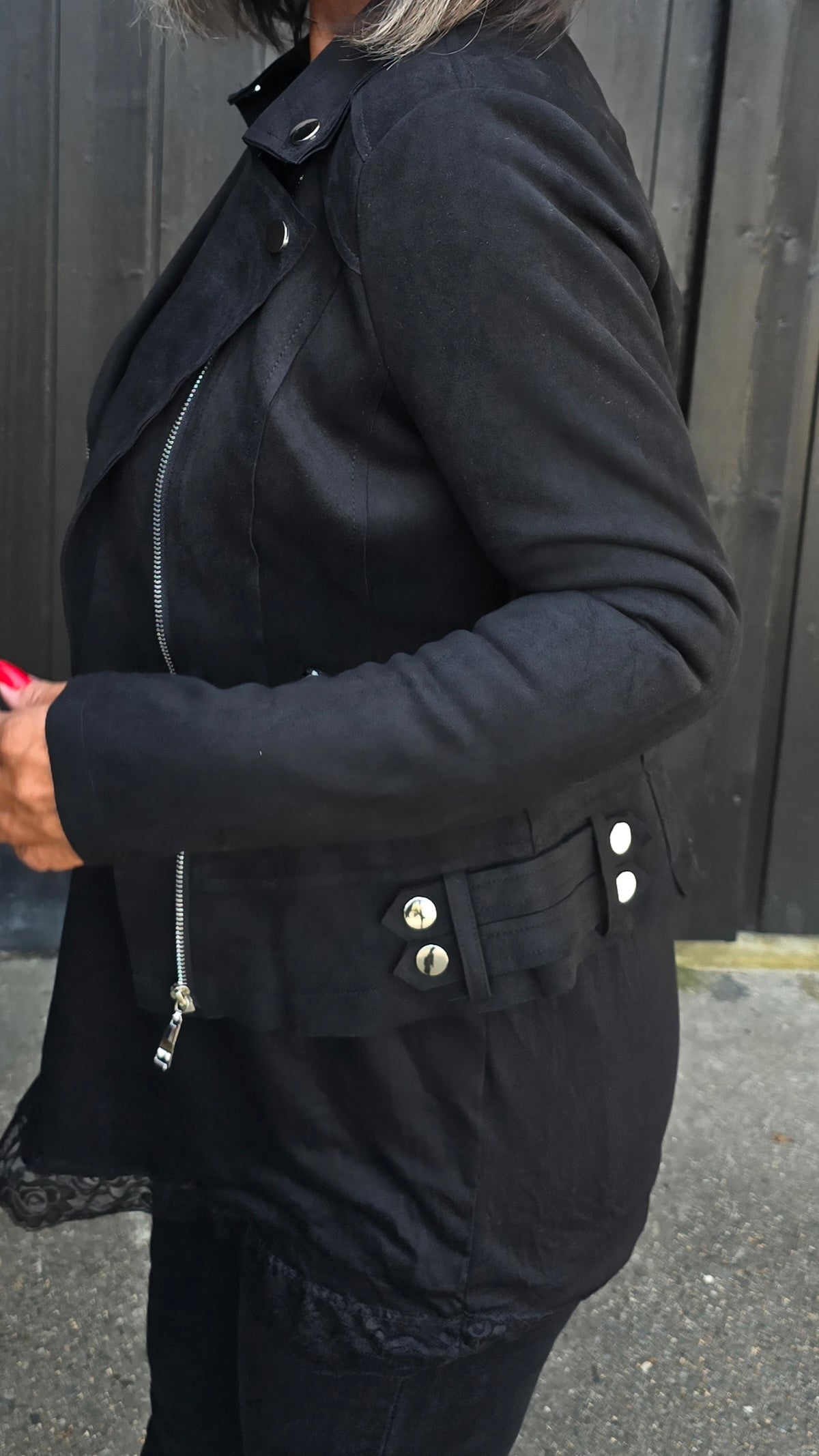 Stretchig jakka med fina detaljer. Fake skinn look. Glidelås I front. Fin passform över bysten. Normal I str. Men vill man ha den mer lös på ta en str större.