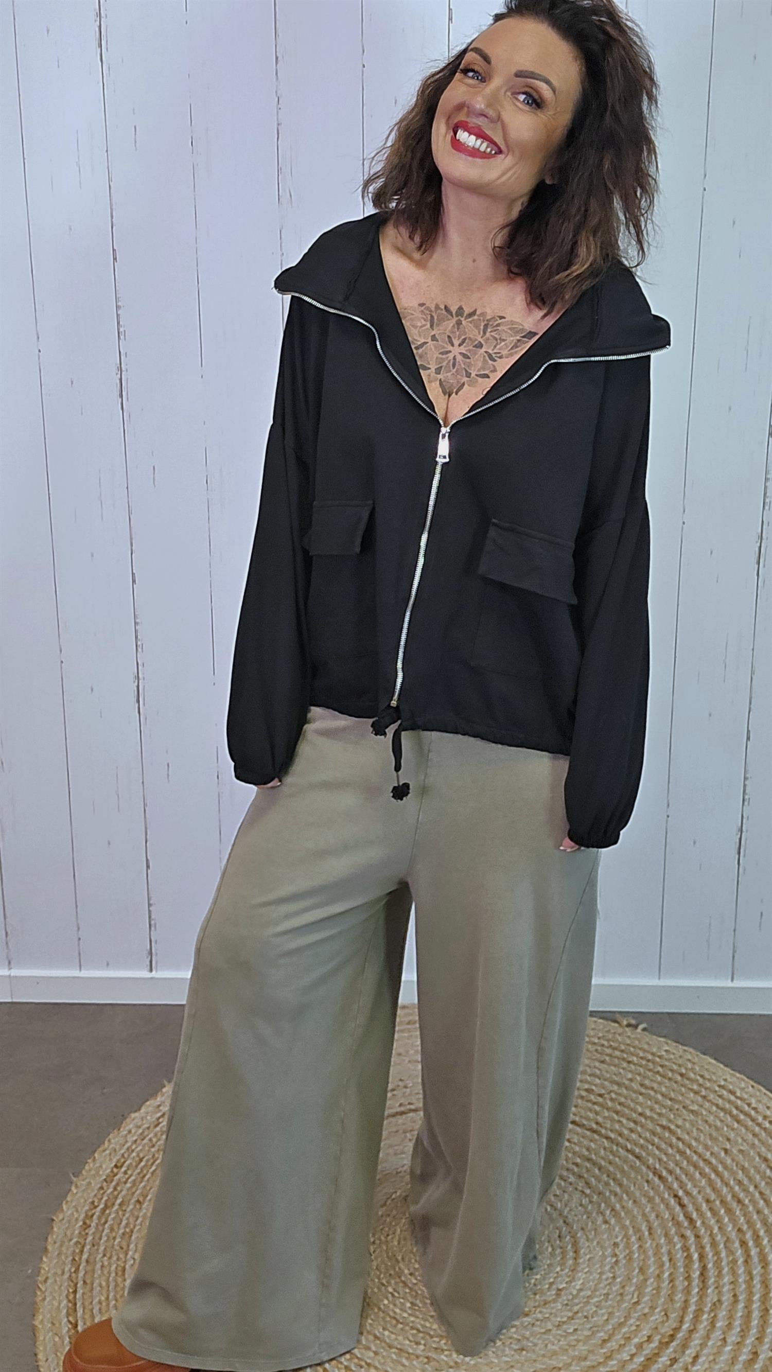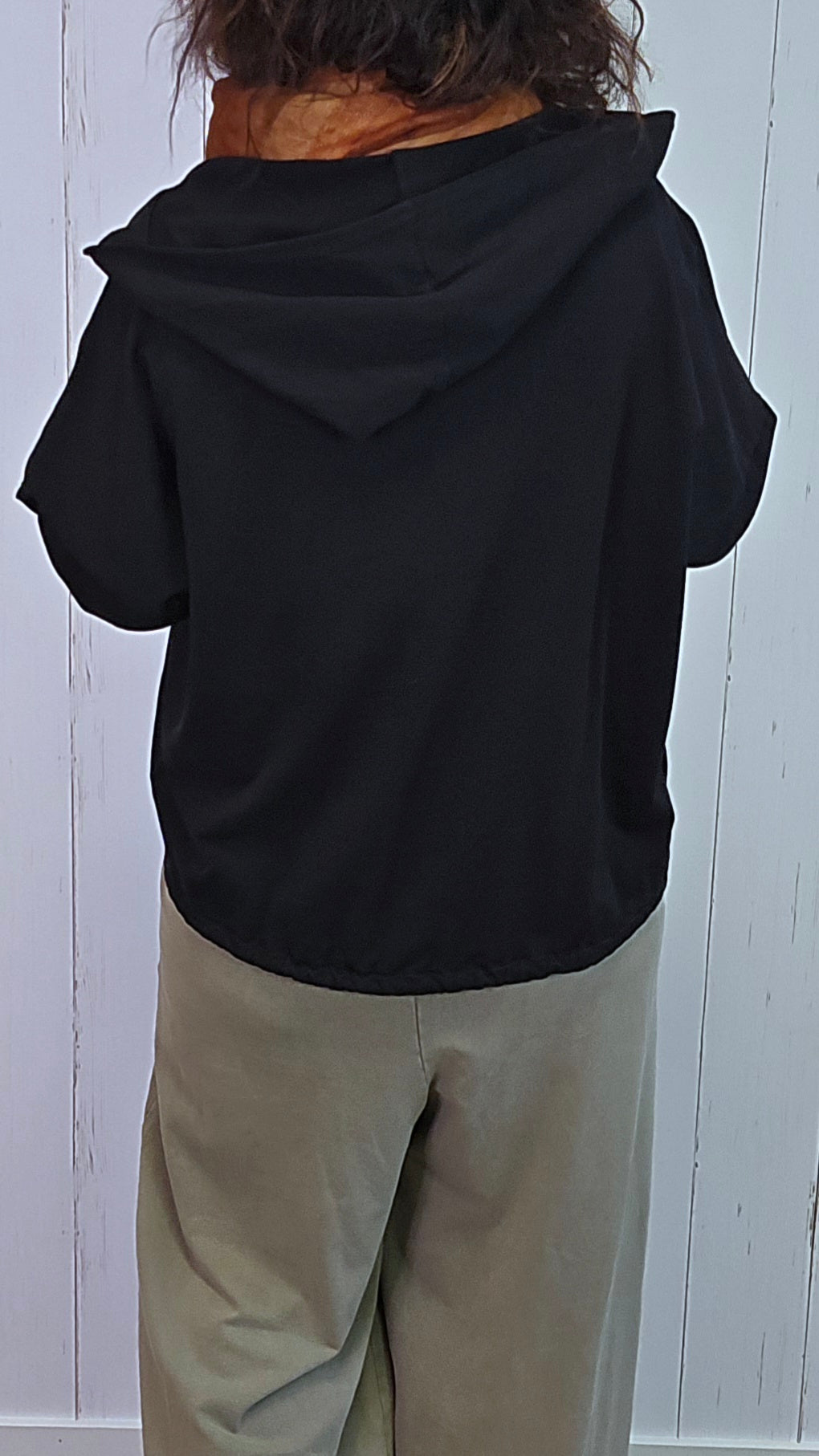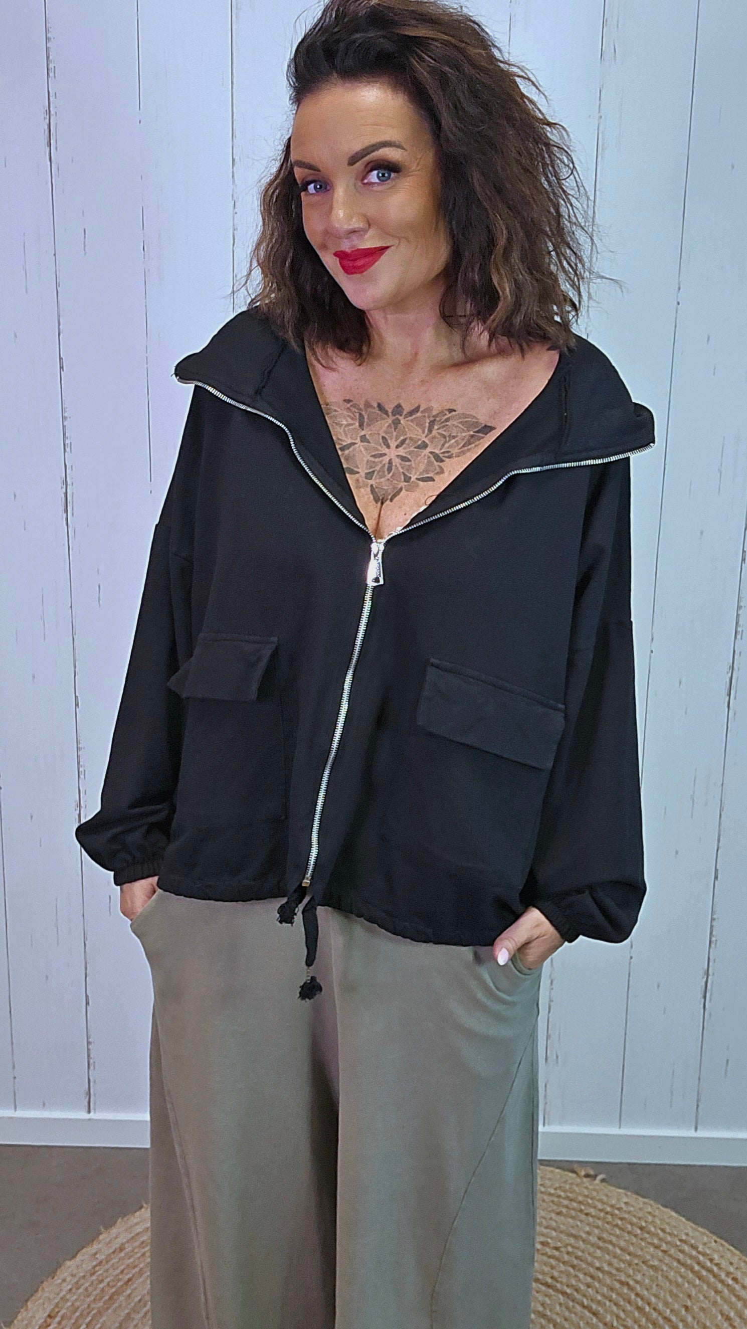 En myk og behagelig hettejakke med stor hette og avslappet passform. Modellen har glidelås i front, sidelommer med klaff og snøring nederst som gjør det enkelt å justere fasongen. De lange ermene og den rene designen gjør den til et anvendelig plagg som passer til både hverdags og fritid.