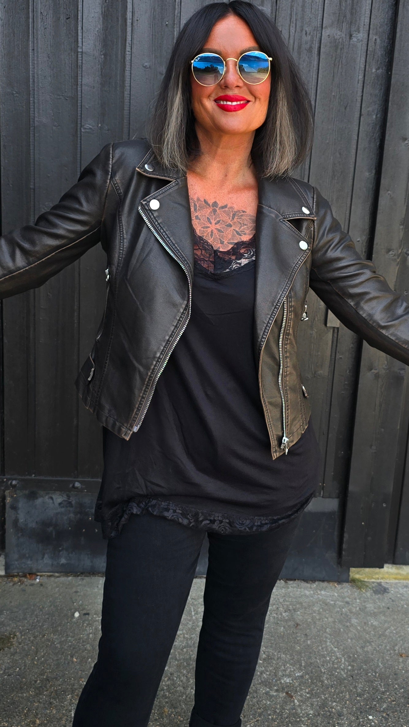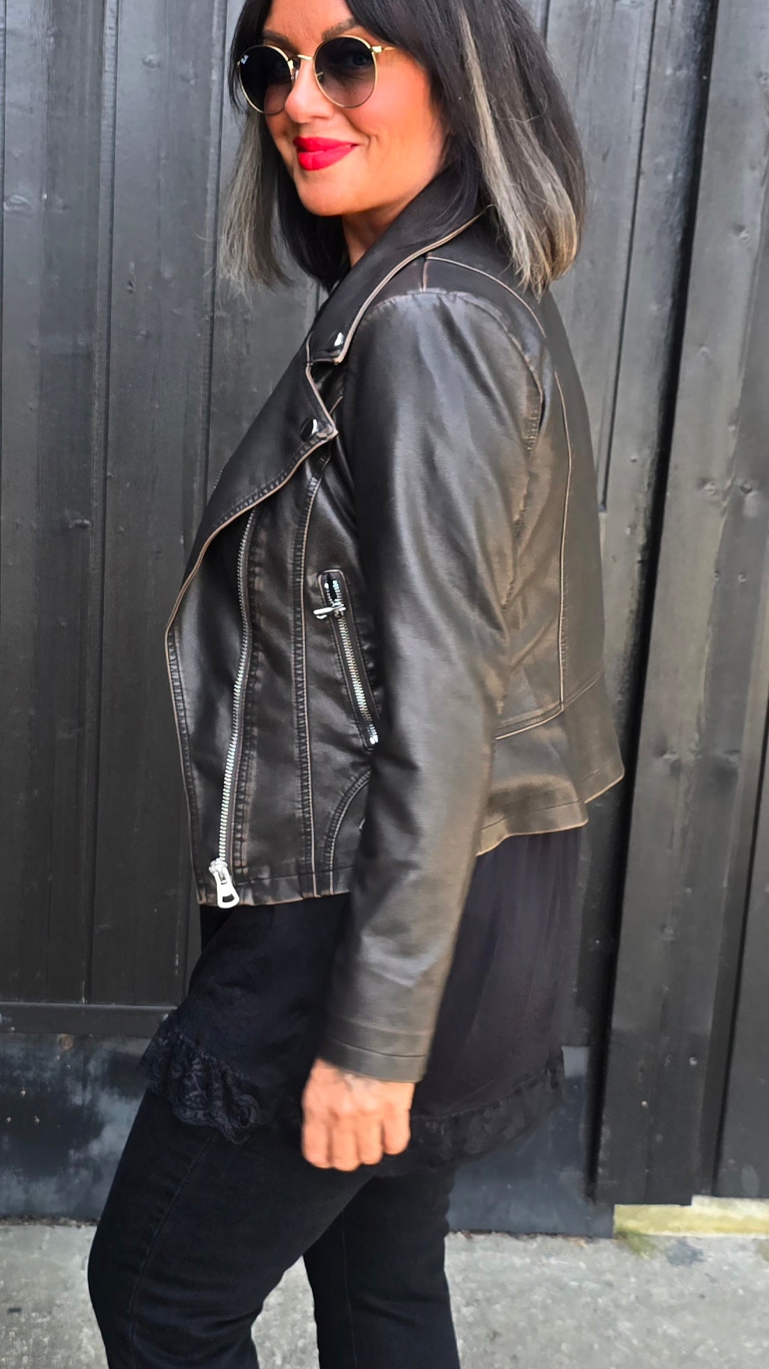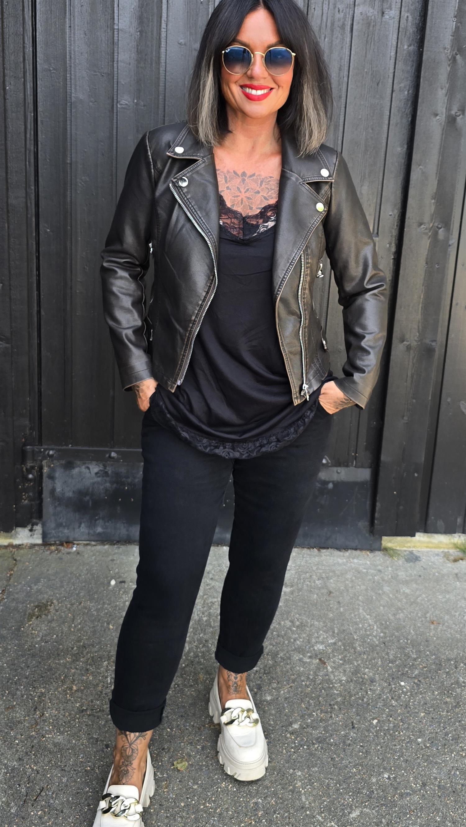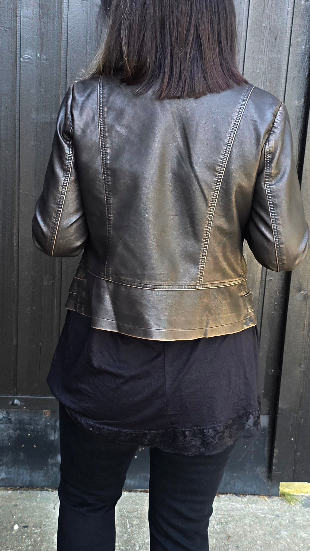 Fake skinn jakka med slitna detaljer.Råtuff i stilen. Glidelås I front. Fin passform över bysten. Normal I str. Men vill man ha den mer lös på ta en str större.
