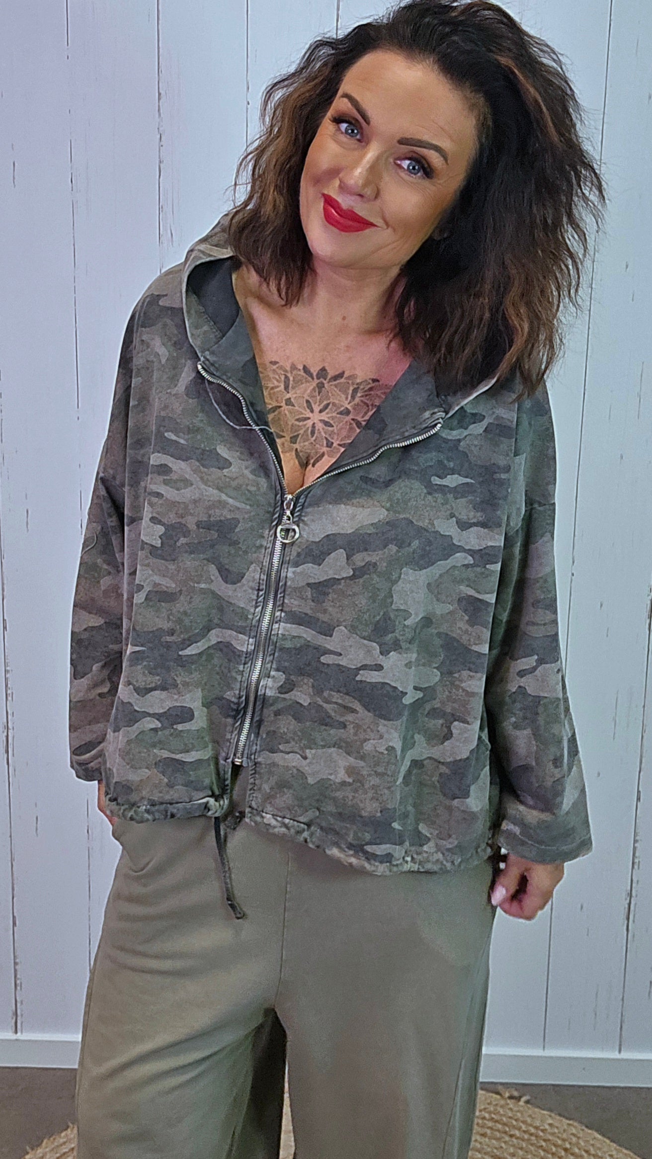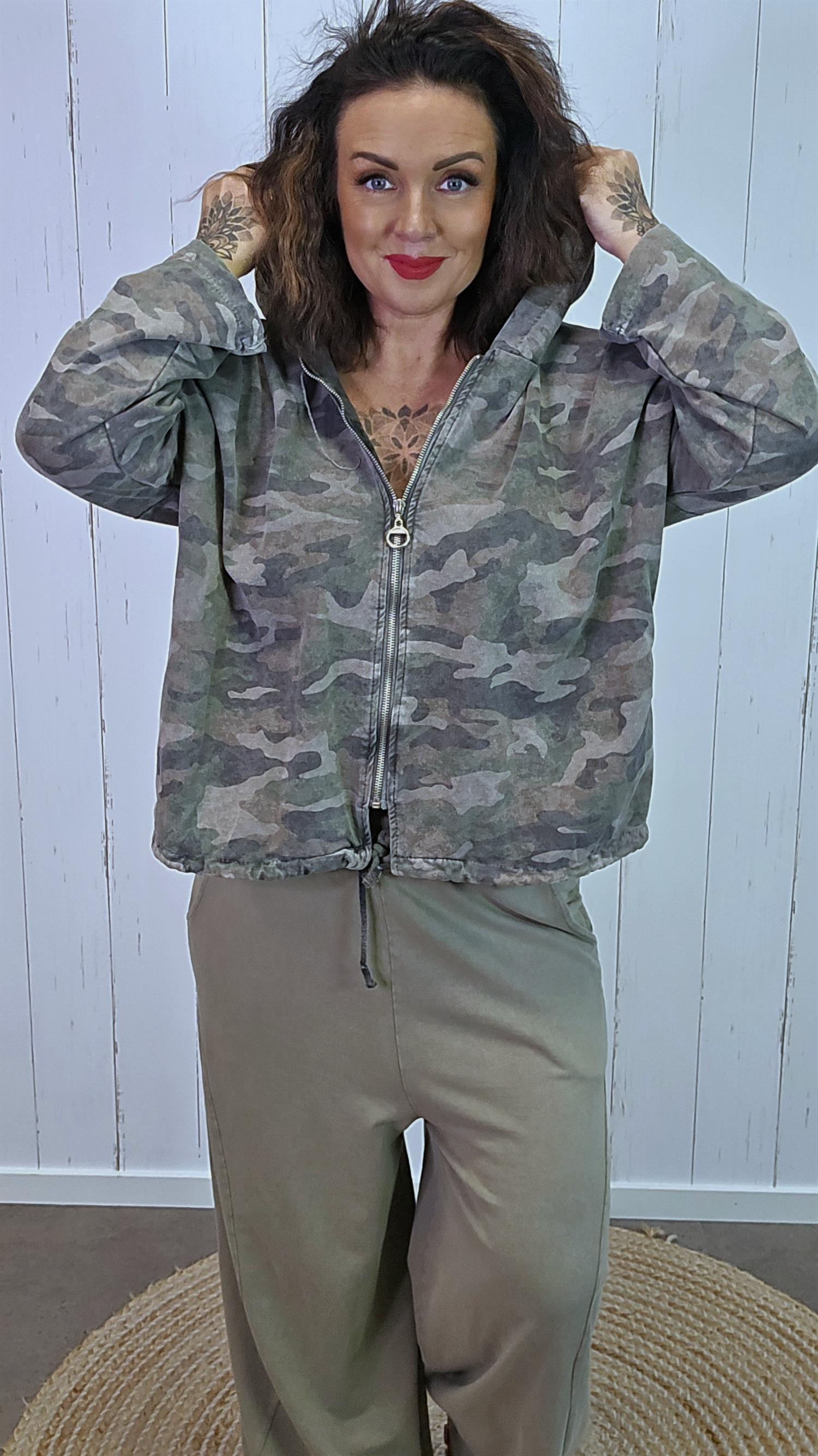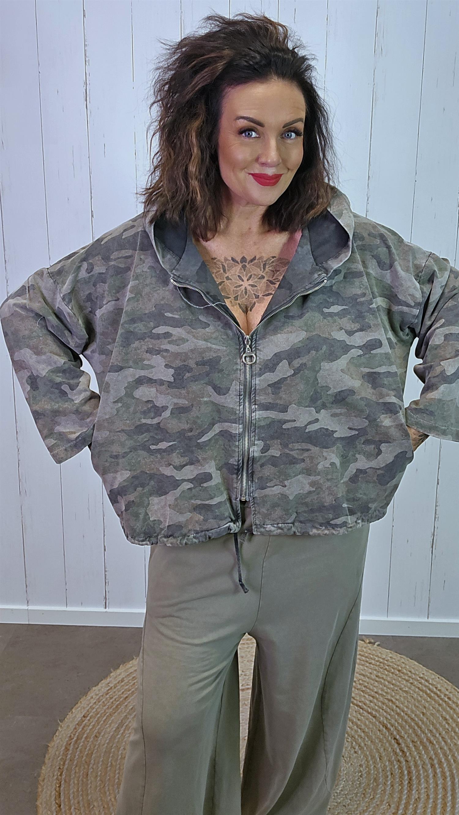 En tøff hettejakke med camoprint og en løs, ledig passform. Modellen har glidelås i front, sidelommer og snøring nederst for justerbar fasong. Hetten gir plagget en sporty touch, mens den myke bomullskvaliteten gjør den behagelig å bruke til hverdags.
