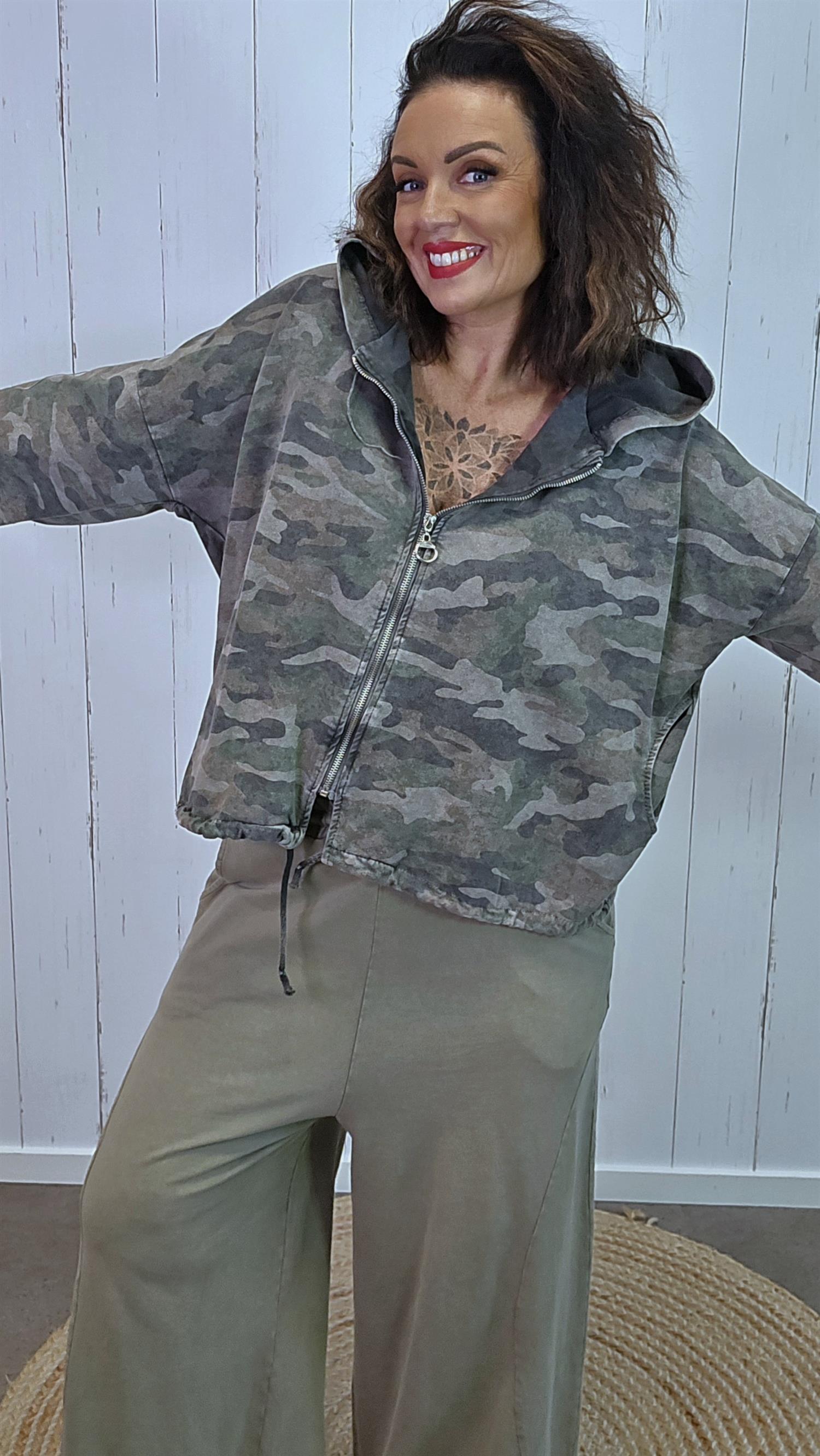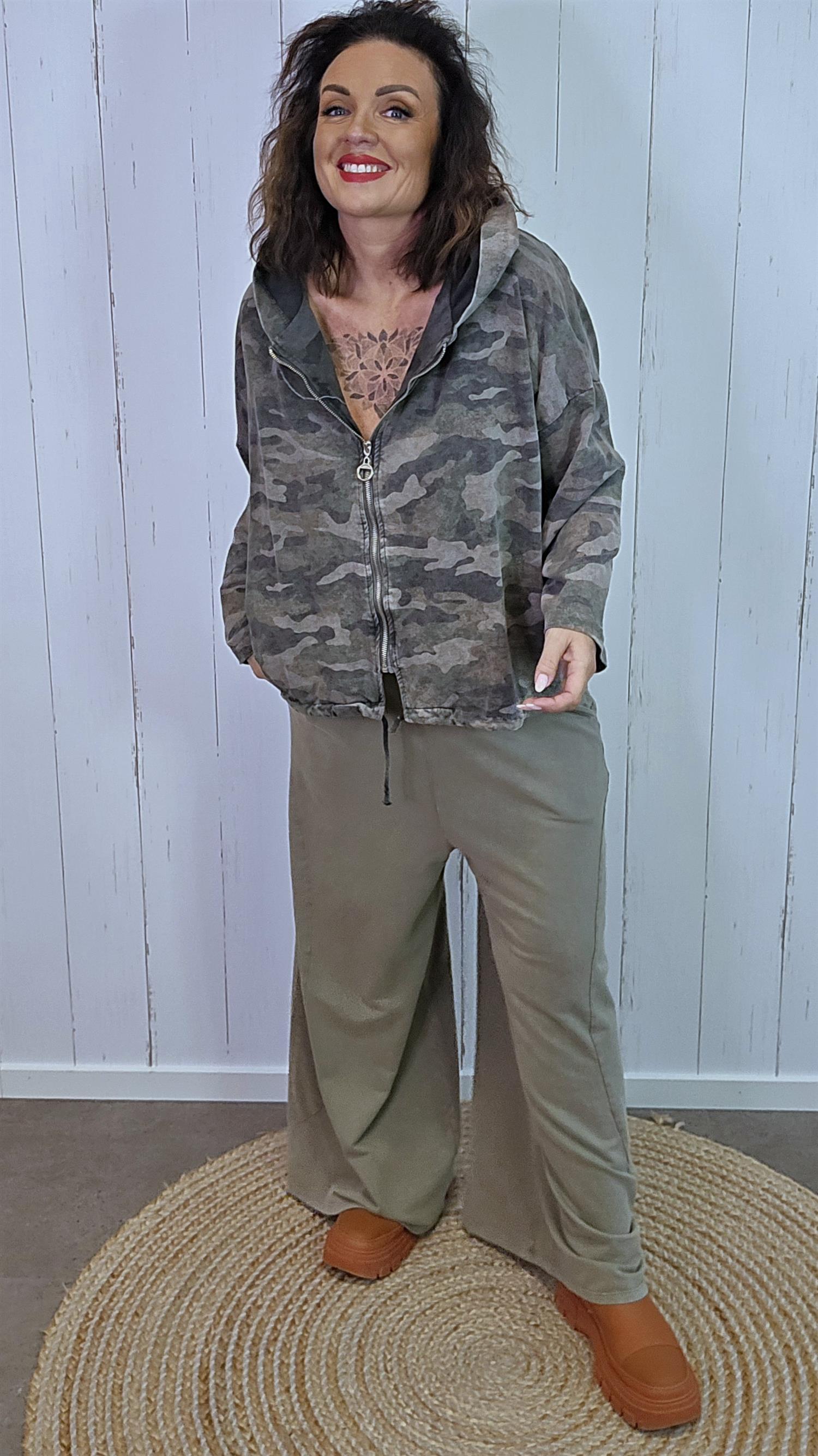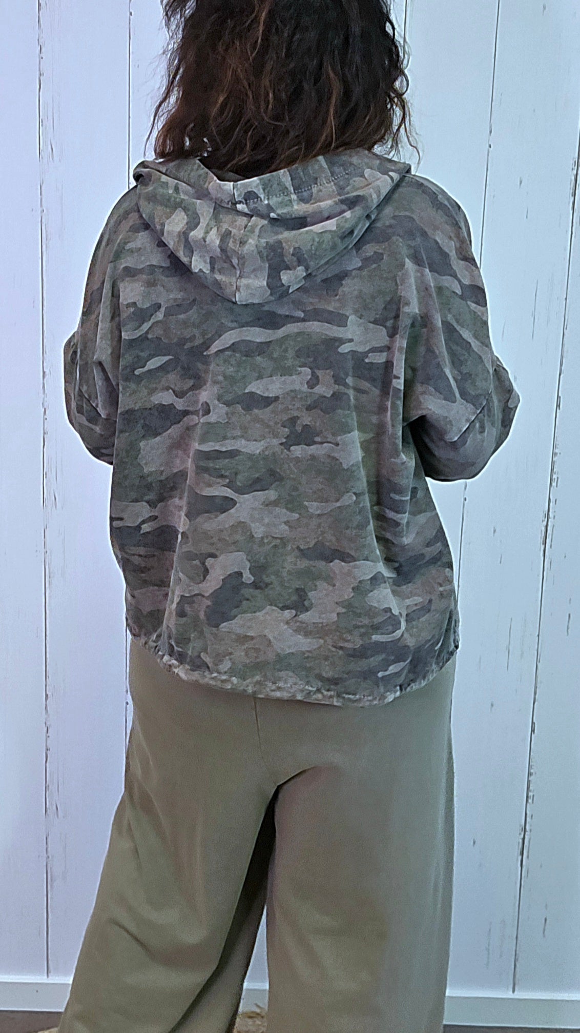 En tøff hettejakke med camoprint og en løs, ledig passform. Modellen har glidelås i front, sidelommer og snøring nederst for justerbar fasong. Hetten gir plagget en sporty touch, mens den myke bomullskvaliteten gjør den behagelig å bruke til hverdags.