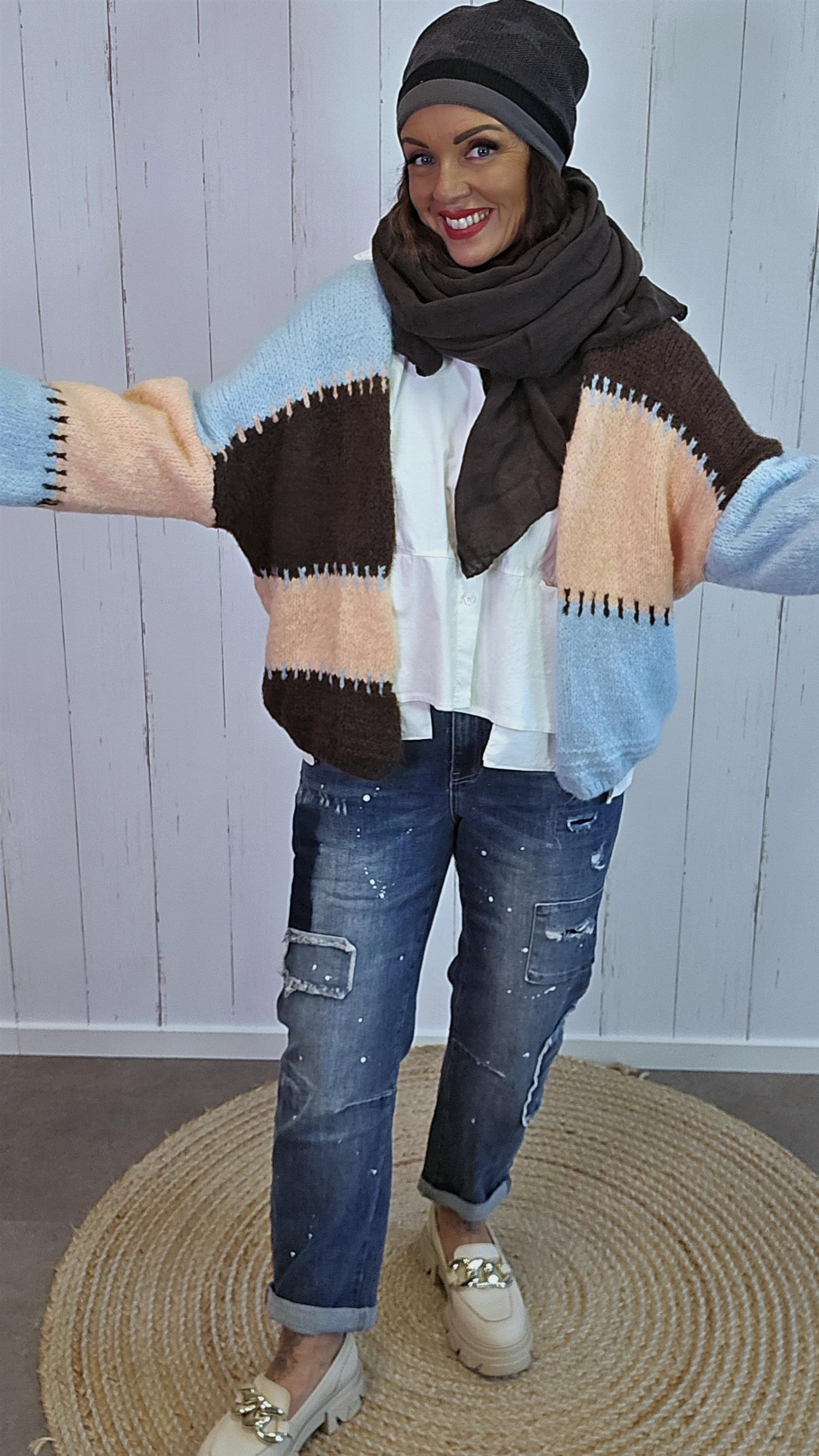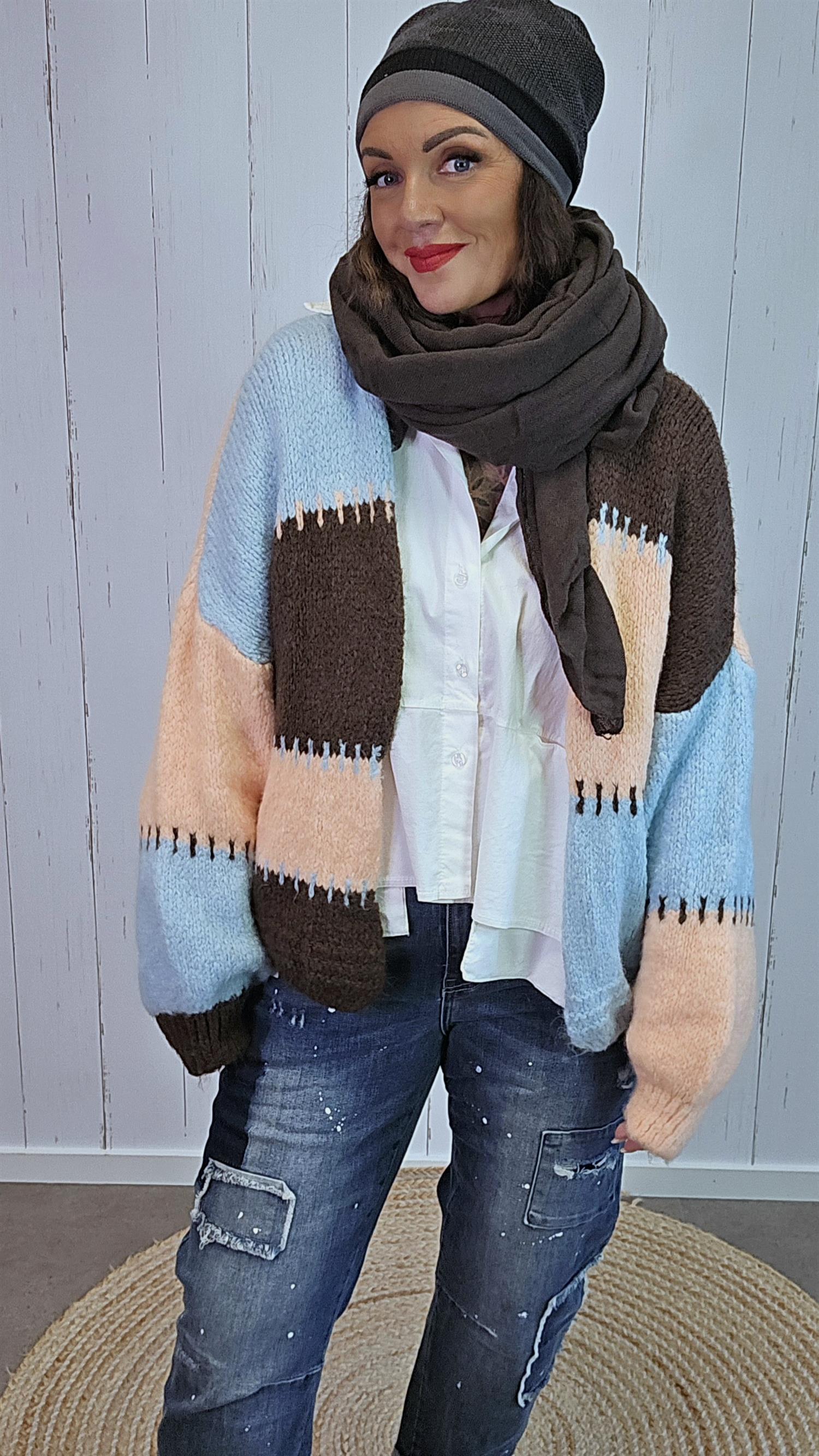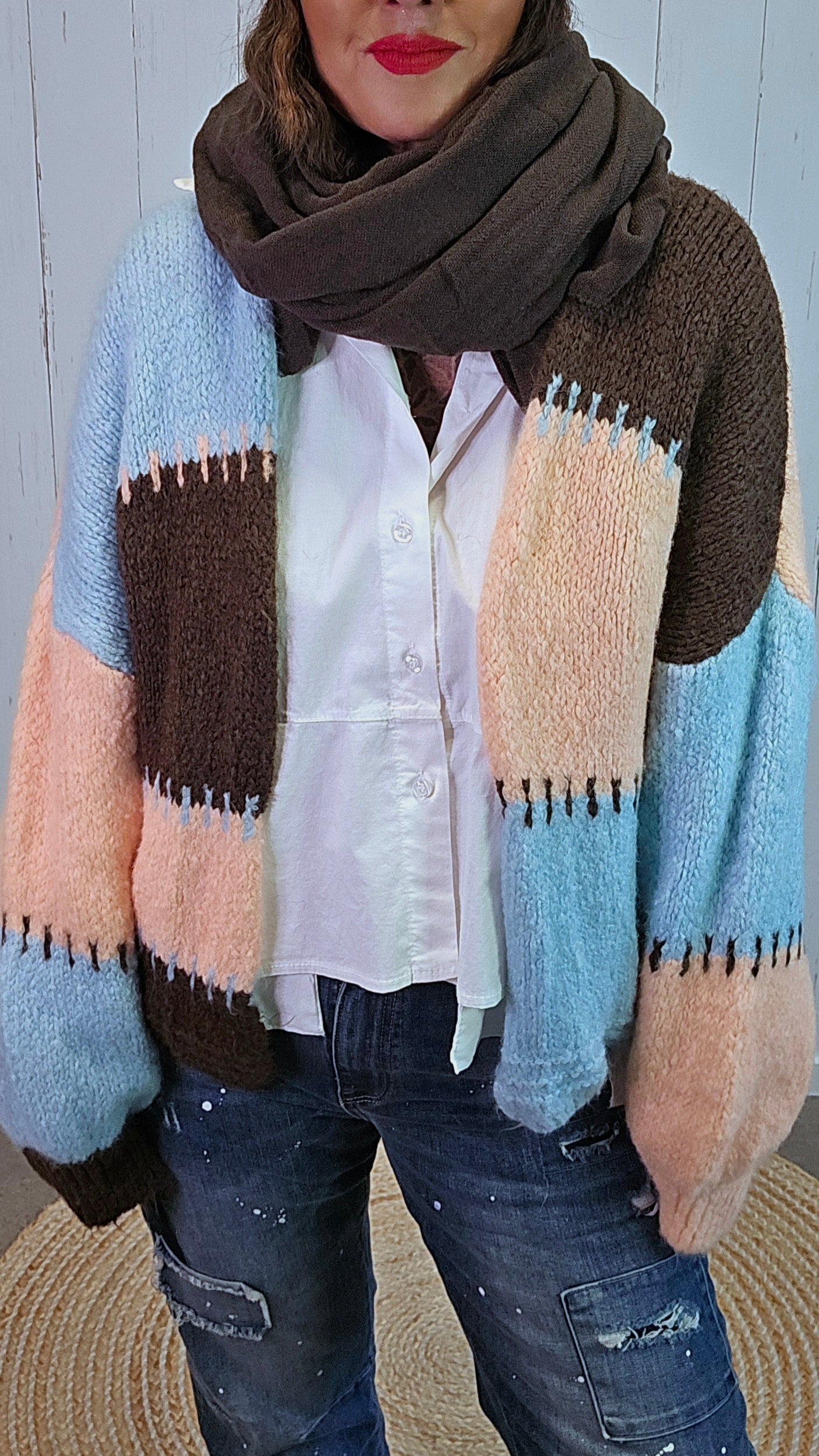 En råfin strikket jakke i friske lyse toner kombinert med brune nyanser. Modellen har lange, vide ermer med smal ribbkant nederst og et åpent design uten lukking. Jakken er satt sammen av ulike partier i forskjellige farger, med dekorative sømmer som gir den et unikt og spennende uttrykk. Inneholder 9 % ull for en myk og lun kvalitet.