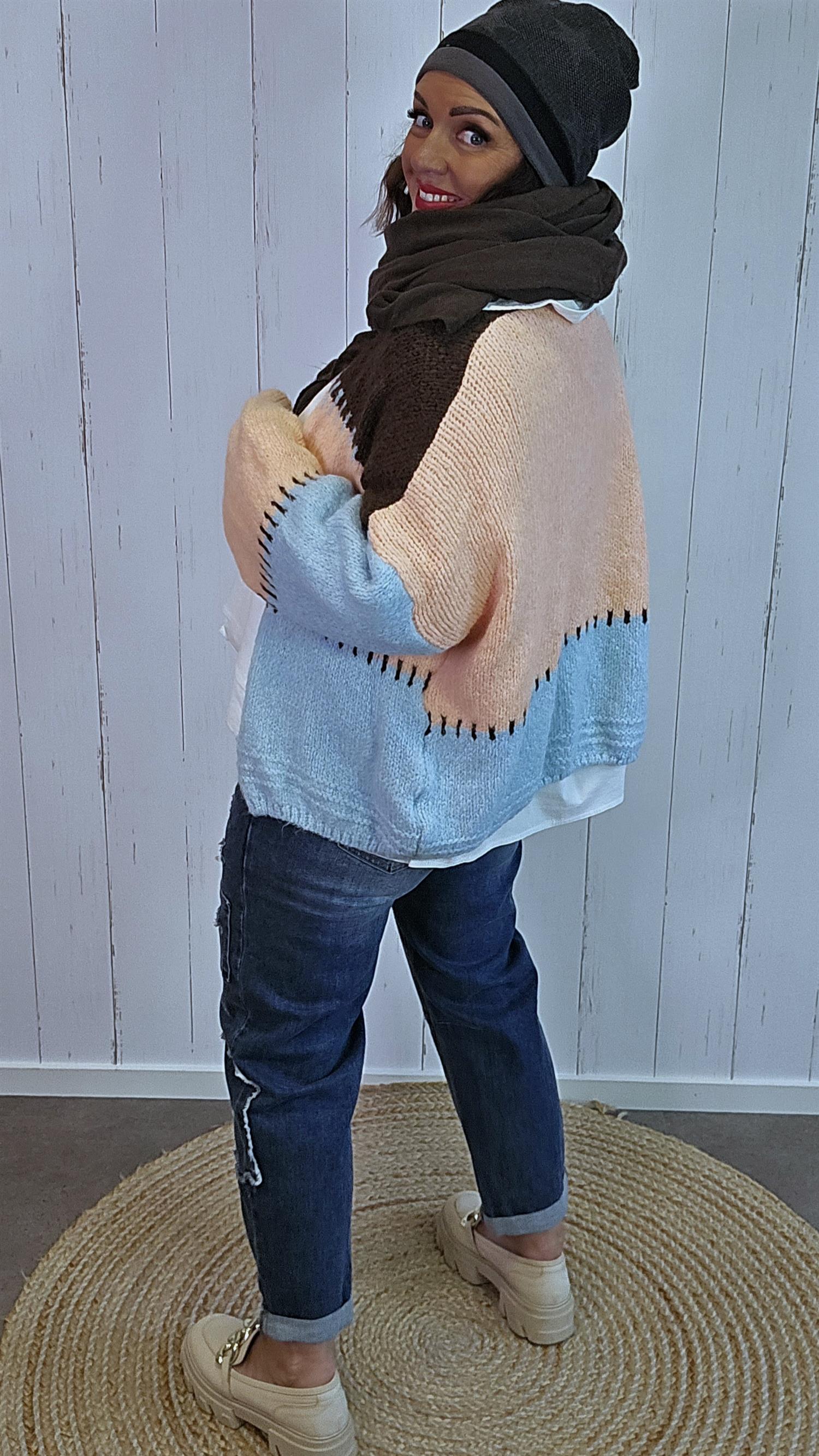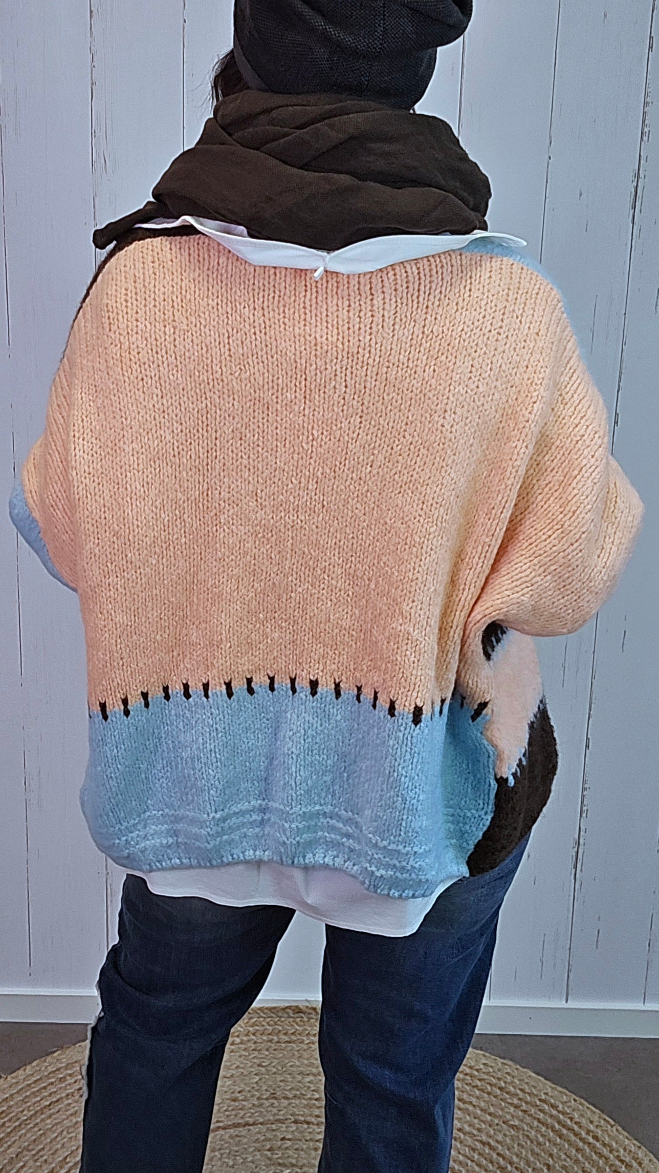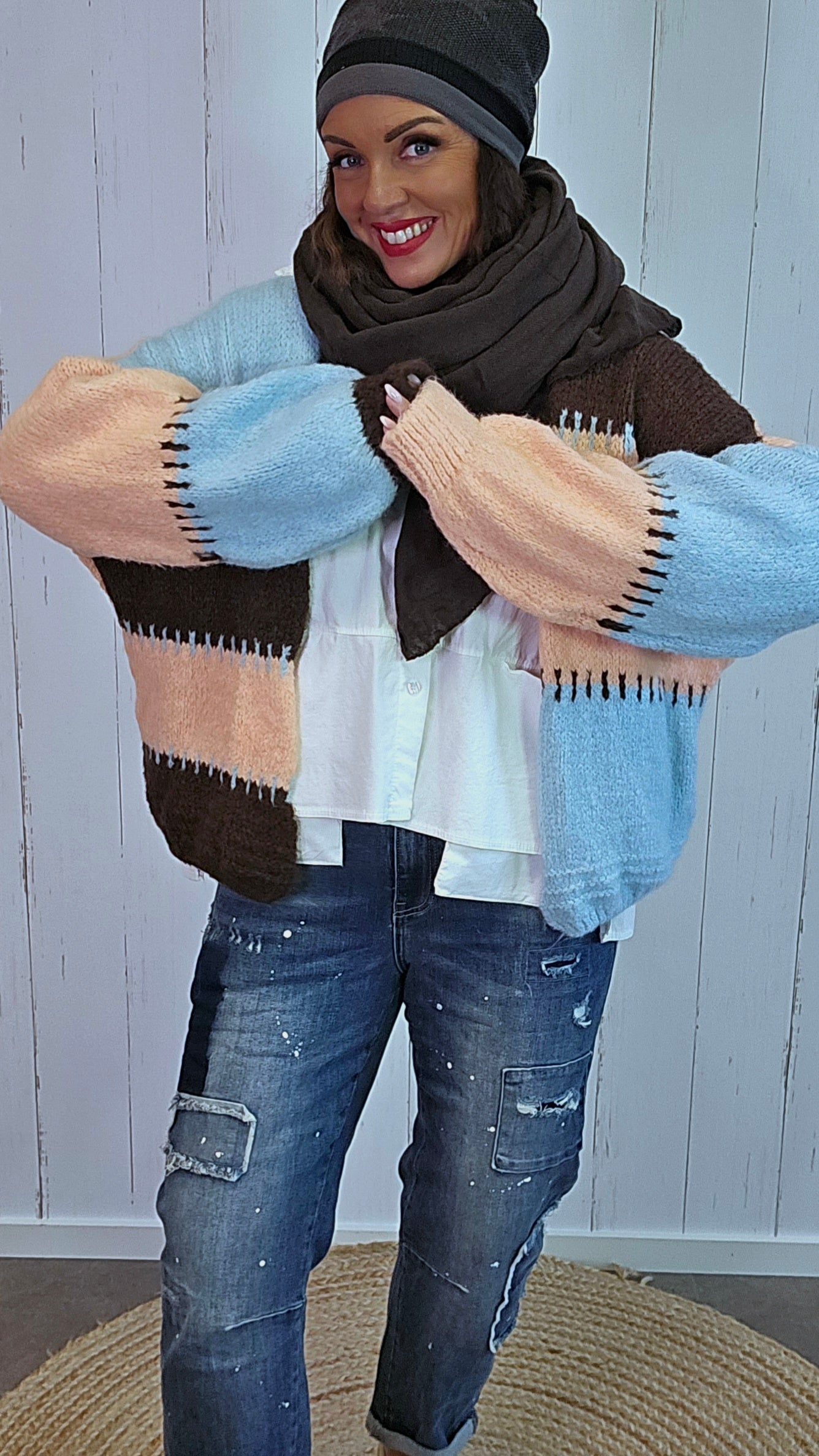 En råfin strikket jakke i friske lyse toner kombinert med brune nyanser. Modellen har lange, vide ermer med smal ribbkant nederst og et åpent design uten lukking. Jakken er satt sammen av ulike partier i forskjellige farger, med dekorative sømmer som gir den et unikt og spennende uttrykk. Inneholder 9 % ull for en myk og lun kvalitet.