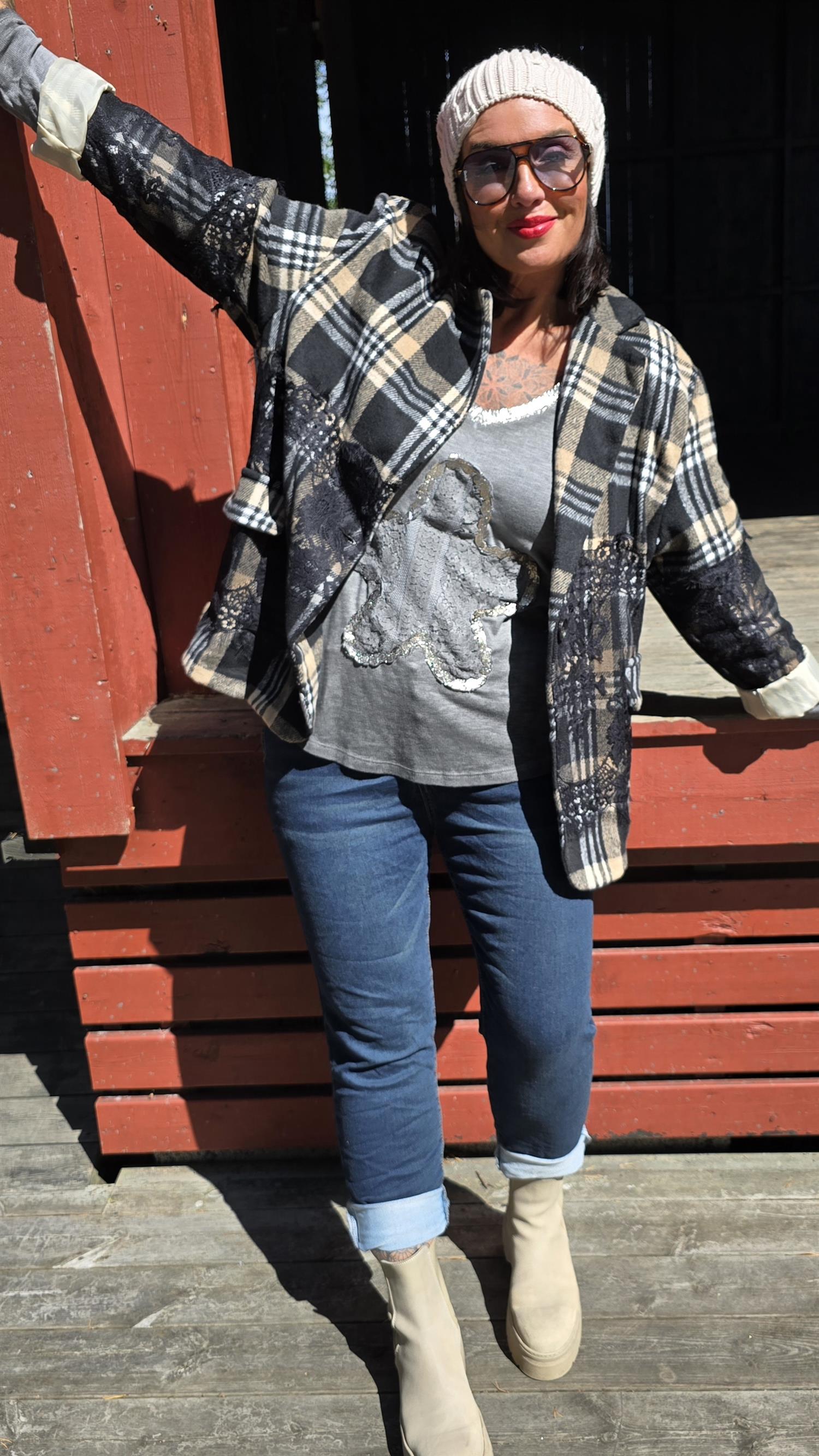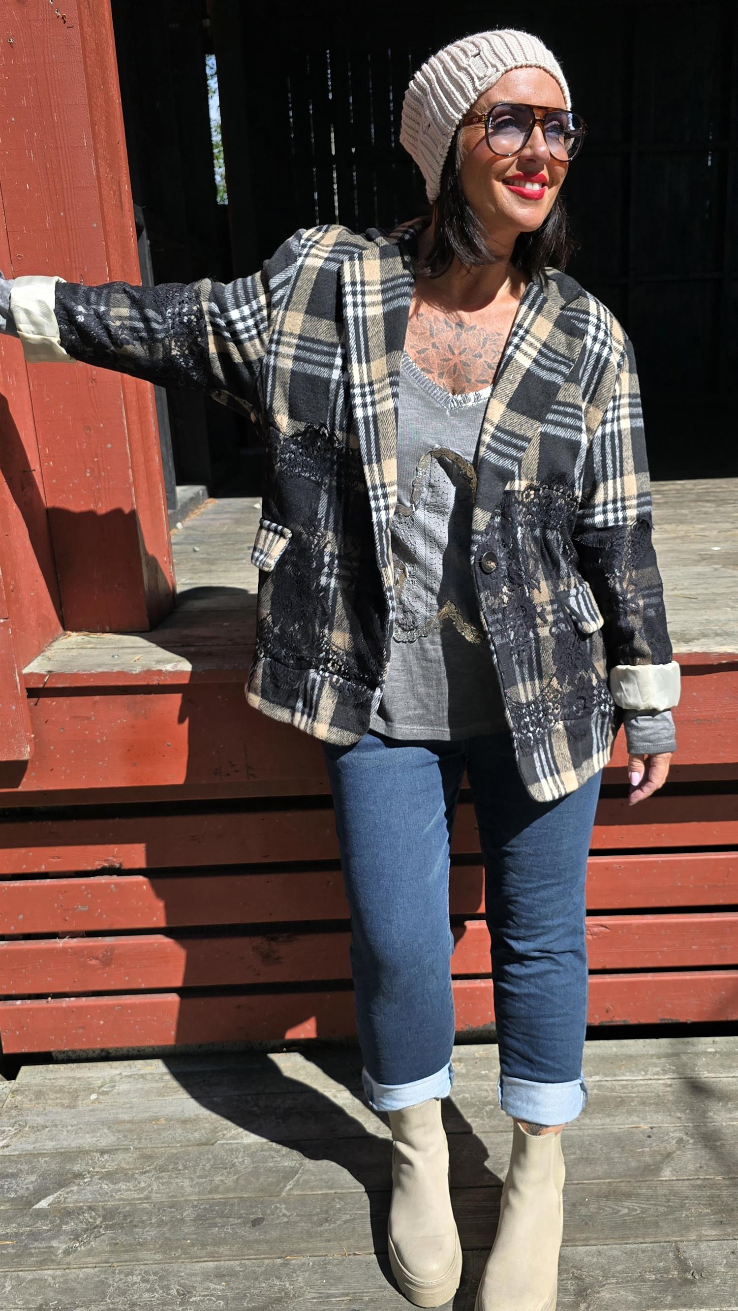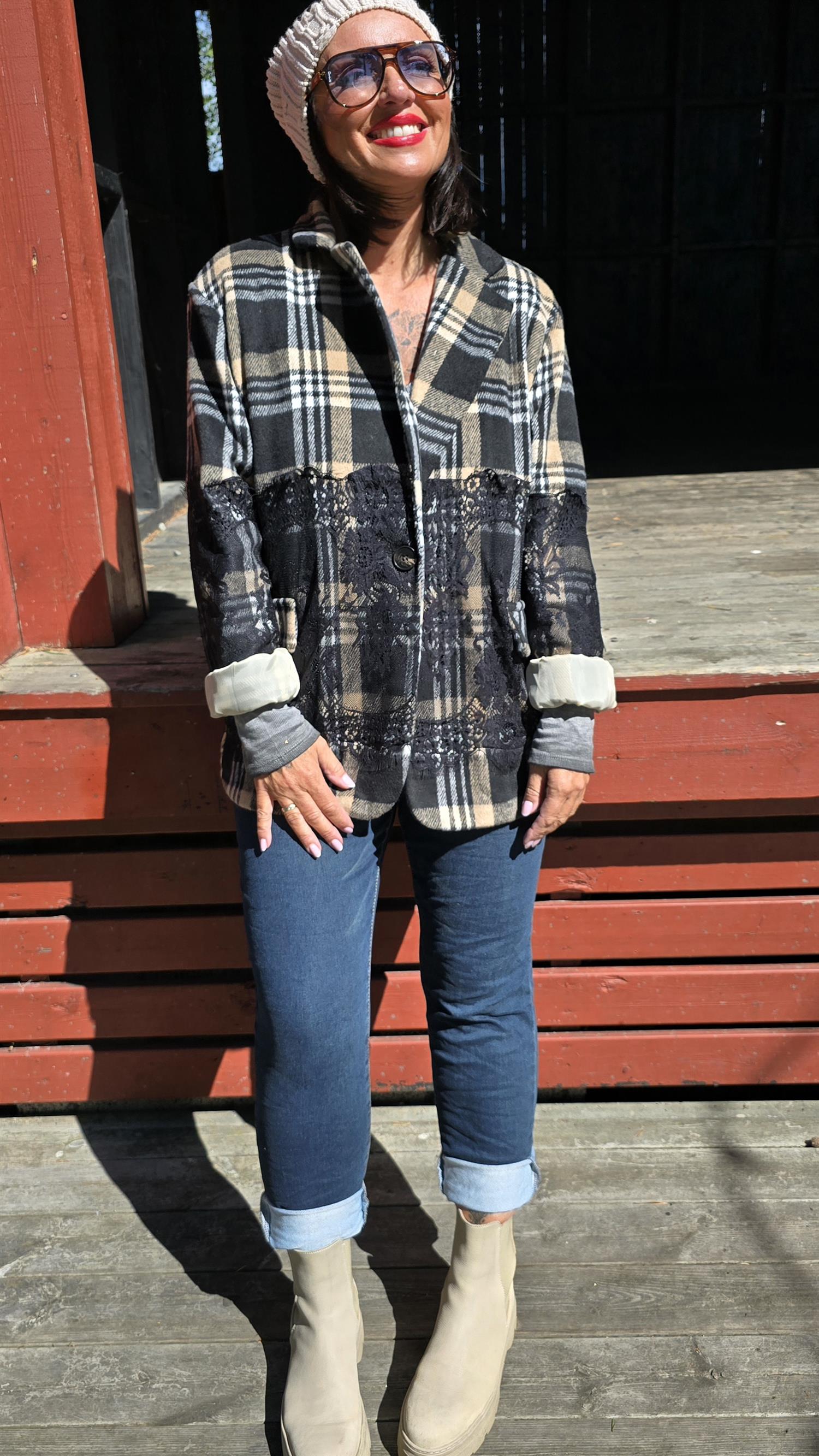 Läcker blazer med rutigt mönster. Svarta påsydda blonder . Knapp I front. Foder på insidan. Långa armar. Fint insvängd .