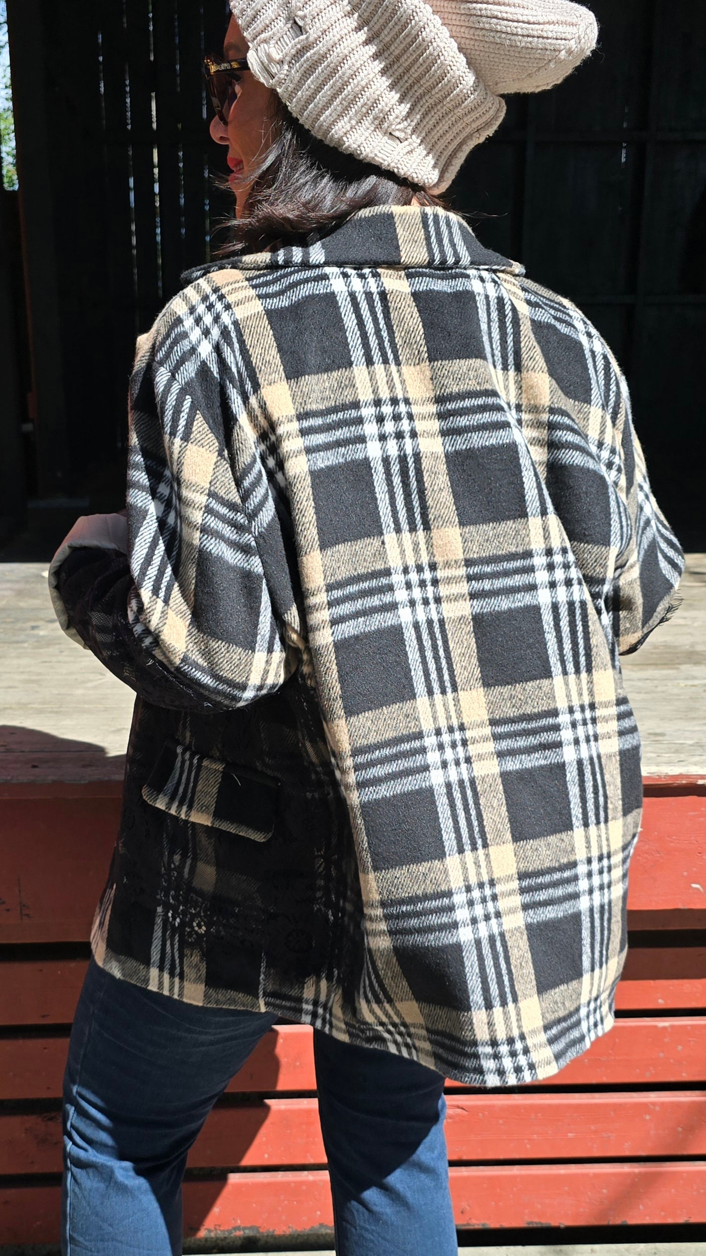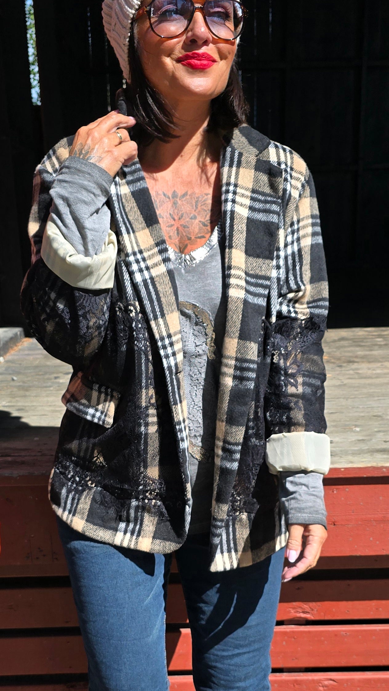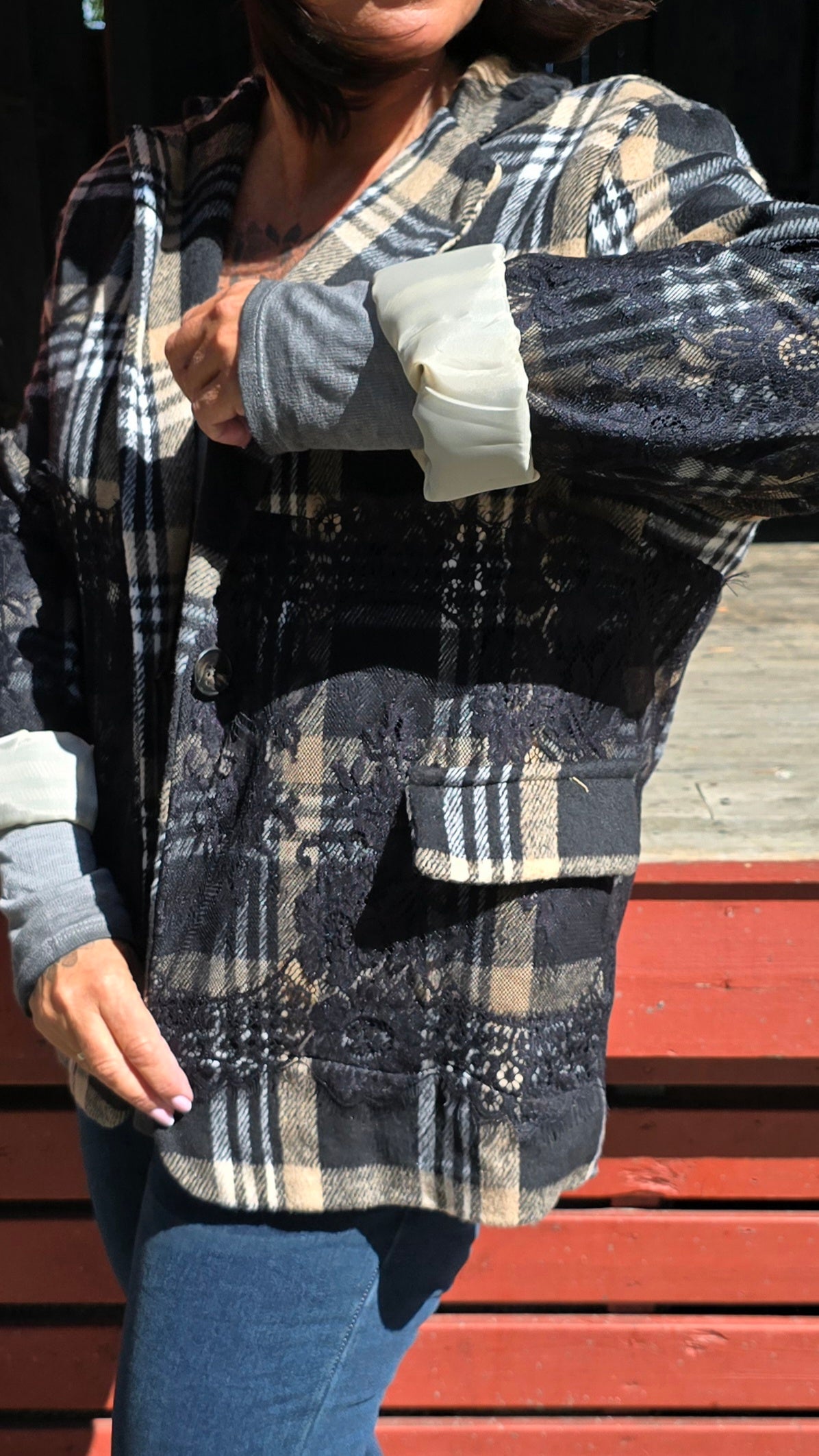 Läcker blazer med rutigt mönster. Svarta påsydda blonder . Knapp I front. Foder på insidan. Långa armar. Fint insvängd .