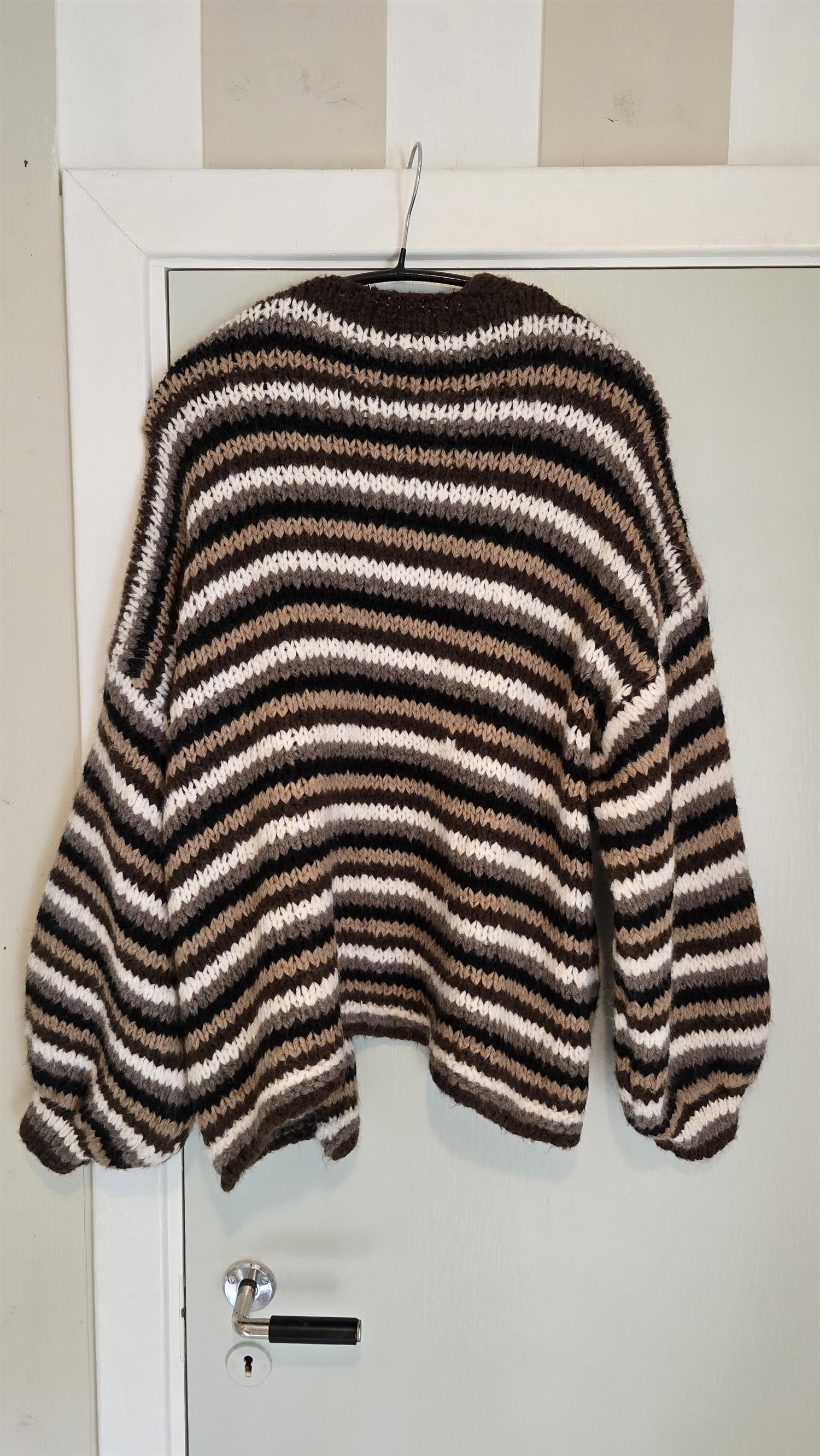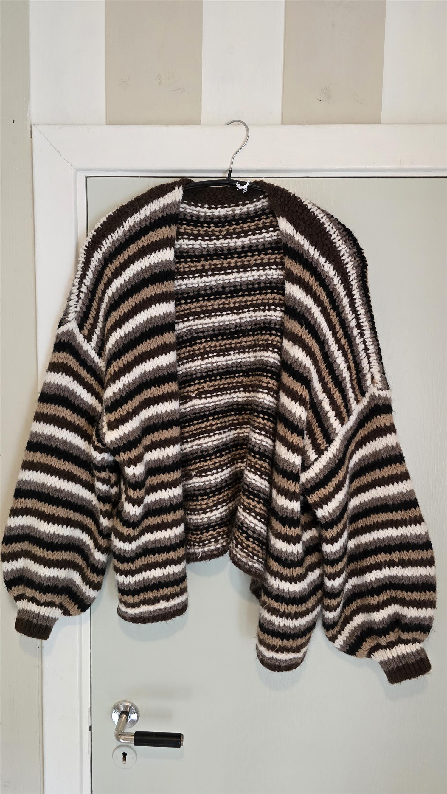 En myk strikket jakke med striper i mørk brun, svart, kameltoner og beige. Den har lange ermer med god passform. Jakken er behagelig mot huden. Designet er åpent uten lukking.