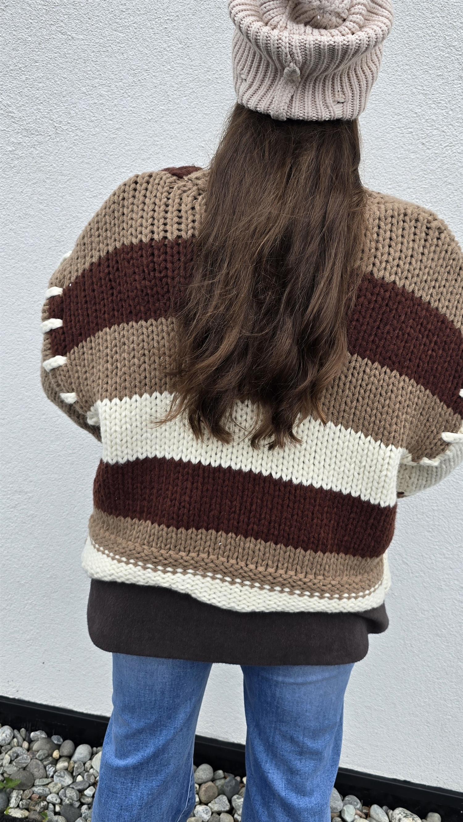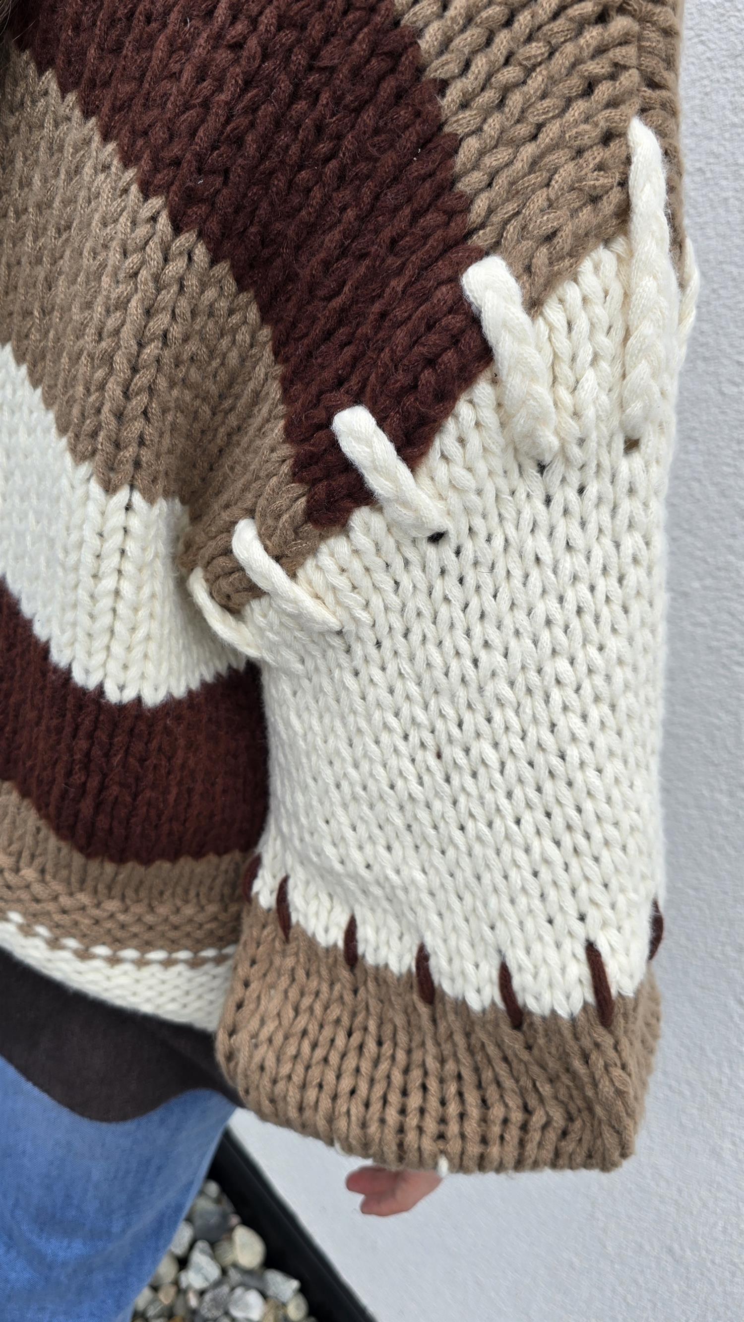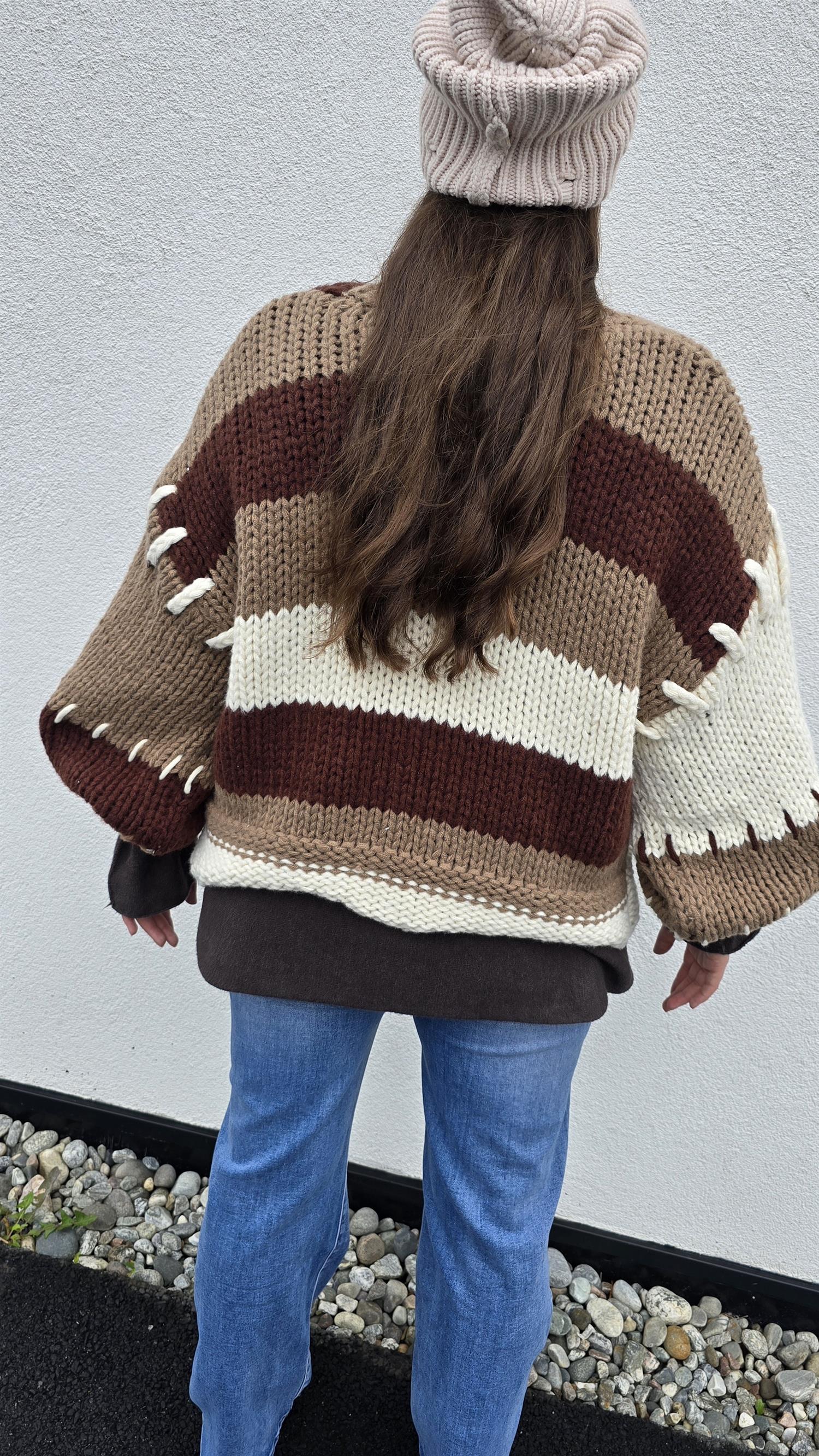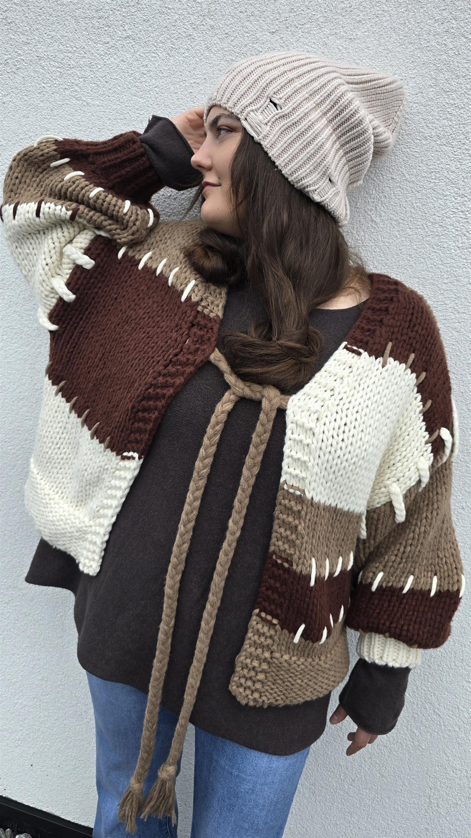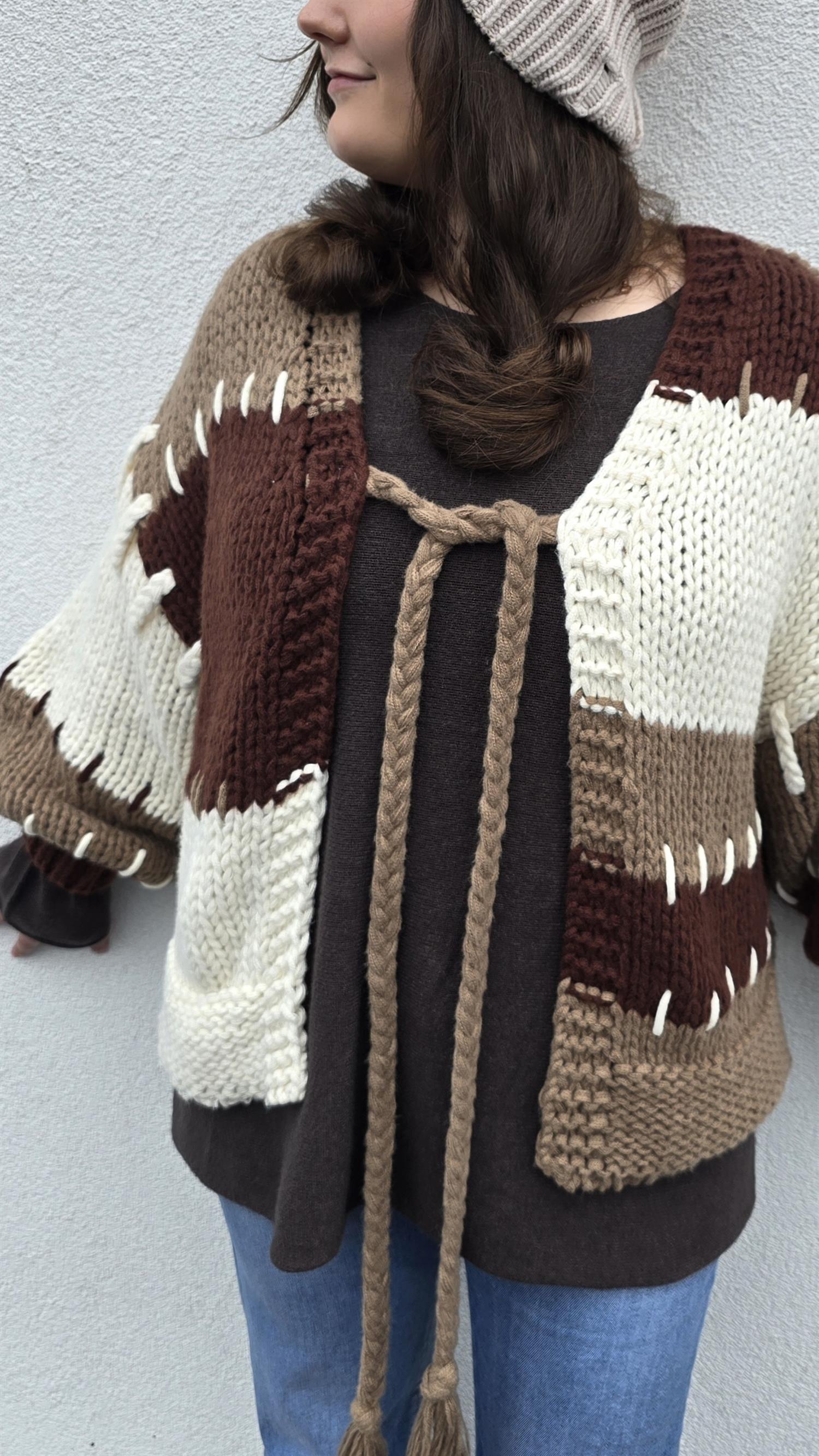 Så snygg grovstickad jacka med knyting i front. Långa vida armar. Fint rutigt mönster.