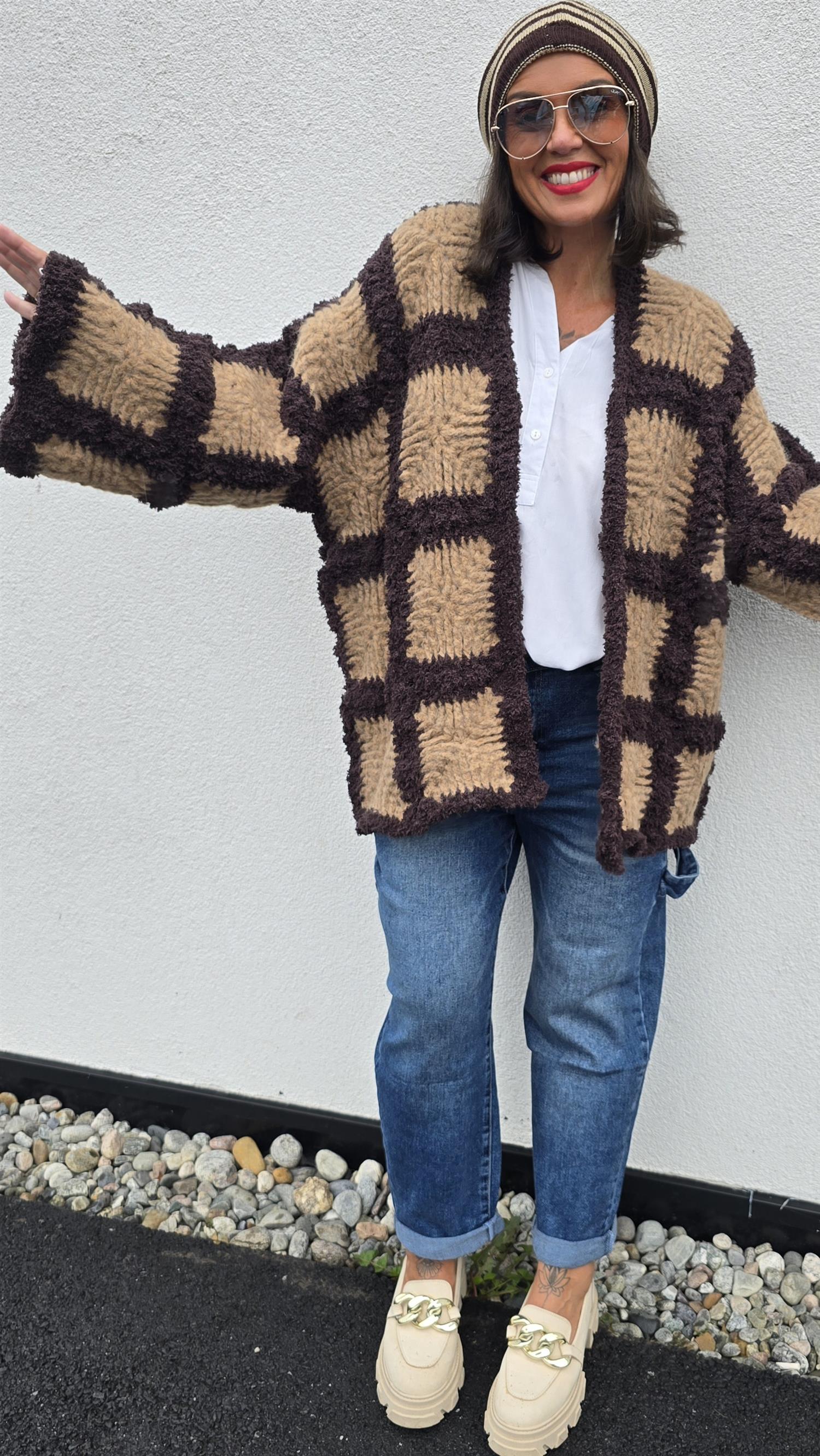 Helt rå stickad jacka med rutigt mönster. Den är oversized I modellen och långa vida armar. Ett smycke av en jakka.