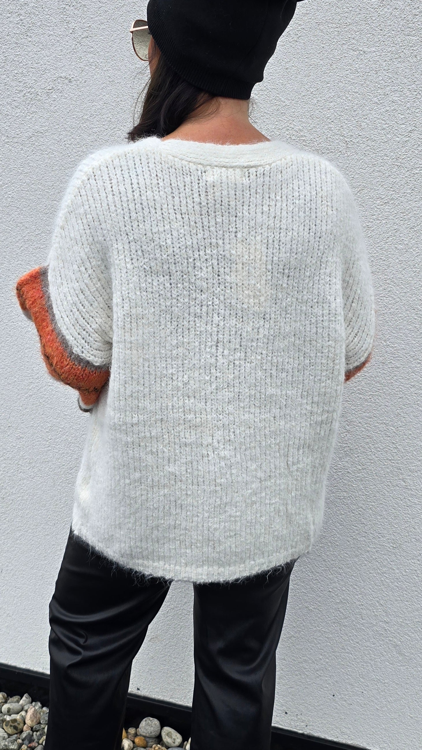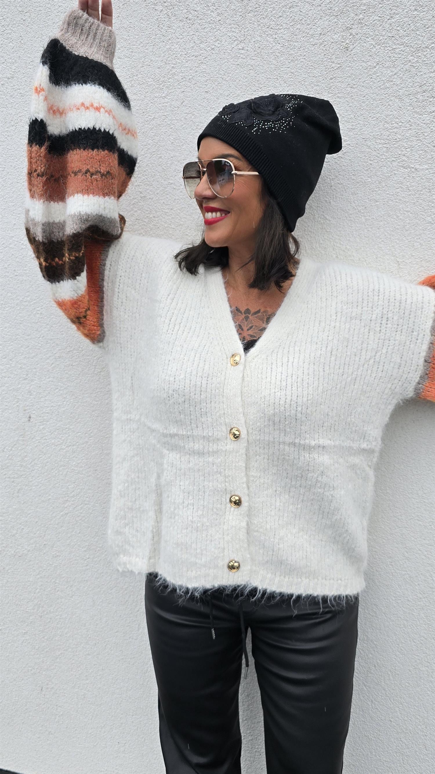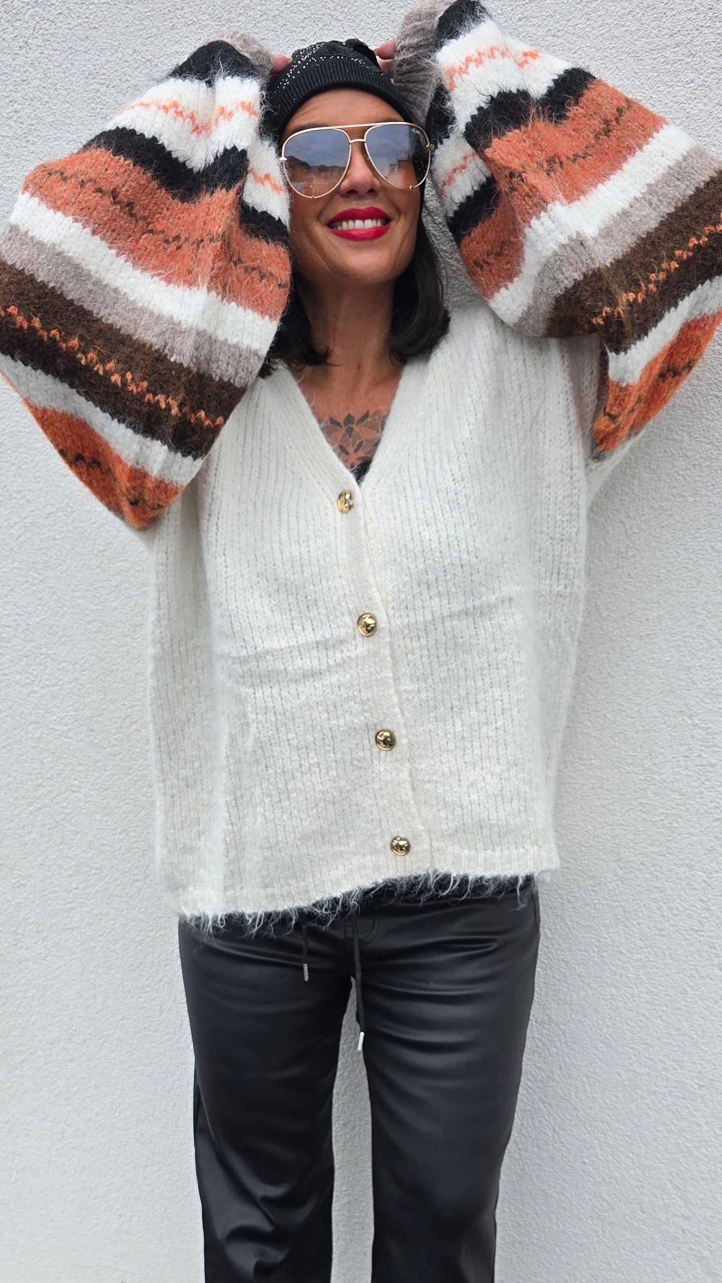 Stickad genser jacka med fina guld knappar I front. Extra stora puffiga armar med så fint mönster. V-hals. God vidde.