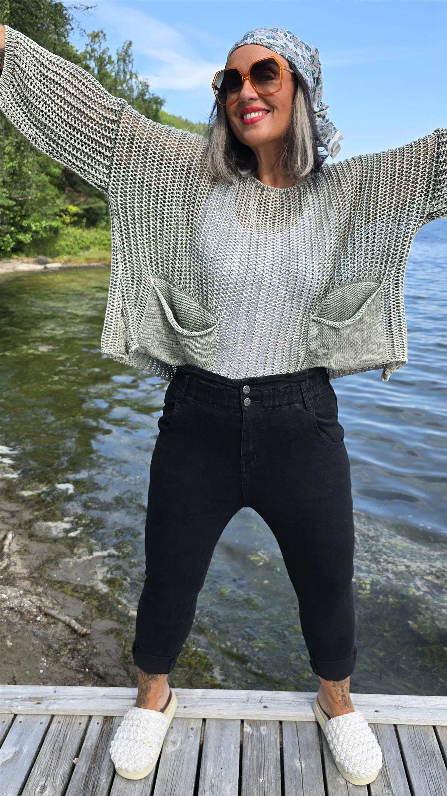 Modellen er 168 cm og er str 40 oppe, 42 nede. Har på sig str 40