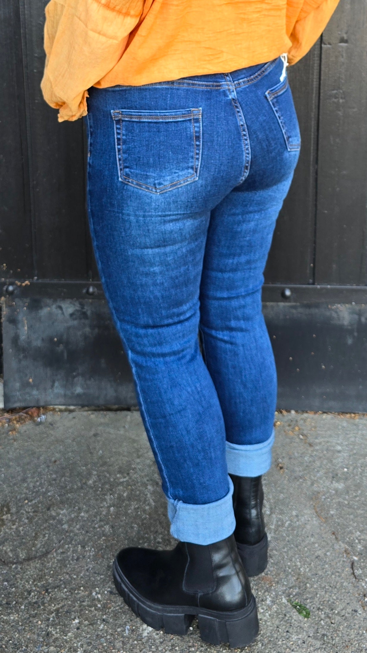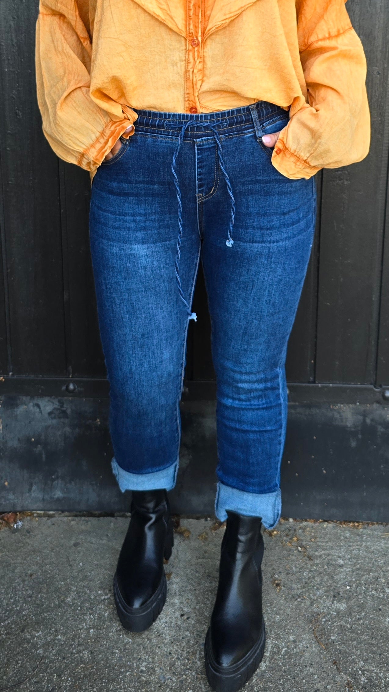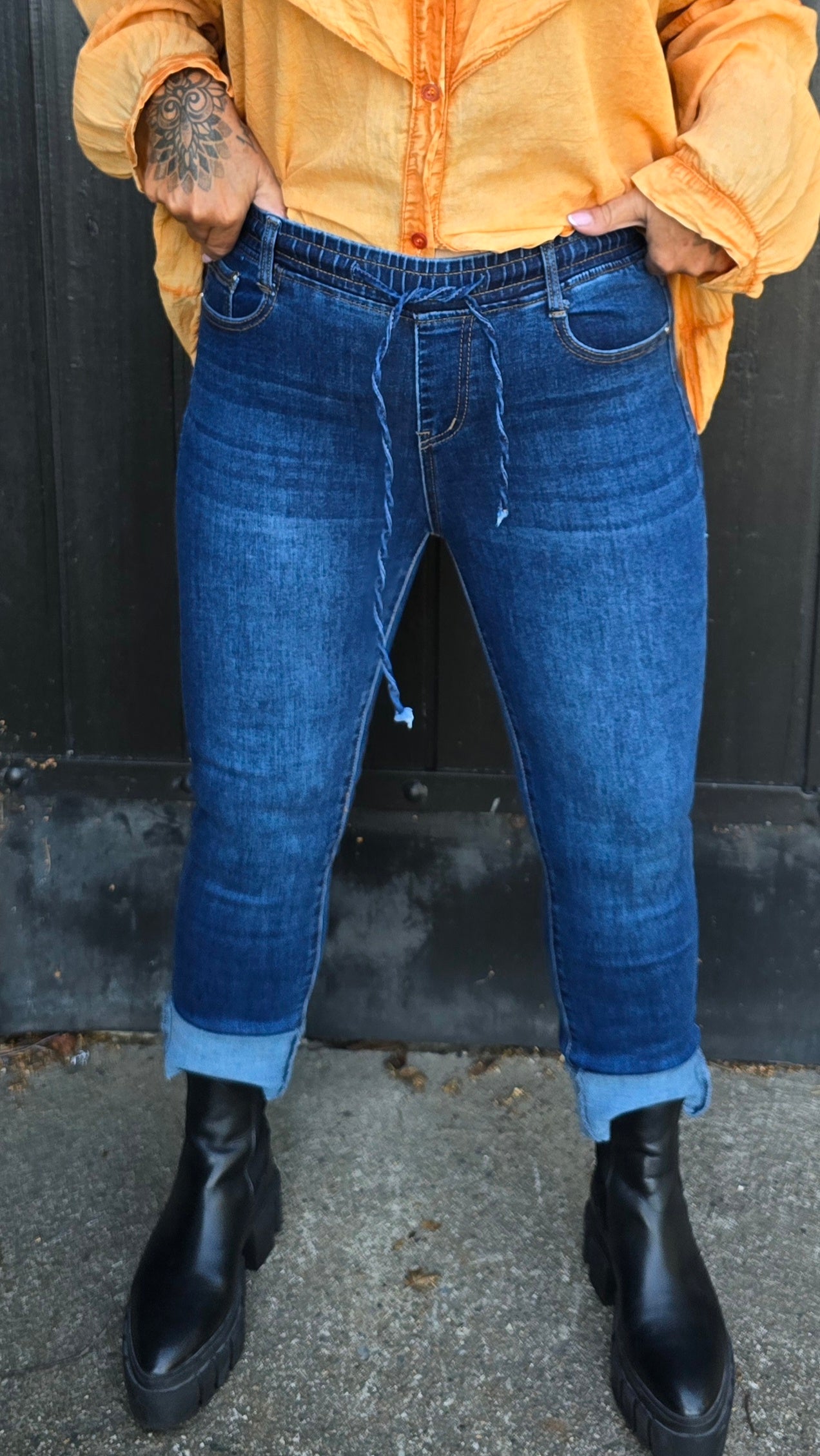 Jeans med strikk och snöring I midjan. Lommer I sidan och bak. Skön stretch. Normal I str men vill man ha den lösare på ta en str större.