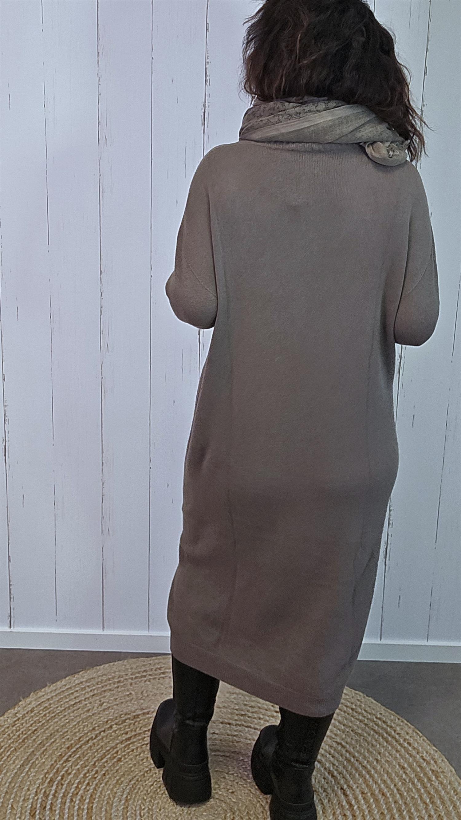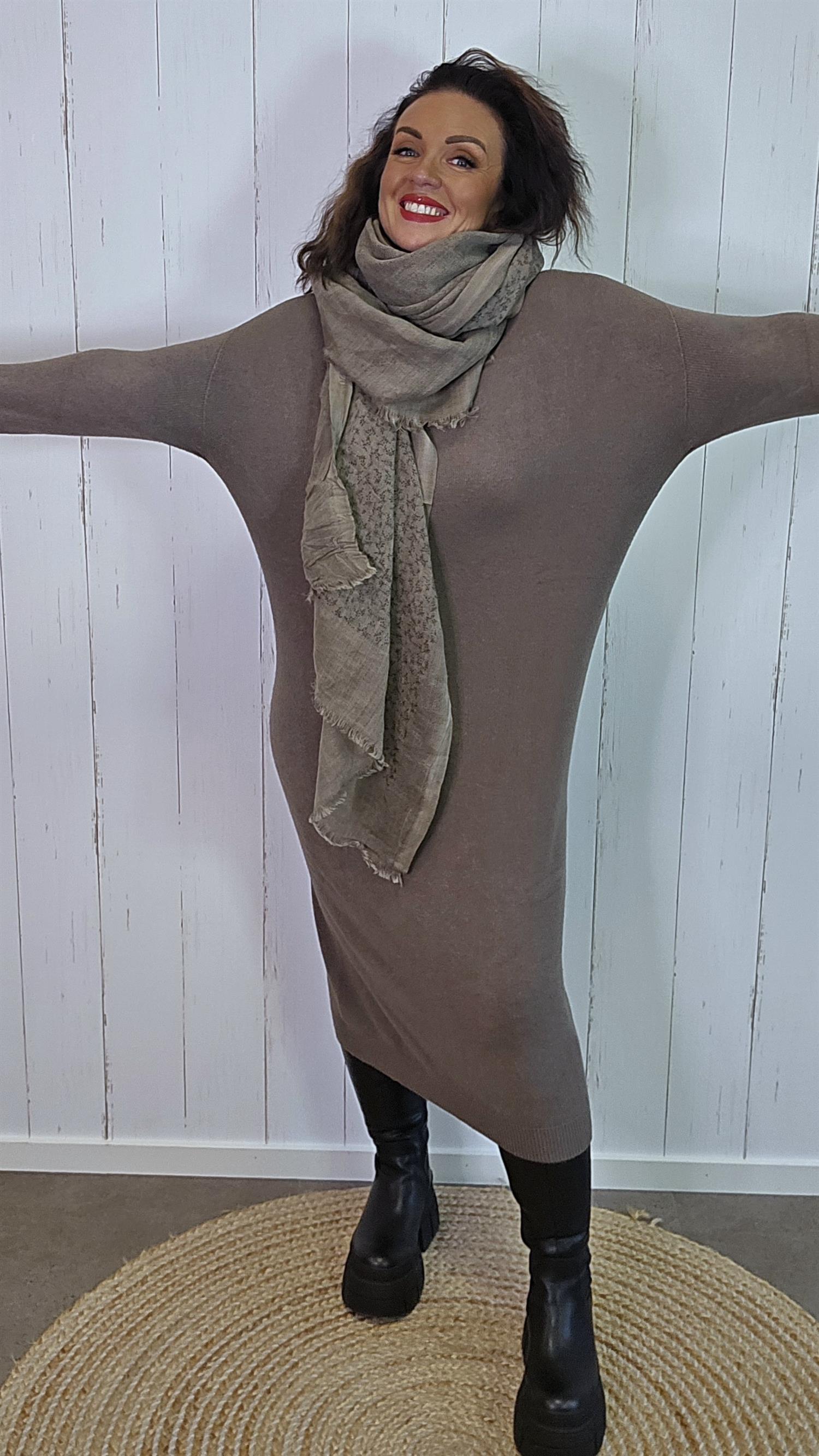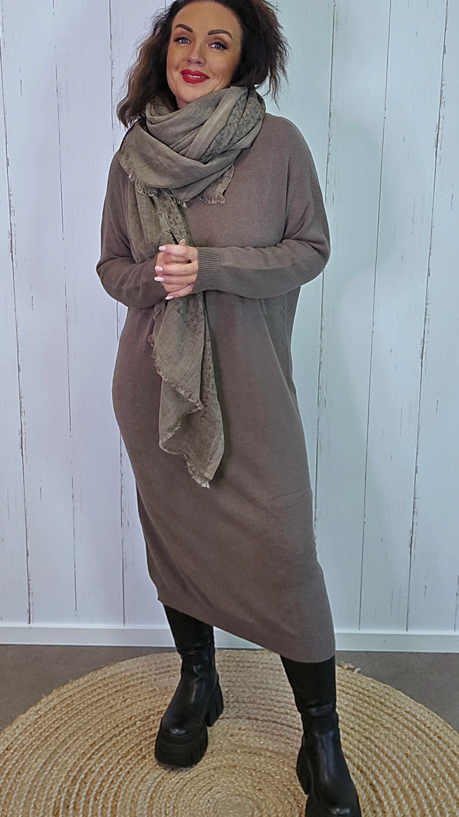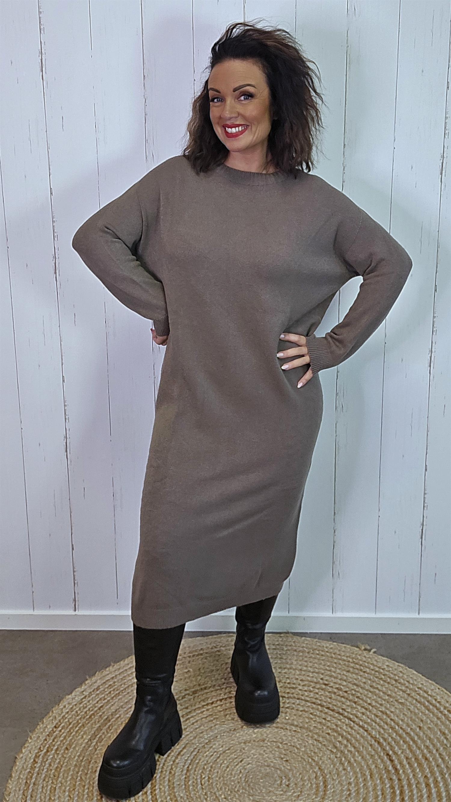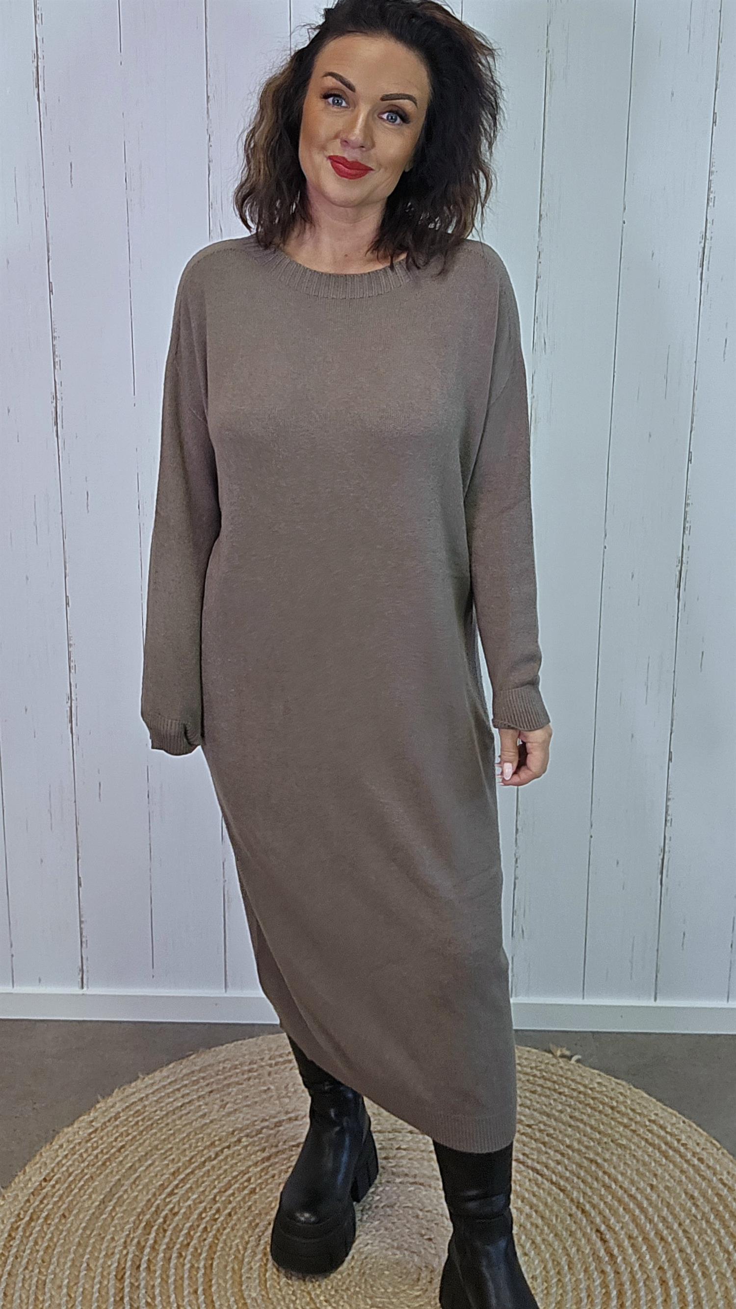 En tidløs og behagelig strikket midikjole i myk kvalitet med hele 52 % viskose. Modellen har lange ermer med bred kant, rund hals med ribbdetalj og en flatterende fasong med god plass og komfort. Lengden gjør den perfekt både til hverdags og mer pyntede anledninger, samtidig som den er enkel å style etter sesong.