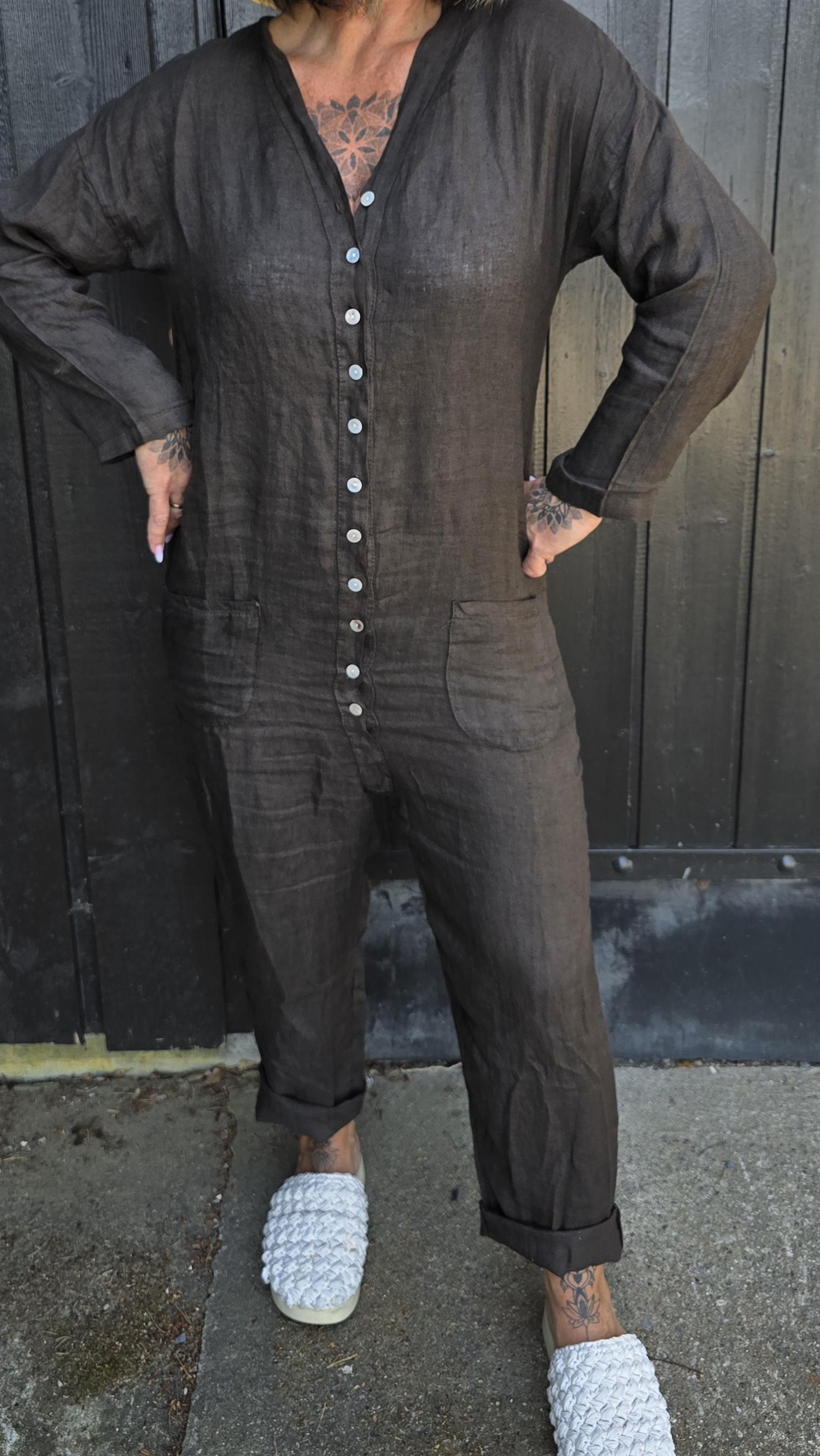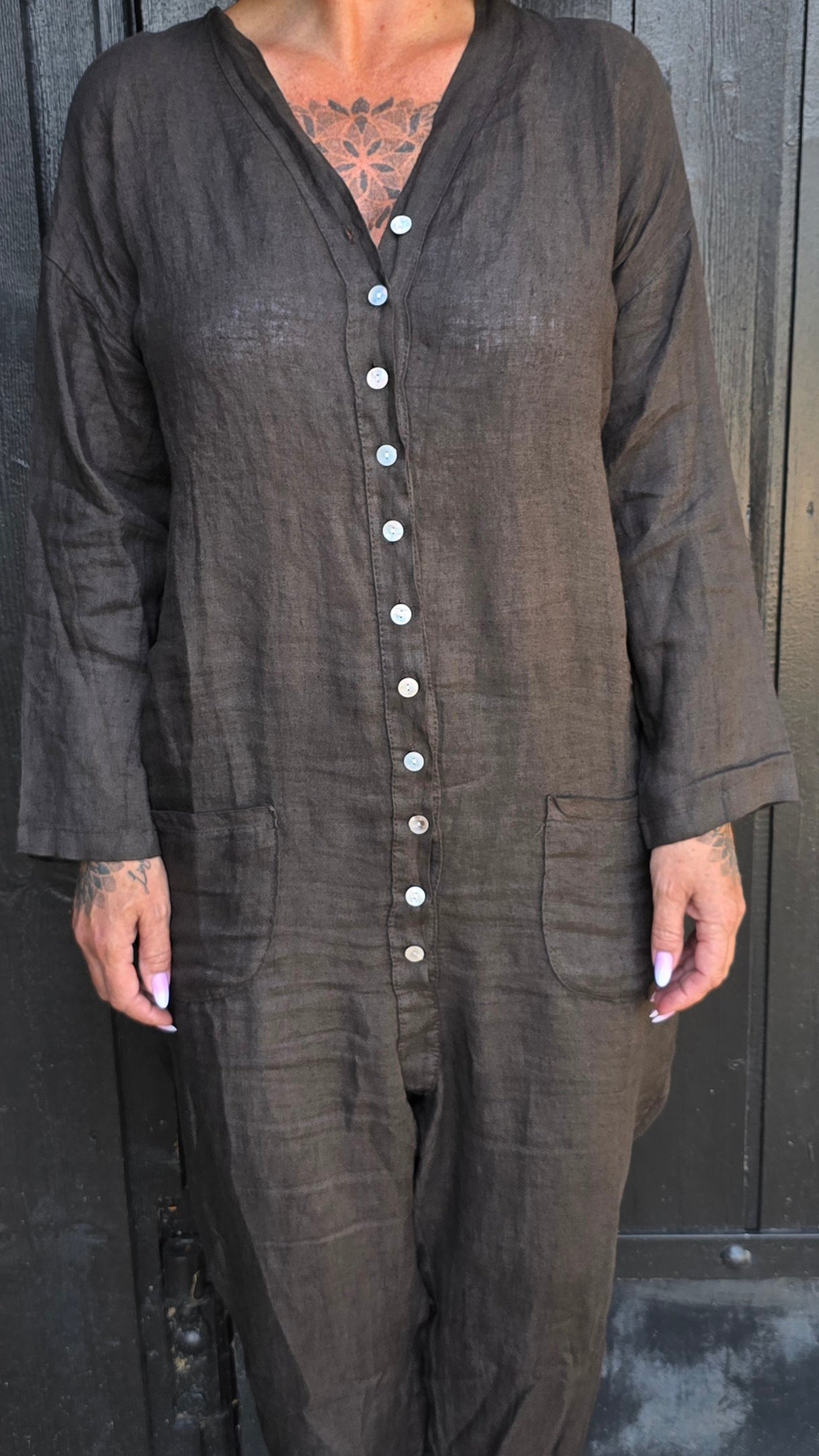 Härlig jumpsuit I lin med knappar I front. Lommer fram och bak. Långa armar. Rak modell.