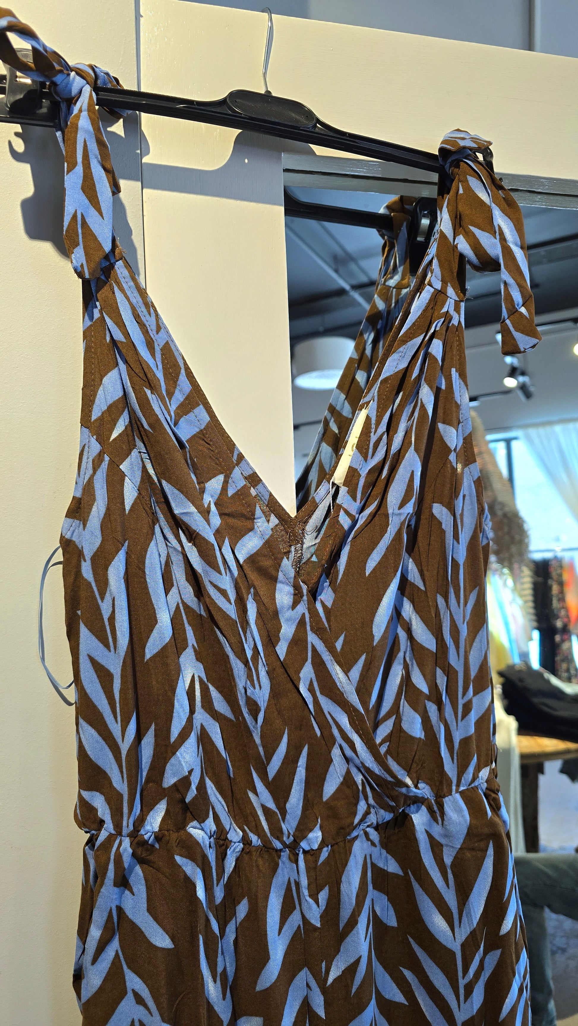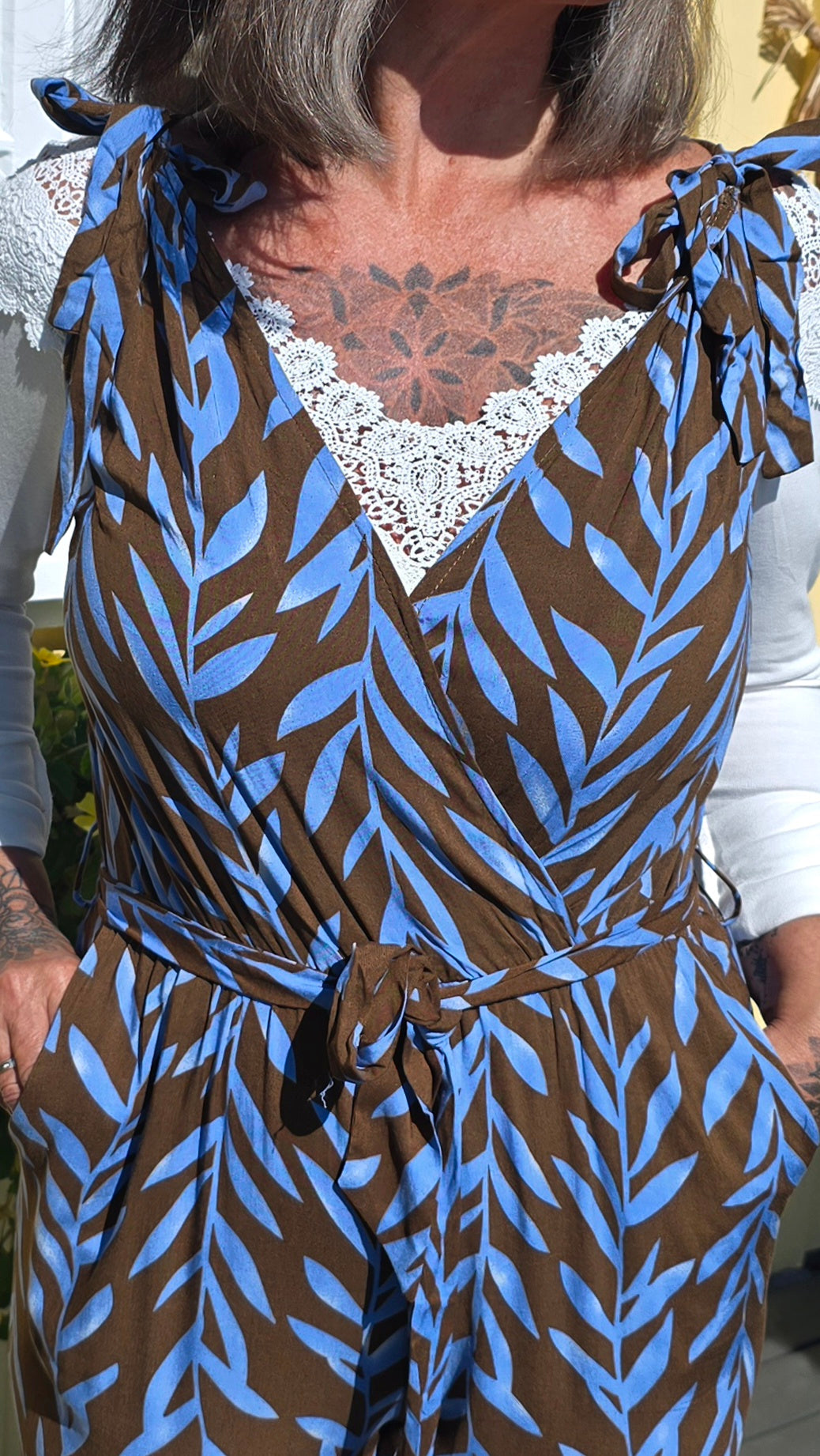 Jumpsuit med snyggt print I brunt och blått. Den har omlott I front med en tryckknapp. Strikk I midjan. Lommer I sidan. Regulerbara skulderremmar. Knyte bälte i midjan.
